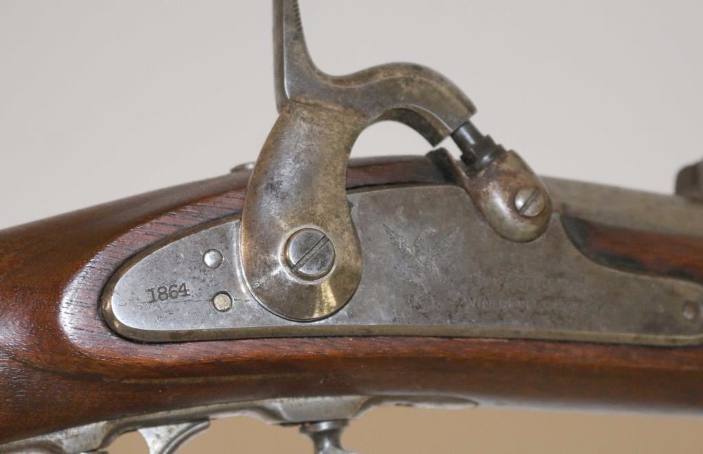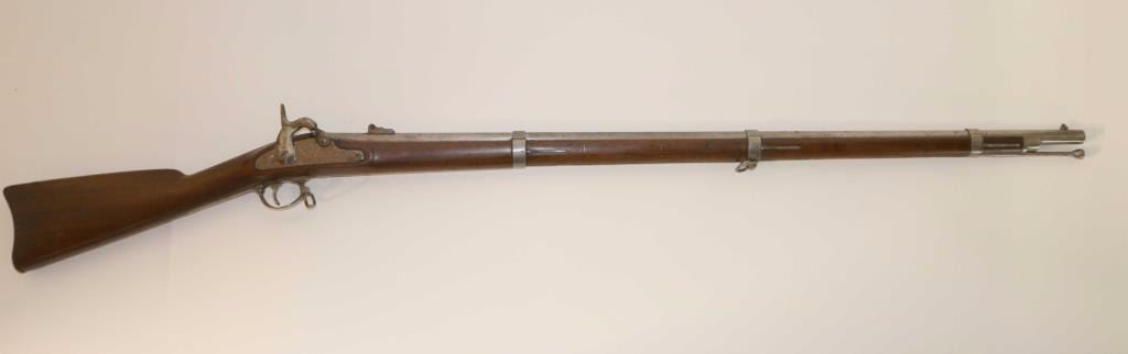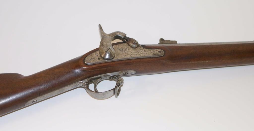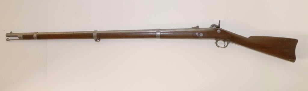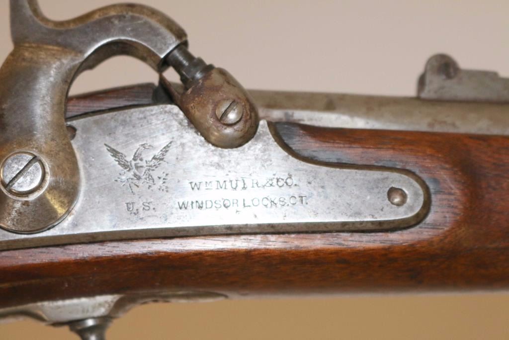 Civil war contract percussion rifled musket chambered for .58 caliber ammunition, circa 1864. Features a 39.5" barrel, blade front sight, double folding leaf rear sight, three barrel bands, swelled tulip tip ramrod, sling swivels, iron furniture, smooth trigger, checkerd hammer spur, replaced nipple, and one piece full-length walnut stock with metal buttplate. Markings: Lock "1864 Eagle/U.S. WMMUIR & CO./WINDSOR LOCKS,CT" Barrel "1865 65 V/P/Eagle Head(appears restamped) Buttplate "U.S." Rifle is predominately in-the-white showing little surface rust or pitting. Action performs well, bore appears clear and wood stocks shows a circular repair on the left side under the rear sight & a 1/2" hairline crack extending from the upper tang.