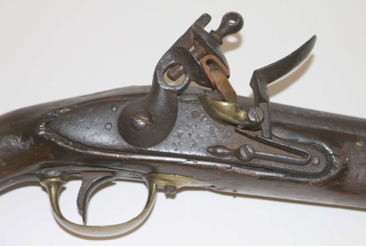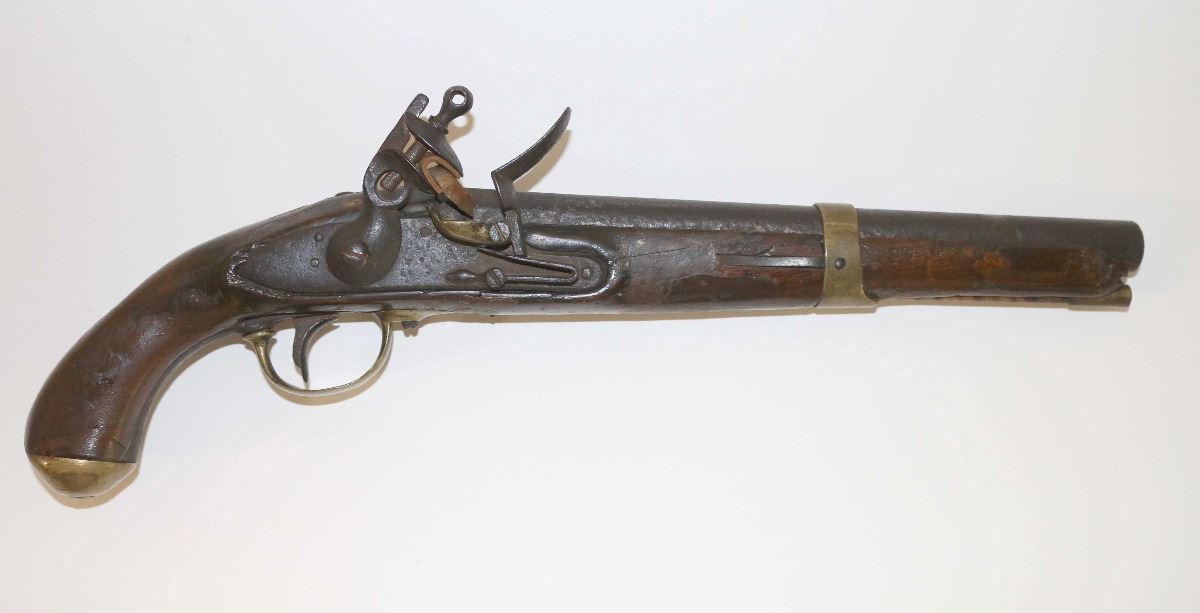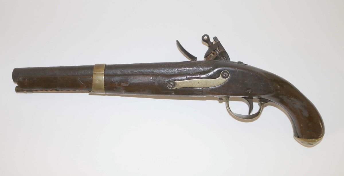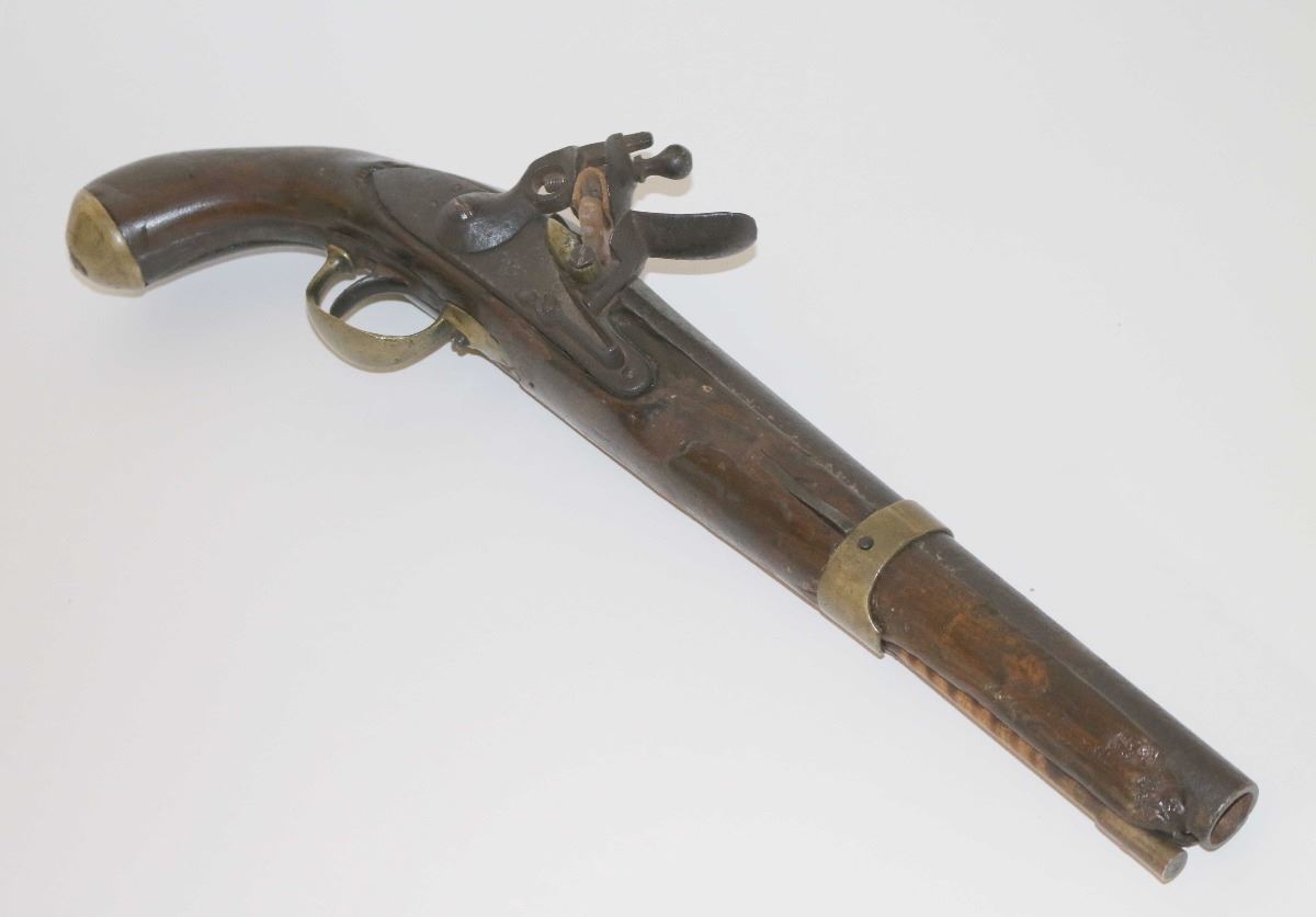 Unsigned flintlock pistol with an approximate .70 cal bore. Features a 11 3/4" iron barrel, wood ram rod with brass tip, iron lock, and one-piece wood stock. The iron surfaces of the pistol bear a dark patina, the brass surfaces have a well aged patina and the wood stock has been extensively repaired.