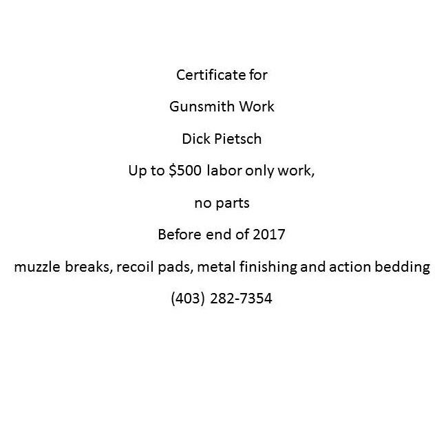 Dick Pietsch has generously donated up to $500 of gunsmith work to SCI Calgary. The choice of work is yours and the certificate can be redeemed anytime up to the end of end of 2017.