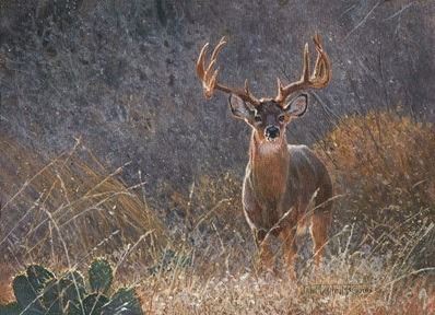 “TEXAS TROPHY” is an original 9 x 12 Acrylic on canvas - framed in a rustic crackled antique and gold frame. The painting depicts a monster Texas whitetail with mesquite trees in early winter as the background, which compliments the color of the whitetail. And of course, Jan added some cactus to complete the Texas theme. One of the “fun things” is that each painting will have the OTF logo hidden some-where in the painting! Jan Martin McGuire has been chosen to be the Artist Ambassador for OTF; as such she will paint a series of paintings over the next several years, which will also be put into print to raise money for OTF. OTF thanks Jan Martin McGuire for this 100% donation. http://www.mcguireandhines.com