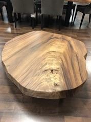 This beautiful handmade cocktail table made from one solid piece of parota wood with a natural wood color has been hand worked and kiln-dried and protected by polyurethane finish of the highest quality. The polished brass four cylinder base completes its modern style. OTF thanks Parota Furniture Collection for this 100% donation. http://perotafurniturecollection.com