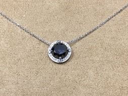 Ladies diamond necklace with 1 approximately 2.50ct black diamond, round brilliant cut, set with .25ct total weight of round brilliant cut diamonds, SI1, color G, all set in custom 14K white gold mounting and chain. OTF thanks Lisa Dubberley from Beasley's Jewelry for this 100% donation. http://beasleysfinejewelry.com