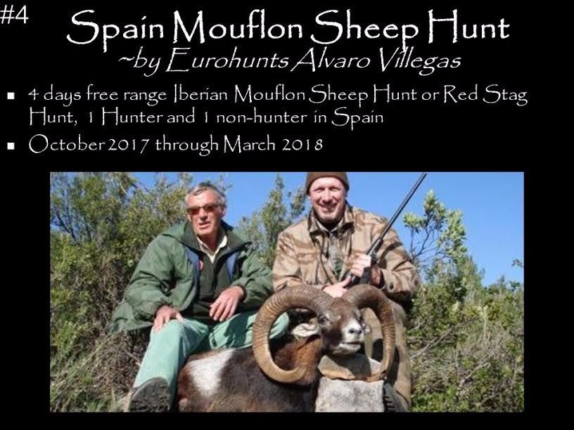 Spain Mouflon Sheep Hunt. 4 days free range Iberian Mouflon Sheep for one hunter. Hunt in Spain with Mountain PH Specialist Alvaro Villegas. Extra fees; hunting license $150, insurance $100 and 21% on hunt value (T.A.X.). Included are accommodations, travel and trophy fees. Additional persons $275 each and additional hunters available $675.00 each. Hunt may be taken from October 2017 through March 2018 or fall 2018to spring 2019. Donated by Eurohunts – Alvaro Villegas Contact number: +34 670908655 Infoeurohunts.es