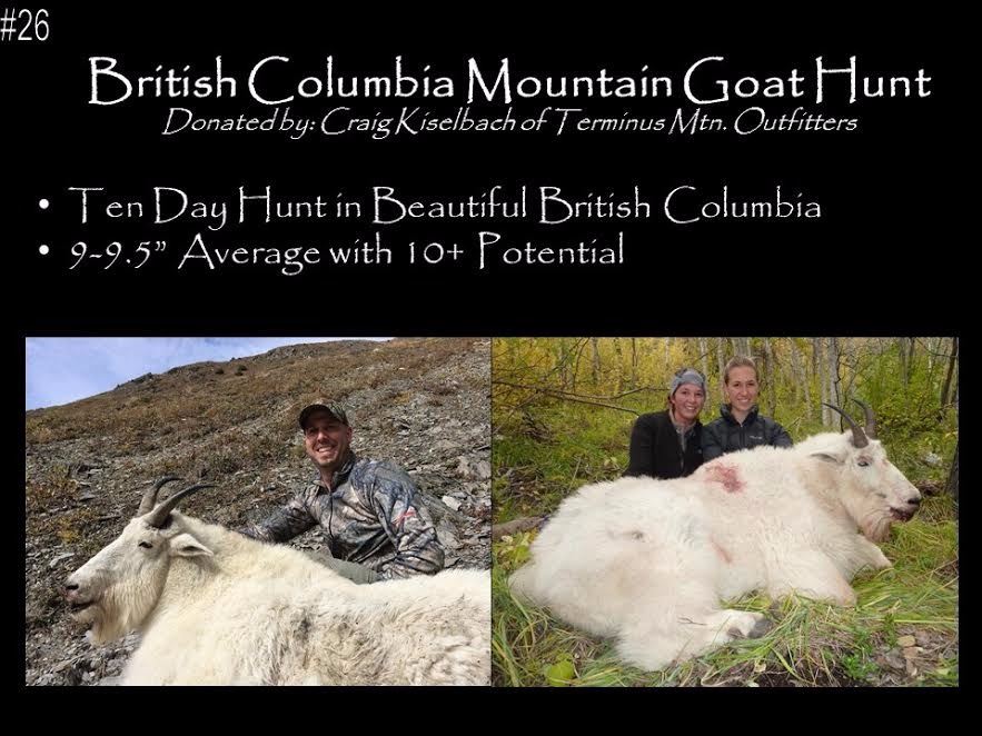 Mountain Goat Hunt in British Columbia. 10 – Day Mountain Goat hunt in beautiful British Columbia. Terminus Mountain Outfitters has a very healthy mountain goat population. The Billie’s at this time of year are in their winter coats, which makes a beautiful life-size mount. We typically average 9-9.5 inches, but have taken many goats over 10”! Be prepared to do some climbing to access the goats and on occasion it is required to wait for the goats too feed in an area, which you can access. Although there is no regulation on goats, Terminus Mountain Outfitters encourages harvesting only Billie’s. Donated by Craig Kiselbach