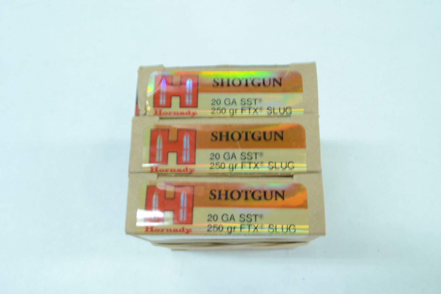Lot 188 3 BOXES 5 ROUNDS HORNADY 20GA 250GR 2 3/4” FTX SLUG