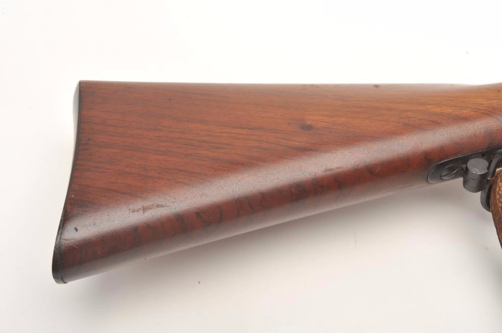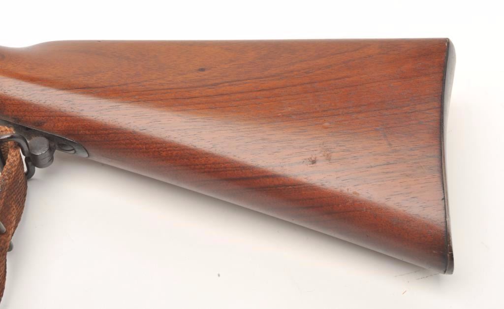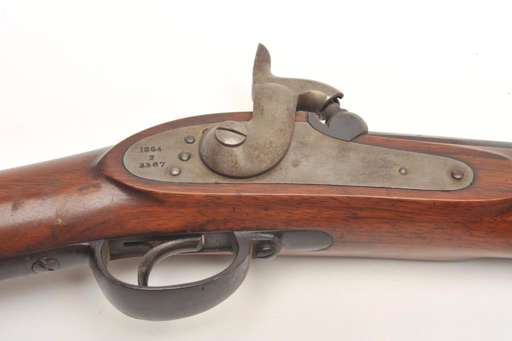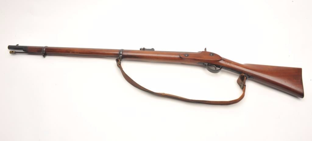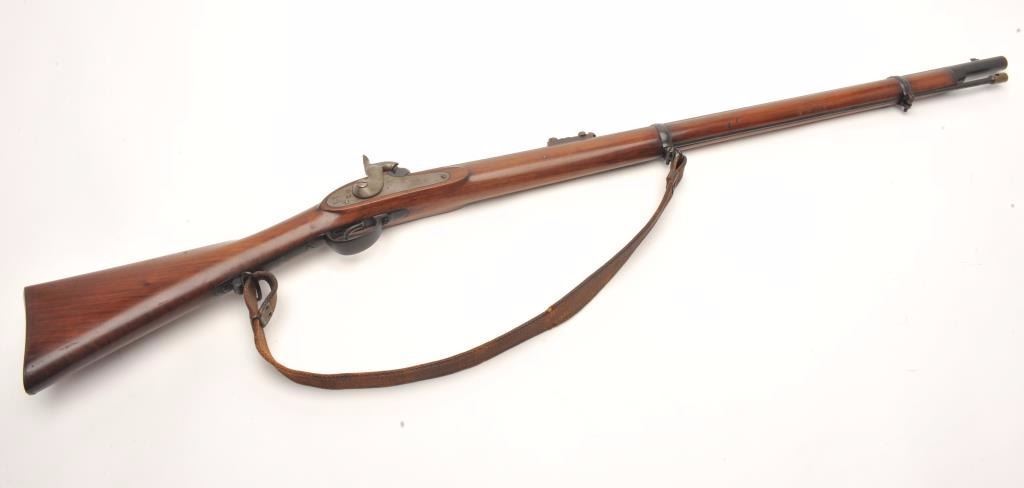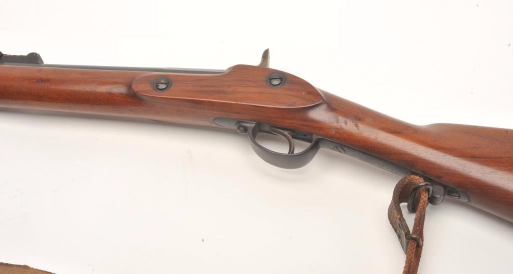 European percussion rifle, the type imported to the U.S. during the Civil War; .58 caliber, 33” barrel, blued and case hardened finish, wood stock, iron ramrod, woven sling, 7307 (lockplate dated 1864). This gun is in overall very good condition with original blue mixed with brown patina on the barre3l and traces of original case colors on the lockplate and hammer. The wood is very good; no maker marks visible. (Antique).Est.: $300-$600.