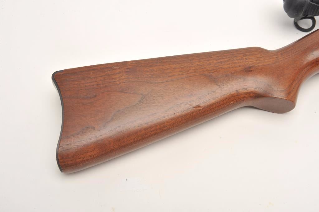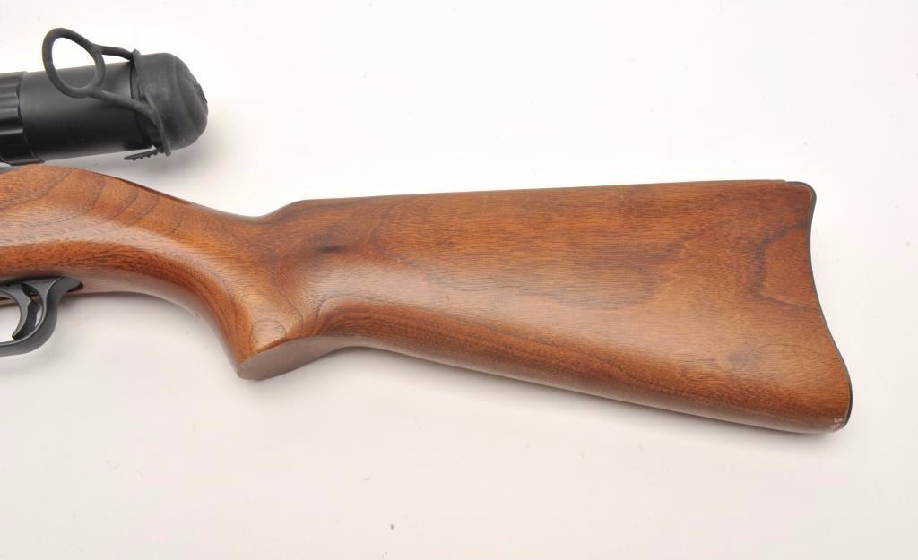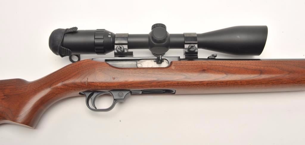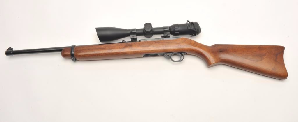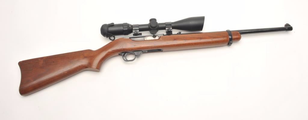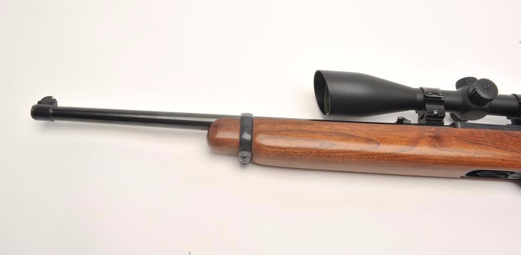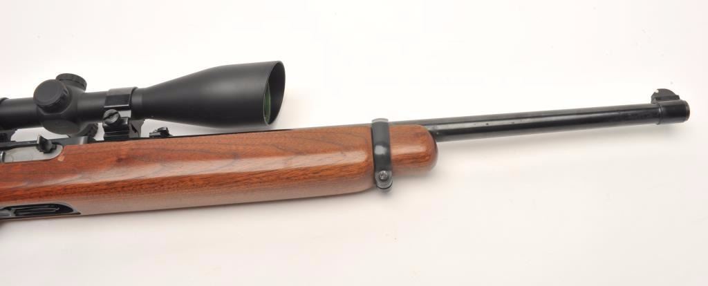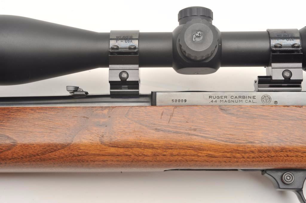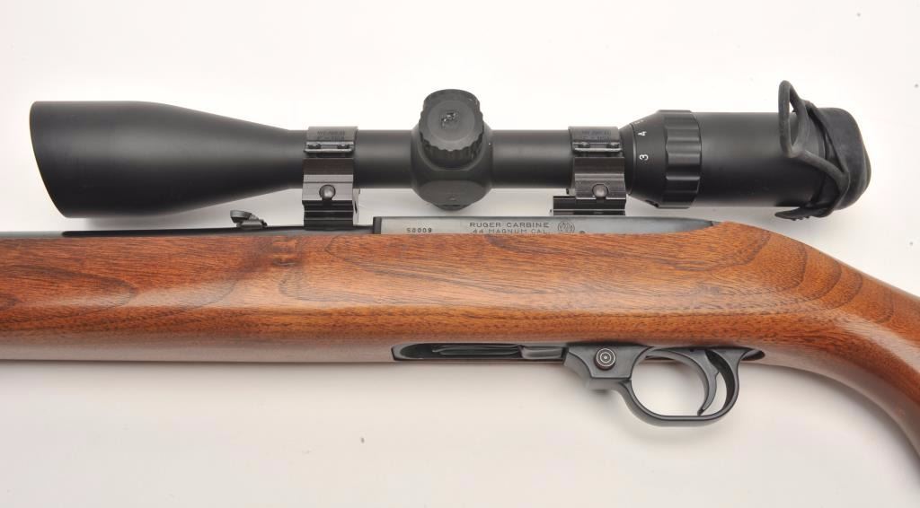 Ruger semi-automatic carbine, .44 Magnum caliber, 18.5” barrel, black finish, wood stock, S/N 50009, mounted with a Nikko Stirling Platinum 3-10x42 Nightester scope with clear optics. This carbine is inoverall very good to fine condition with a fine bore, crisp action, sharp markings and very good + stock. (Modern/PPT). Est.: $300-$600.