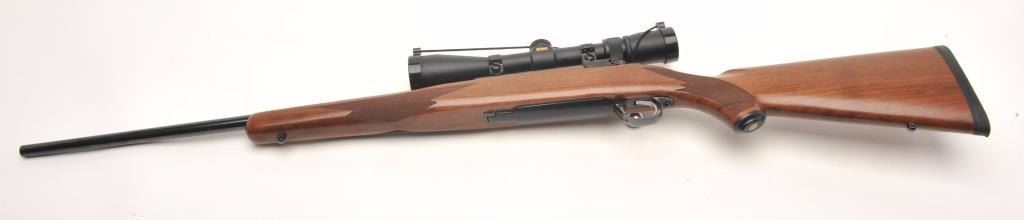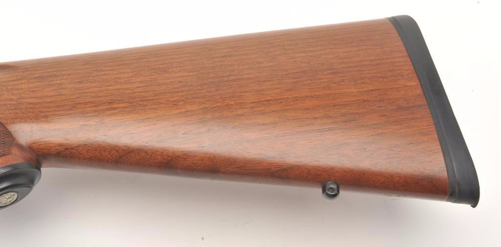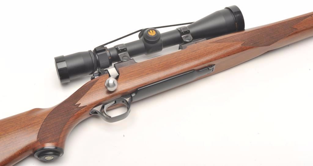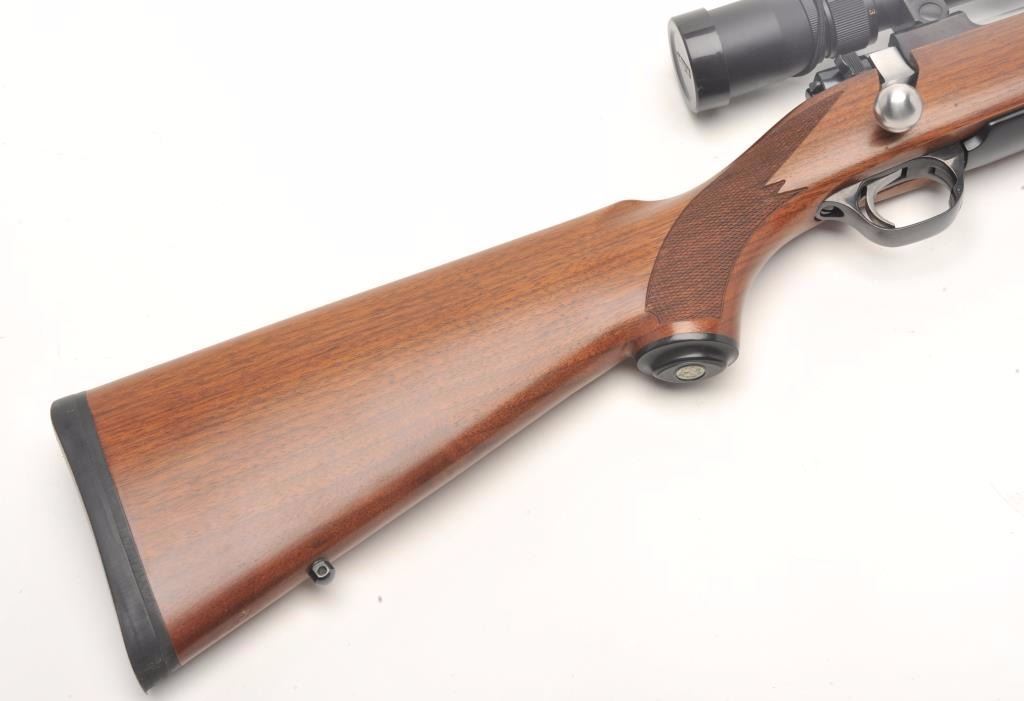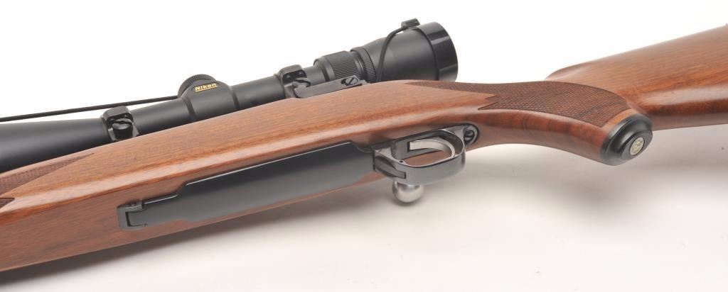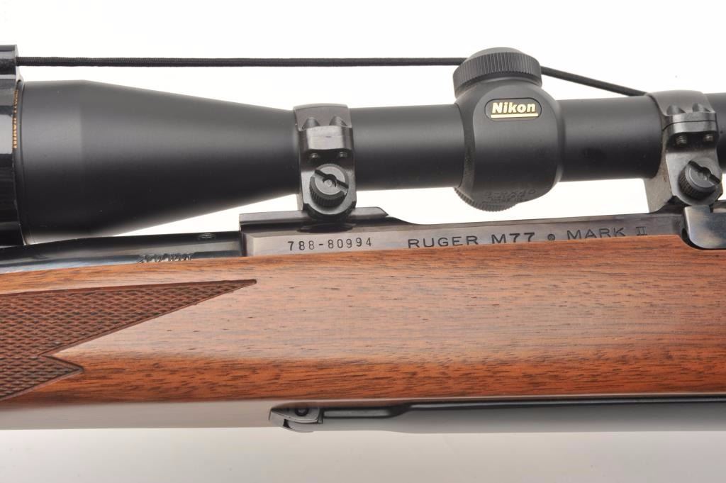 Ruger Model 77 MK II bolt action rifle, .270 Win. caliber, 22” barrel, black finish, checkered wood stock, S/N 788-80994, mounted with a Nikon ProStaff scope with crisp optics. This gun is in overall fine condition displaying the majority of its original finish, very good to fine bore, crisp action, sharp markings and fine stock. (Modern/PPT). Est.: $350-$700.