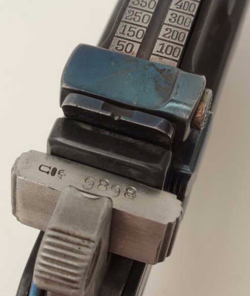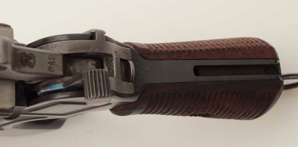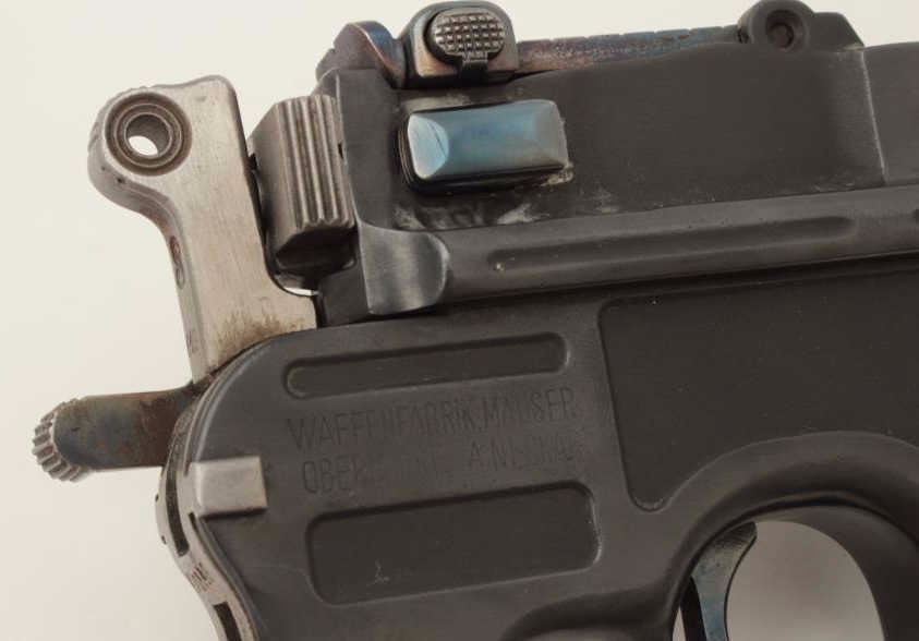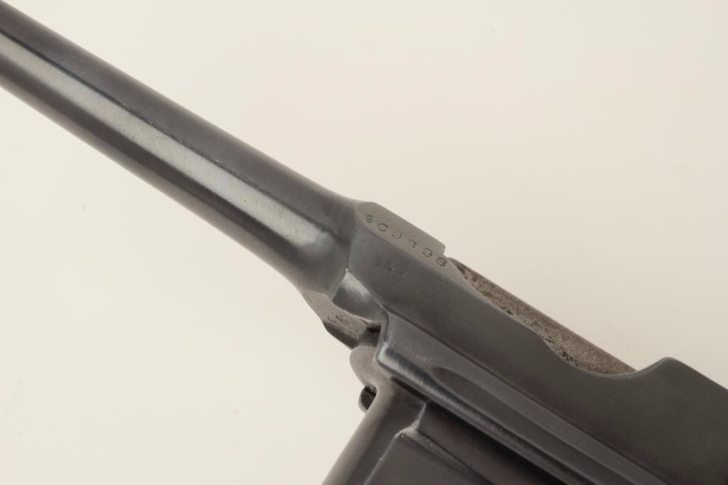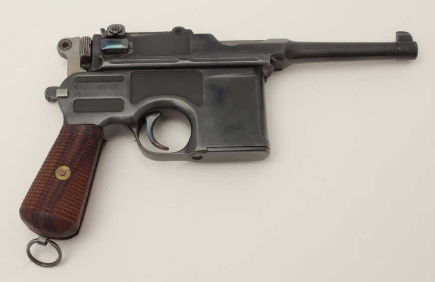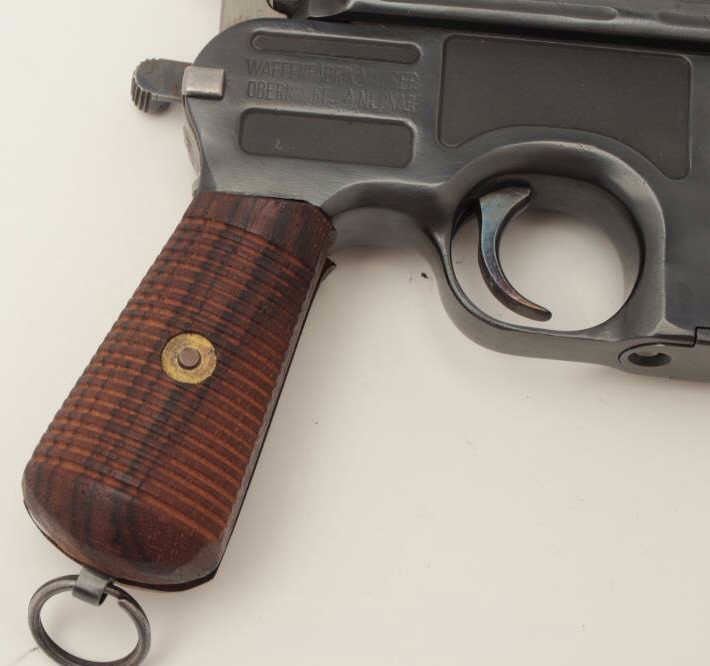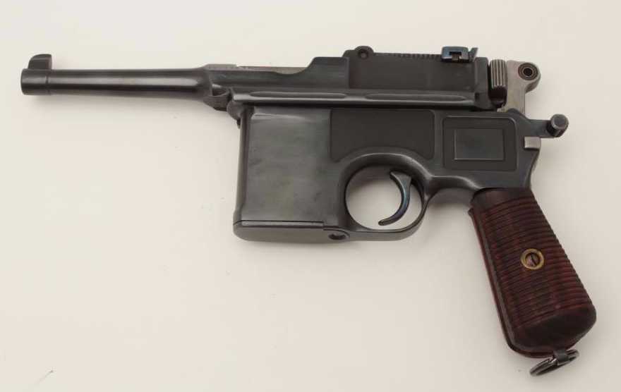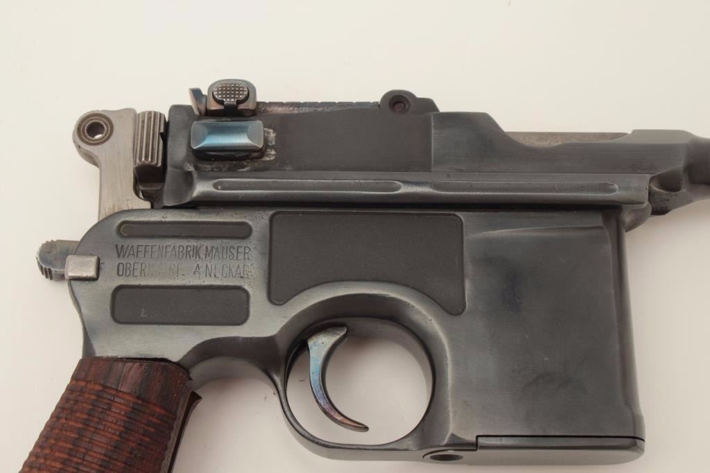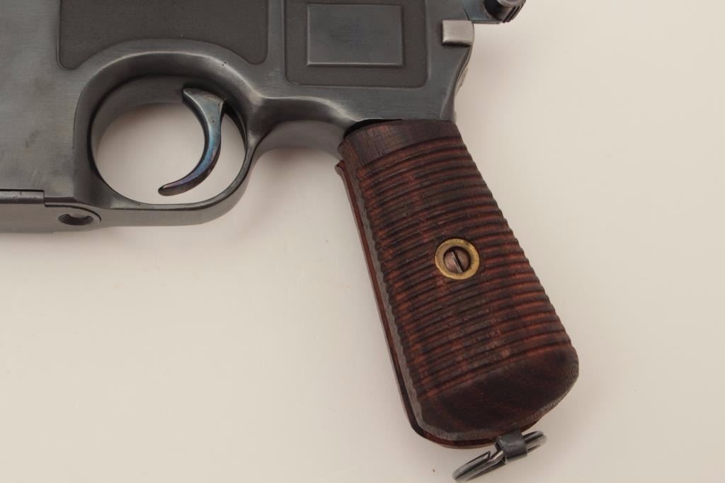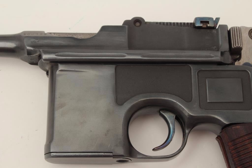 Mauser Model C96 “bolo” semi-automatic pistol, 9mm caliber, 4” barrel, re-blued finish, wood grips, S/N 470649 (action block and hammer), S/N 469898 (frame, barrel assembly and bolt). This pistol is inoverall good condition as re-furbished with a good bore, crisp action and very good replacement grips. (C&R/PPT). Est.: $300-$600.