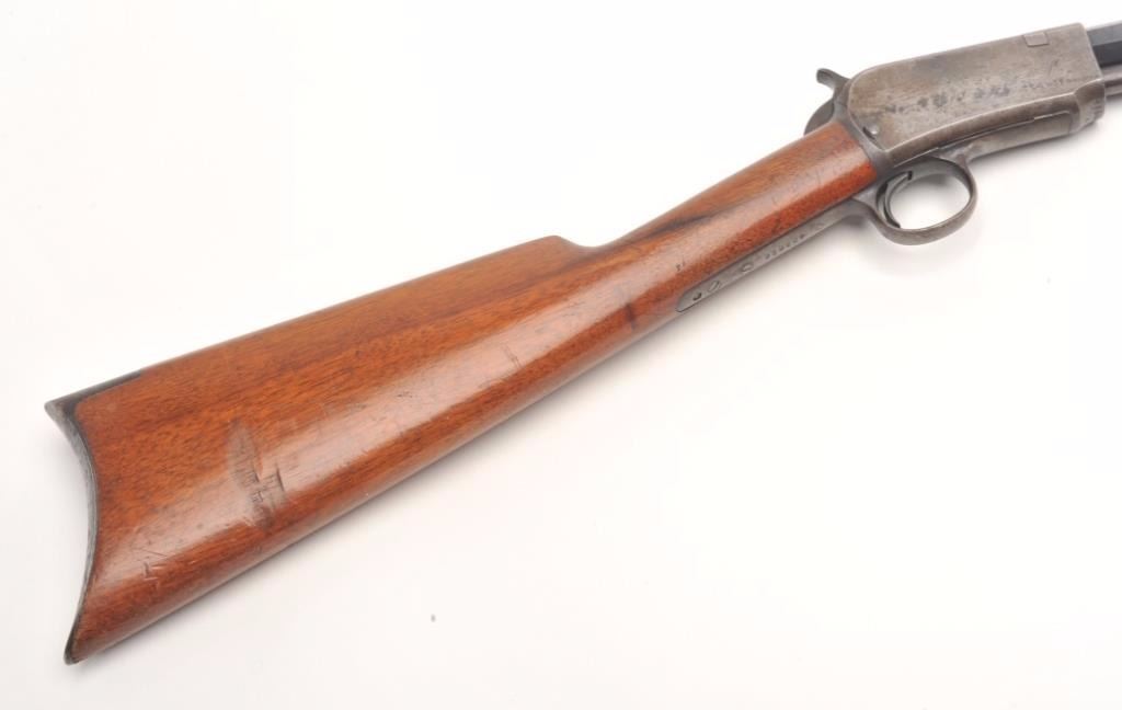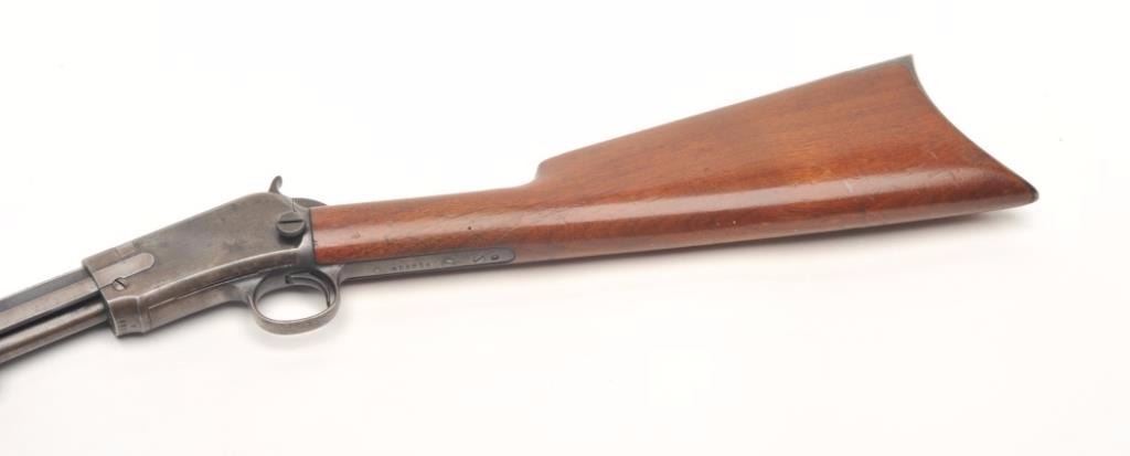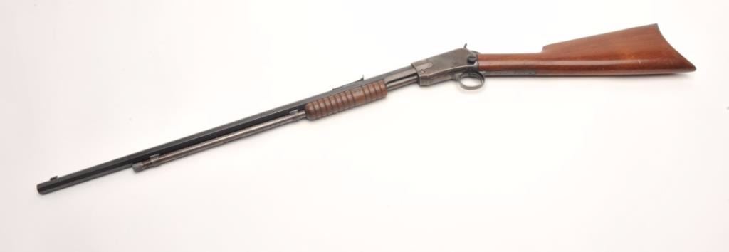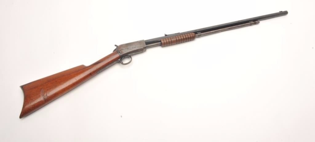 Winchester Model 1890 takedown pump rifle, .22 WRF caliber, serial #455896. The rifle is in very good overall condition with a 24” octagon barrel and ¾ magazine. The barrel retains a significant amount of its thinningblued finish with sharp edges and clear markings. The magazine has gone primarily to patina with light surface erosion and the receiver still shows muted blue finish, particularly in the protected areas. Thesmooth wood stocks are in very good condition showing moderate wear with small mars and bruising to the butt stock. The butt stock ends with a smooth metal crescent butt plate. The bore is poor, the action crisp andmarkings are sharp. (C+R) Est.: $300-$600.