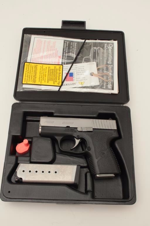 Kahr Arms Model PM9 DA semi-automatic pistol, 9mm caliber, 3” barrel, polymer frame, steel slide, S/N VC8346, in factory hard carry case with extra magazine and instructions. This gun is in overall fine condition showing minimal prior use. (Modern/PPT). Est.: $350-$700.
