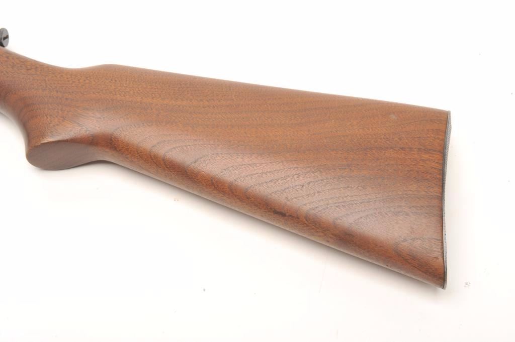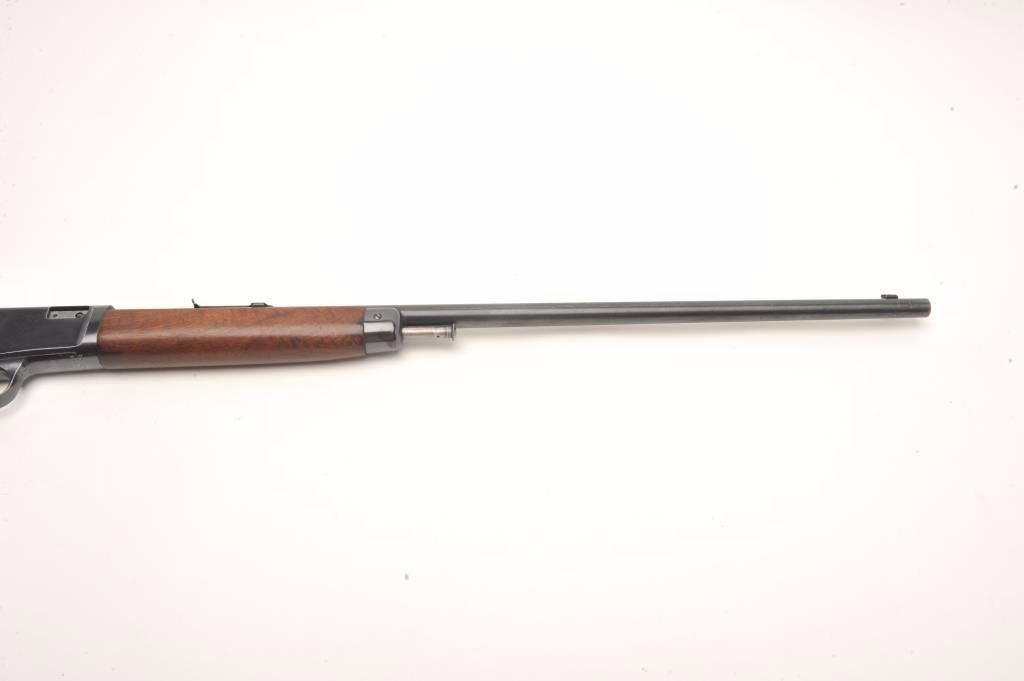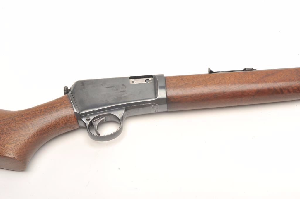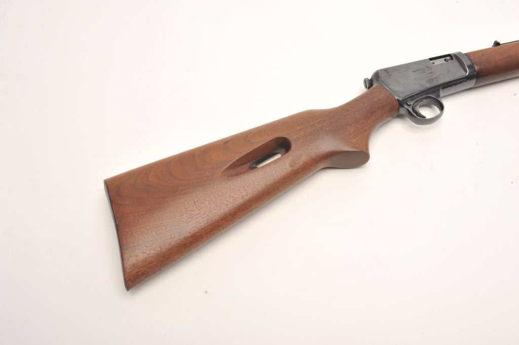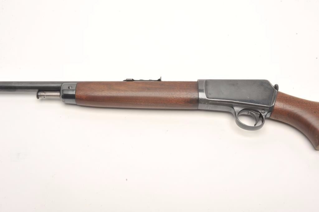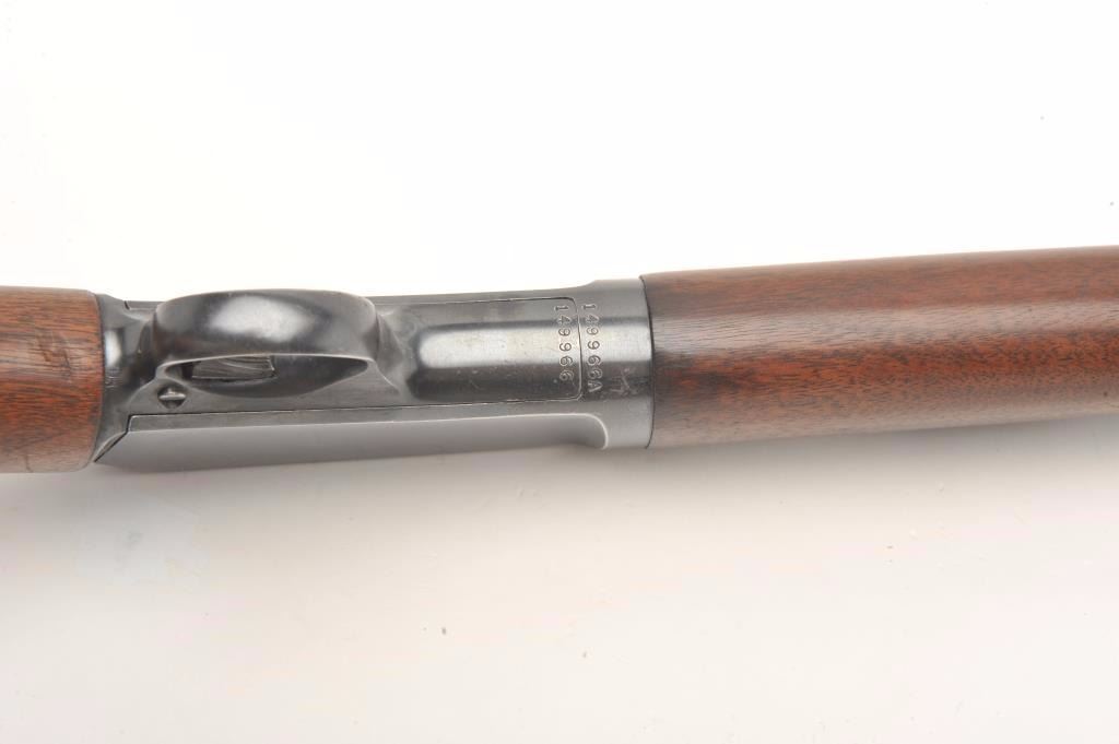 Winchester Model 63 semi-auto rifle, .22 Long Rifle caliber, serial #149966A. The rifle is in very good overall condition with a 23” round barrel. The barrel and receiver retain the majority of their blued finish with only storage marks noted. The receiver has several old, filled holes for a prior scope mount. The smooth wood stocks are in very good condition with small mars and handling marks. The butt stock ends with a checkeredsteel butt plate. The bore is very good, the action crisp and the markings are sharp. (Modern) Est.: $300-$600.