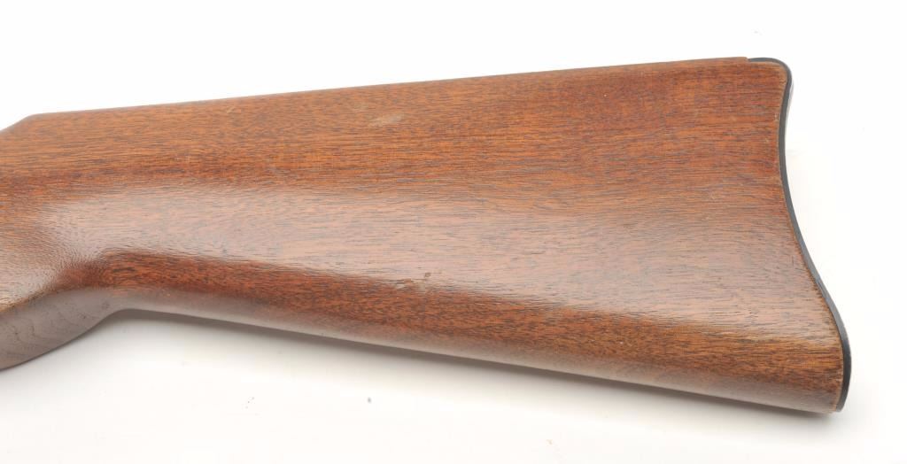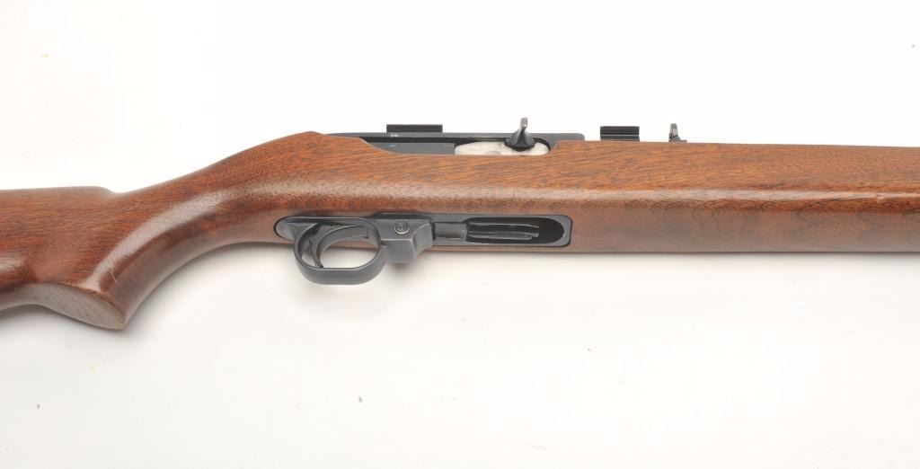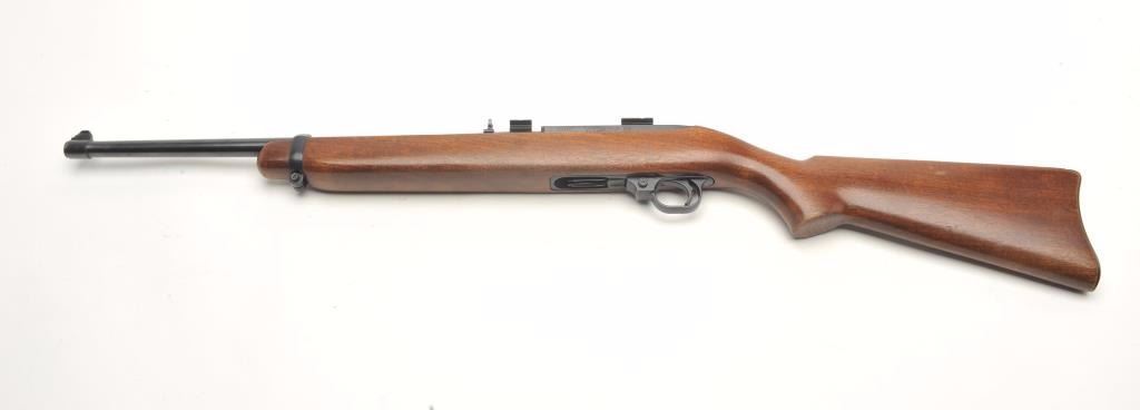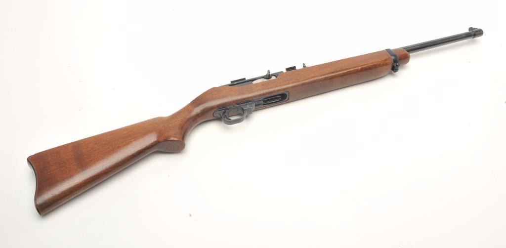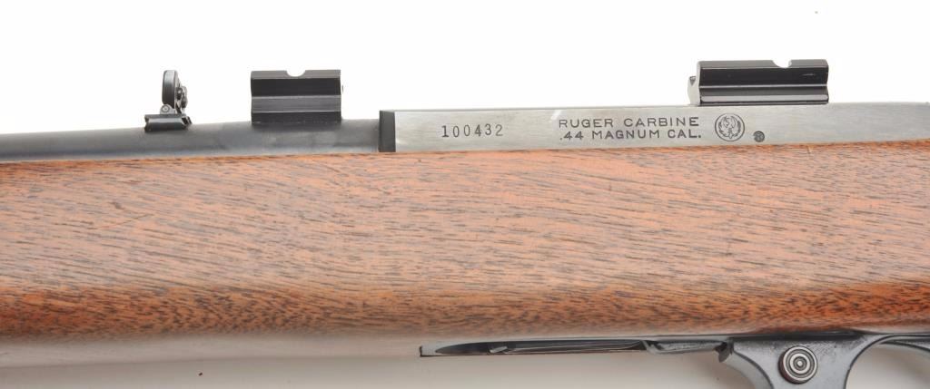 Ruger semi-automatic carbine, .44 Magnum caliber, 18.5” barrel, blued finish, wood stock, S/N 100432, in overall fine condition showing the majority of its original finish, very good to fine bore, crisp action andmarkings, very good to fine wood stock. (Modern/PPT). Est.: $300-$600.