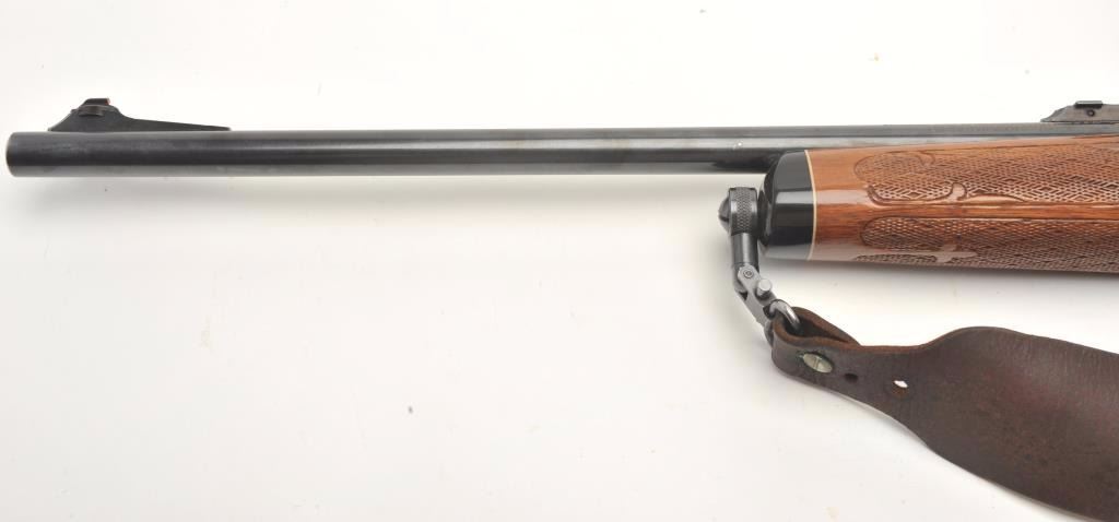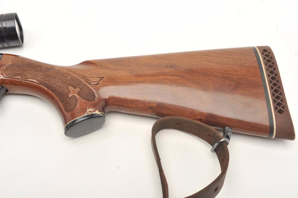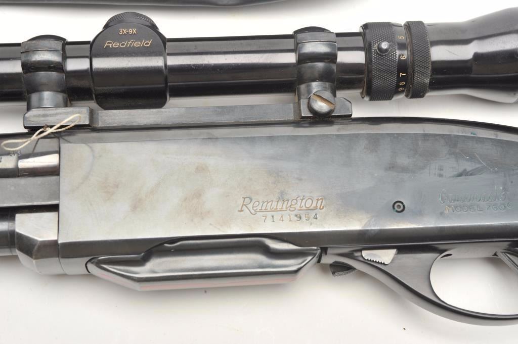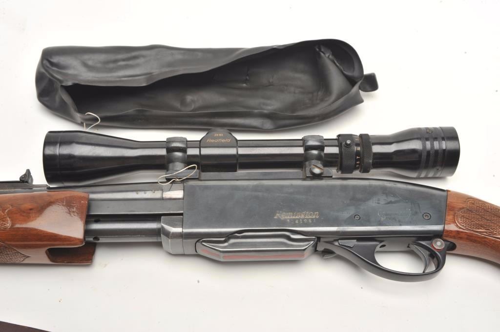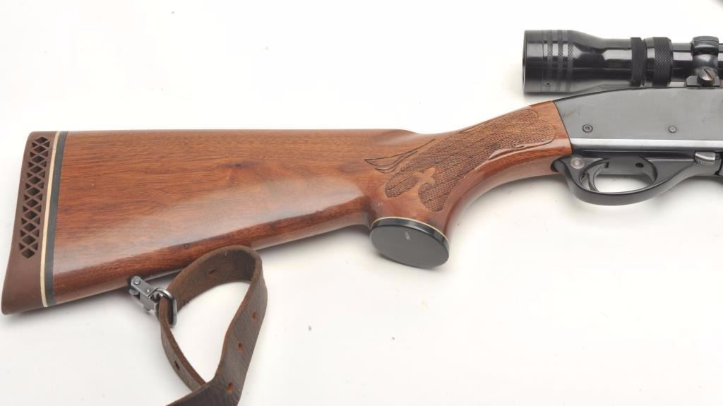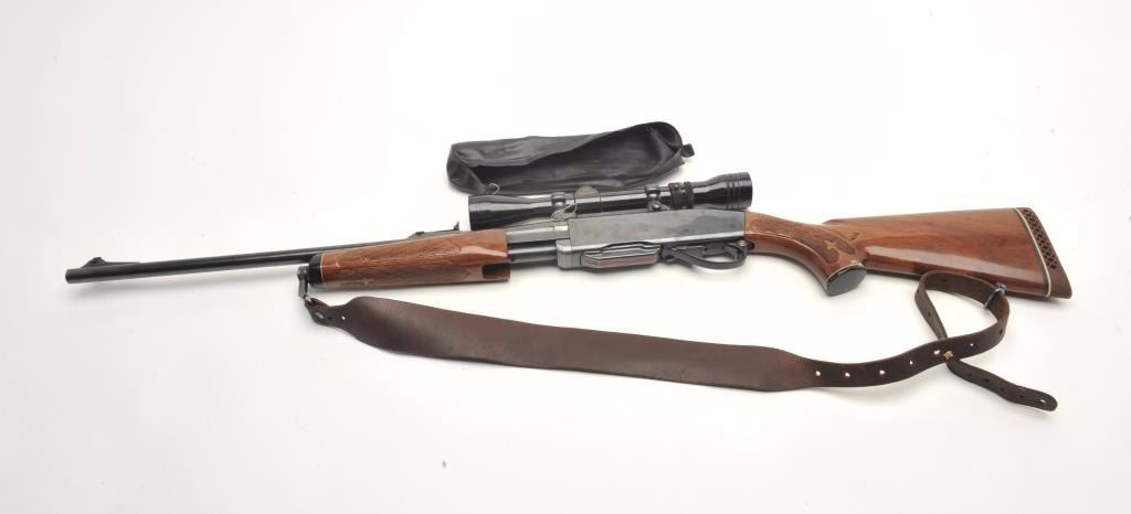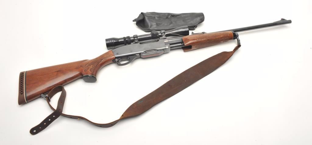Remington Woodmaster Model 760 pump action rifle, .30-06 SPRG caliber, 22” barrel, blued finish, wood stocks, leather sling and mounted with a Redfield 3X-9X scope displaying crisp optics, S/N 7141954, inoverall very good condition showing the majority of its original finish, very good bore, crisp action and markings; very good wood. (Modern/PPT). Est.: $300-$600.