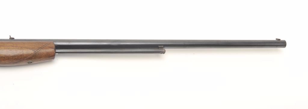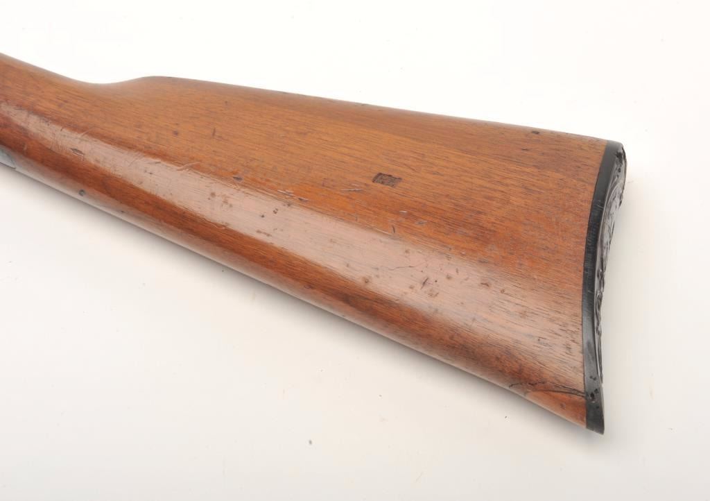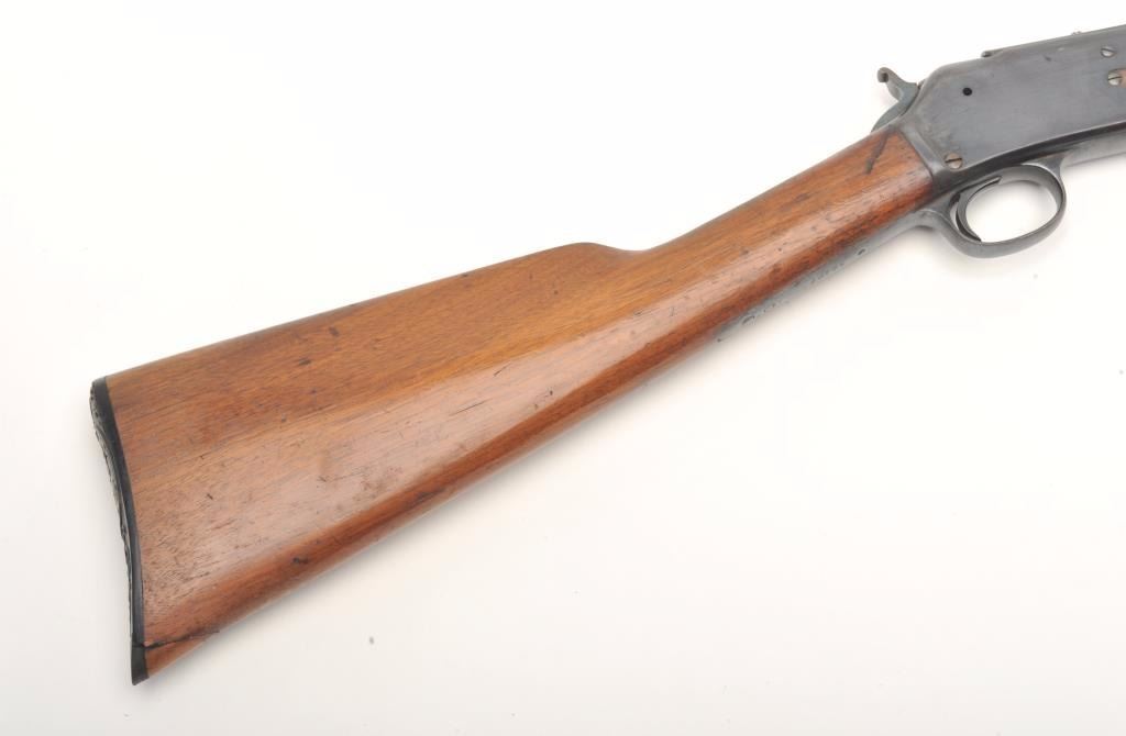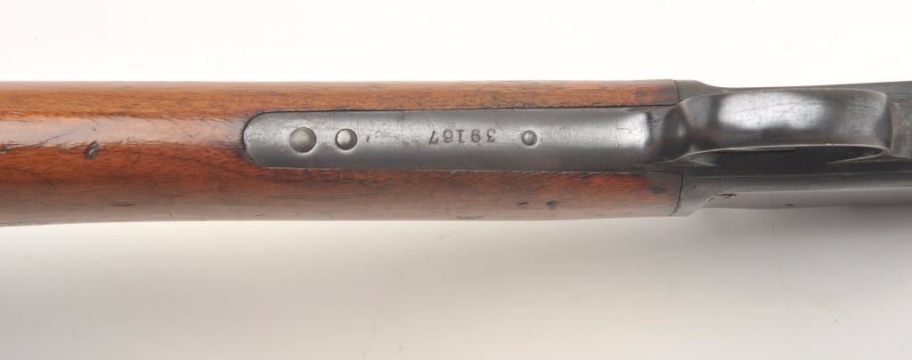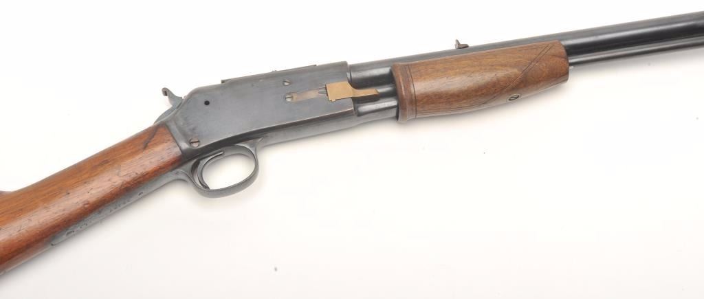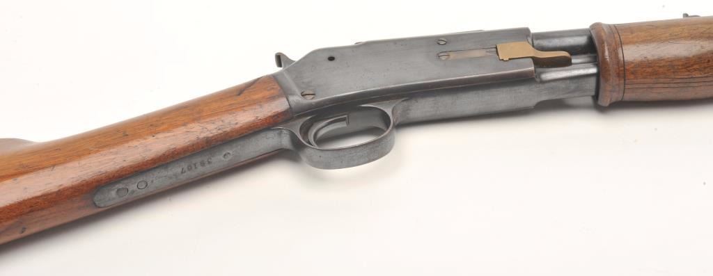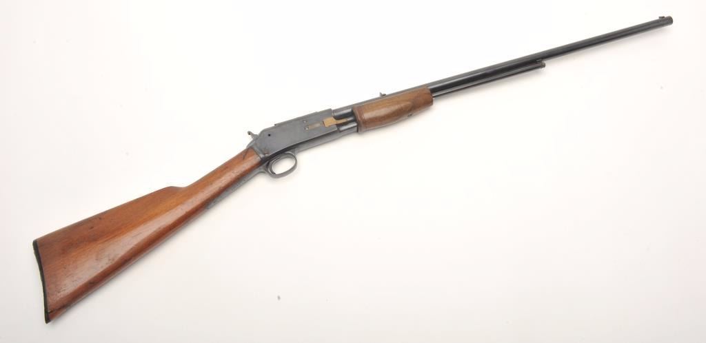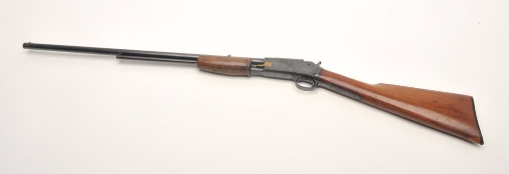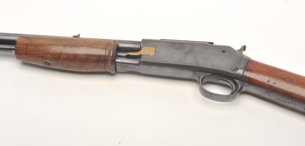 Colt Lightening pump rifle, .22 caliber, serial #39167. The rifle is in very good overall condition as re-finished. The 24” round barrel, ½ magazine and receiver all retain a significant amount of an old quality re-blue. The smooth wood stocks show moderate use with small mars, compressions and an old coat of varnish. The butt stock ends with a hard plastic butt plate with a small repair at the toe. The bore is fair,the action is crisp and markings are sharp. (C+R) Est.: $400-$800.