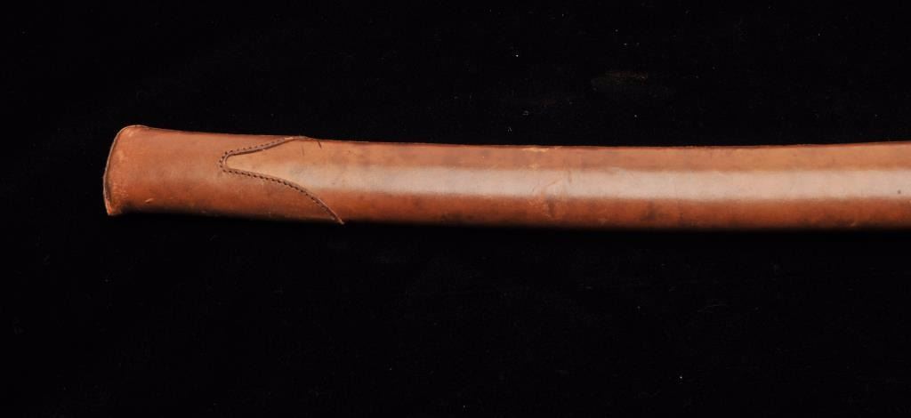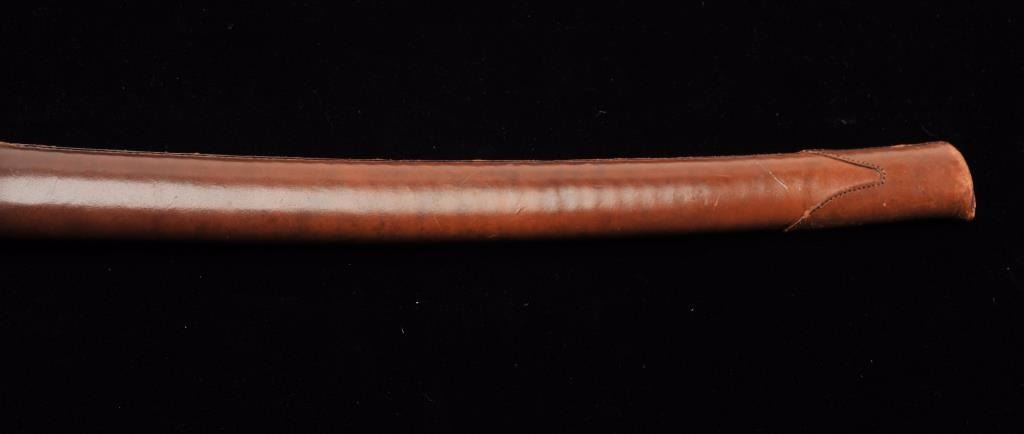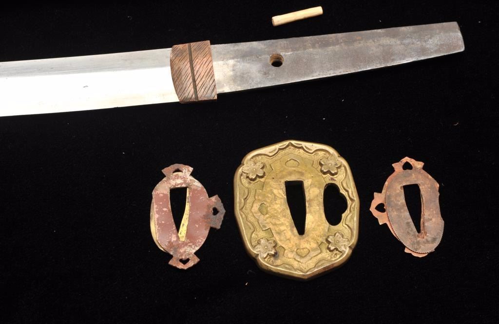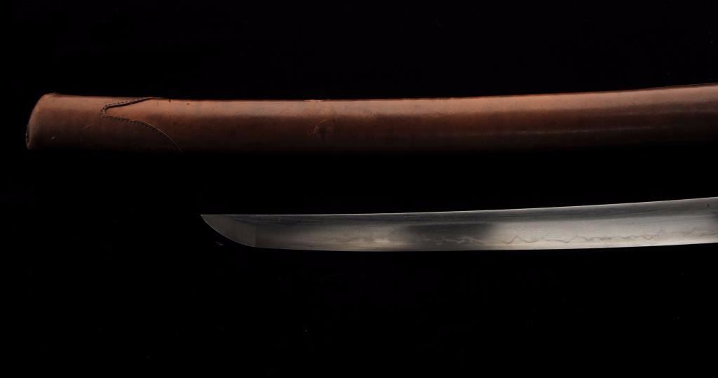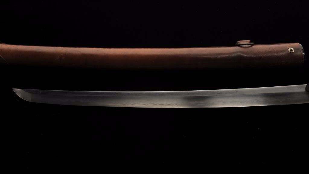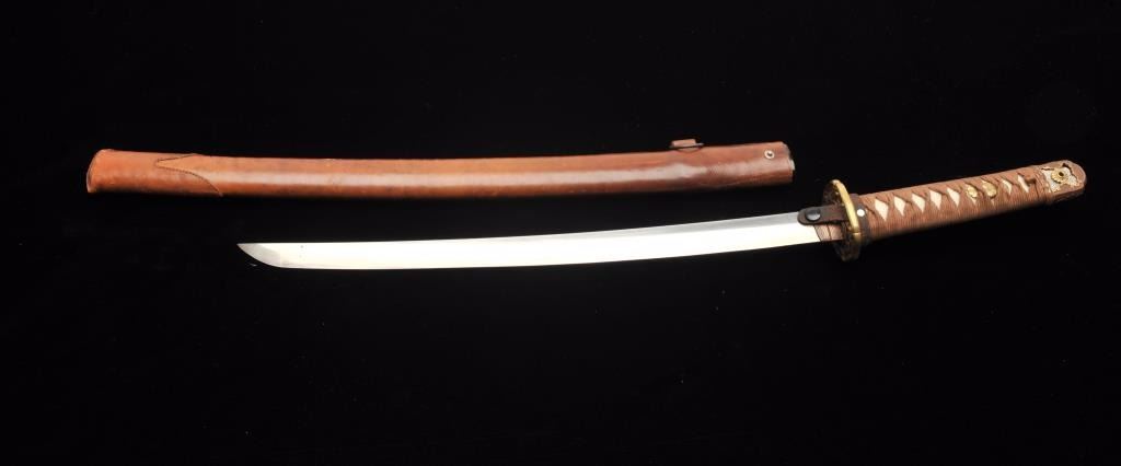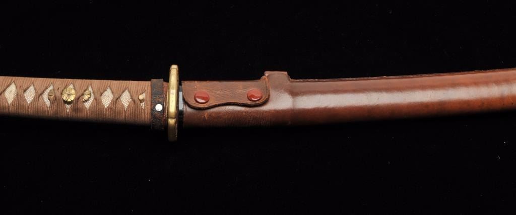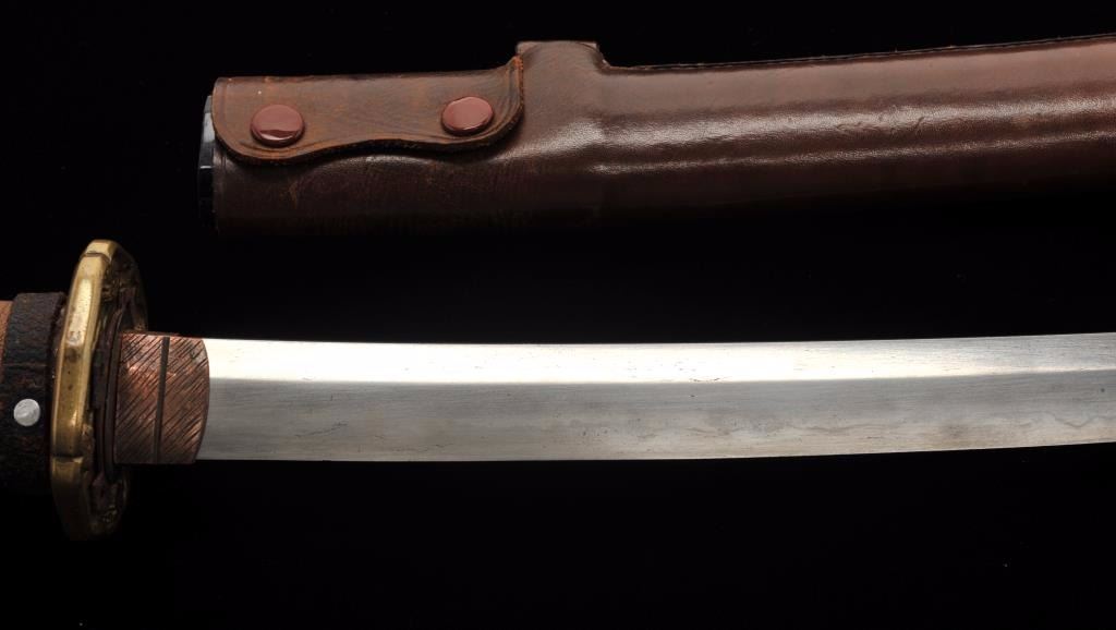 Koto period wakasashi (Medium size) sword in WWII period mountings possibly for a pilot to accompany on missions. The blade measures 22” and 31” overall. The blade is fair to good with some cleaning but visible temperand lamination. The mounts are very good. An old family sword in military mounts. Est.: $350-$700