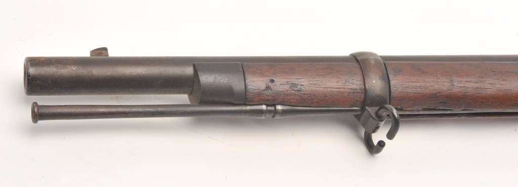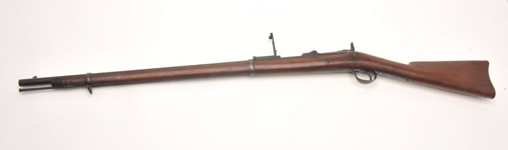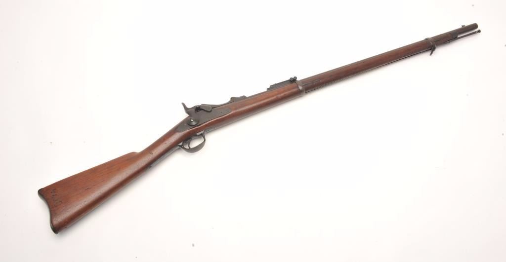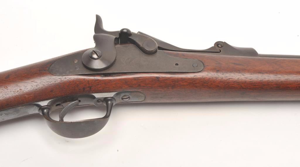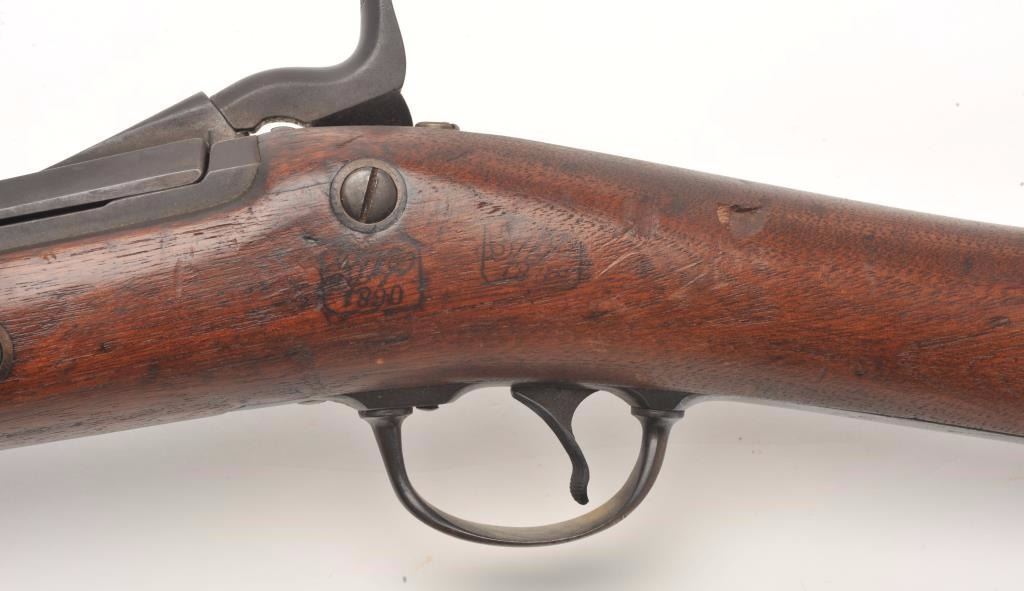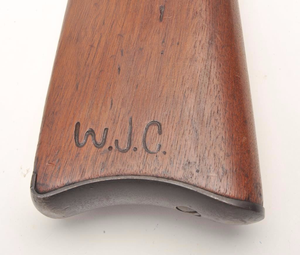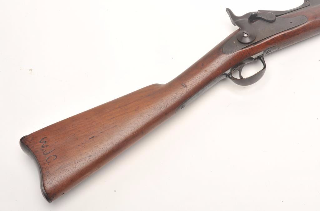 U.S. Trapdoor Springfield rifle, .45-70 caliber, 29.5” barrel, blued finish, wood stock, iron ramrod, S/N 254431, in overall good to very good un-cleaned condition showing a very good bore, crisp action, verygood markings and overall good wood with an old “W.J.C.” carved into the rear area of the butt stock; also two visible inspector’s cartouches on the left side of the stock above the trigger; this rifle is in“out-of-the-attic” condition, the way collectors like to find them! (Antique). Est.: $500-$1,000.