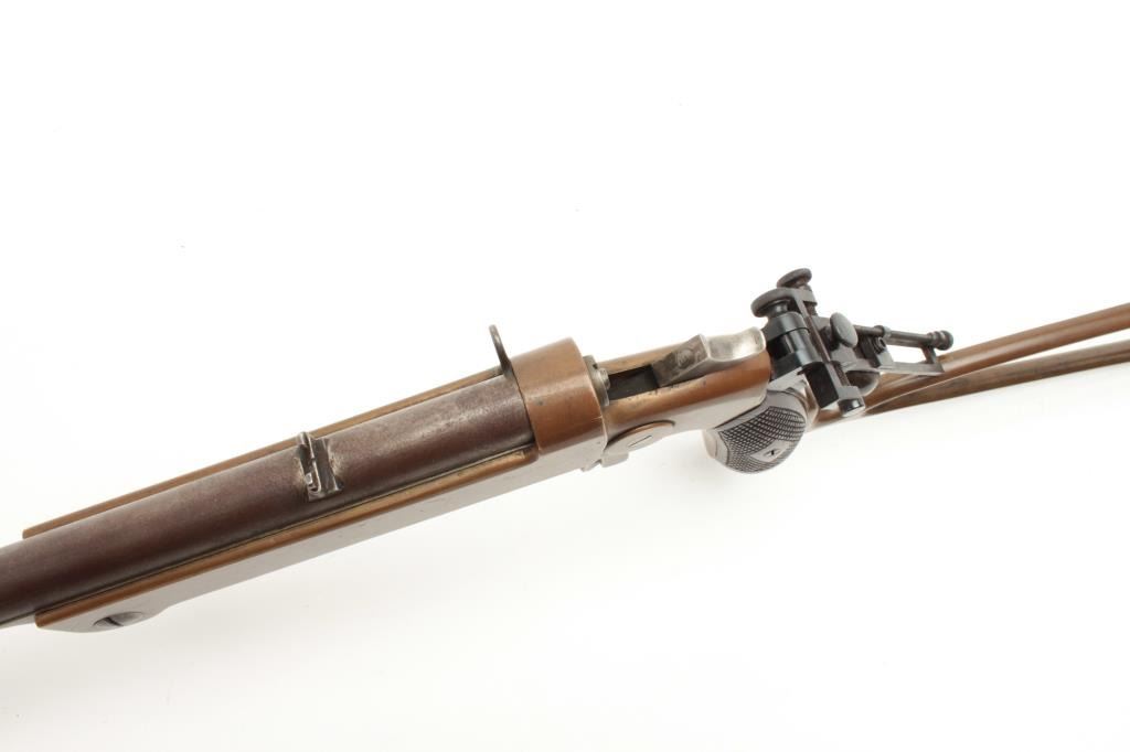 American unmarked and not identified antique pocket rifle with bronze frame and removable shoulder stock in .22 caliber with spring lever release mounted at the center at the bottom side of the frame. 17 5/8” roundbarrel of medium weight and 32” with stock attached. Finely made tang sight worth of a long range rifle that is adjustable for windage and elevation. Appears to never been blued. Very good plus condition withbeautiful patina on the frame. The checkered wood stock is also very good plus condition. (Antique) Est.: $1500-$3000