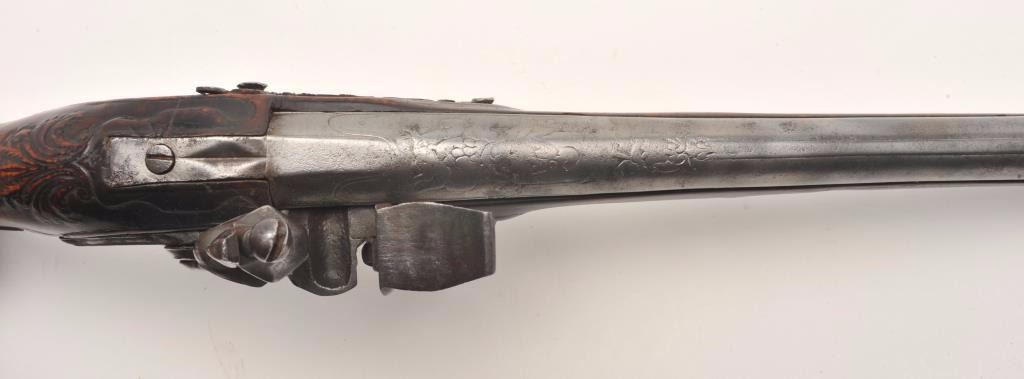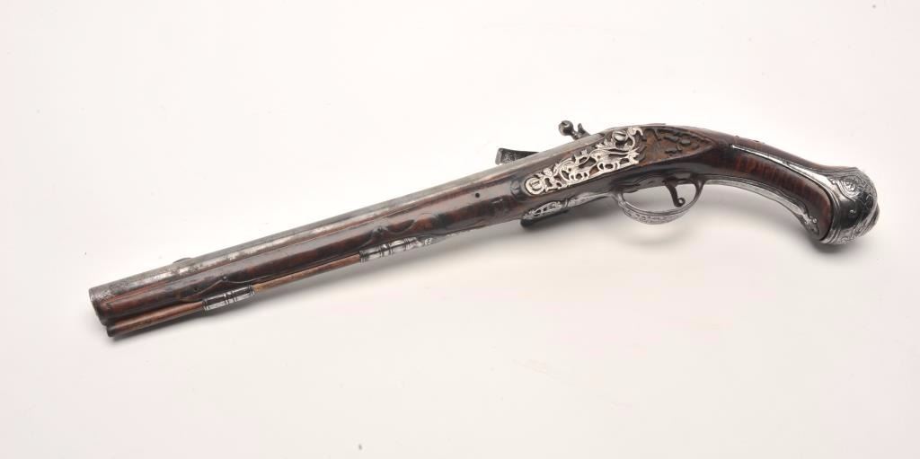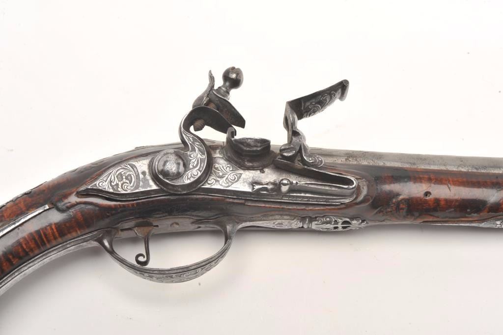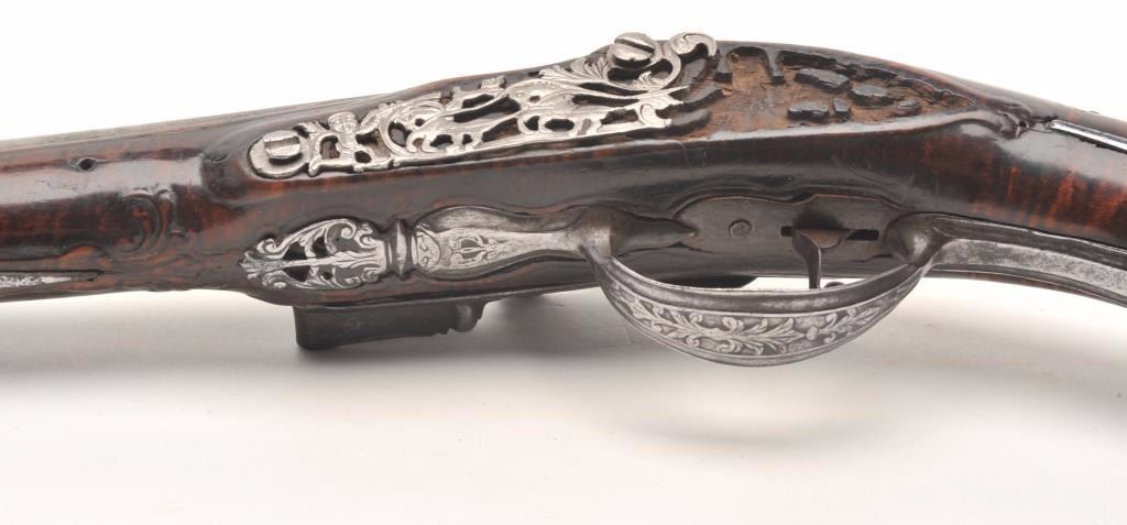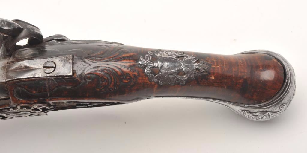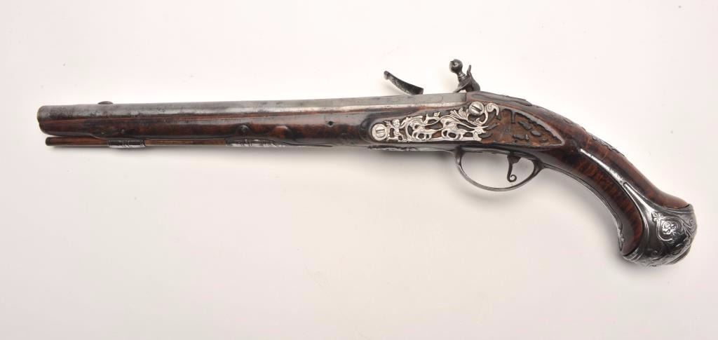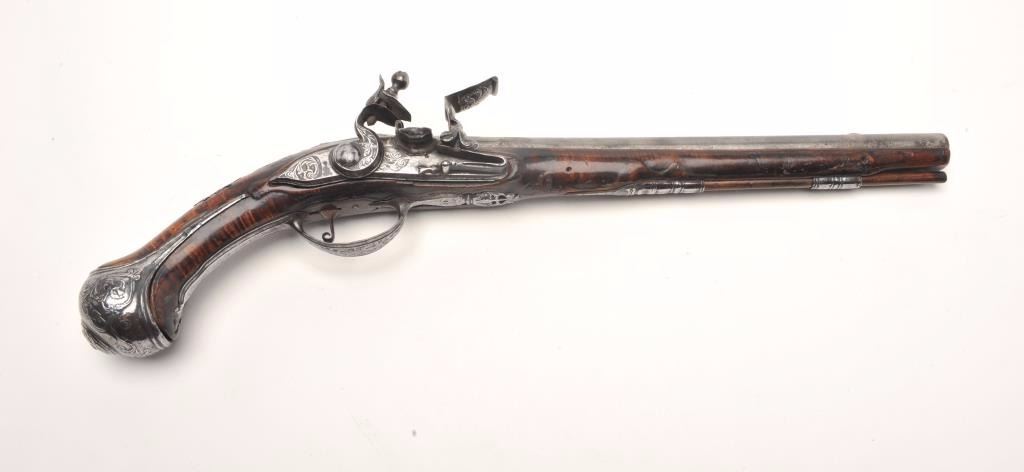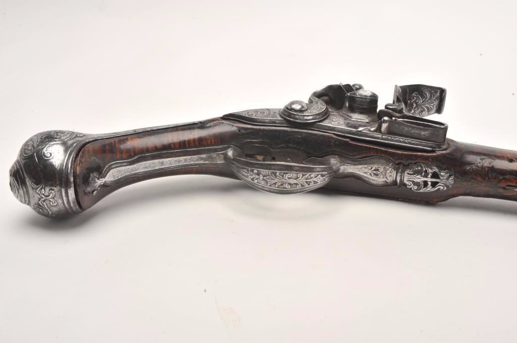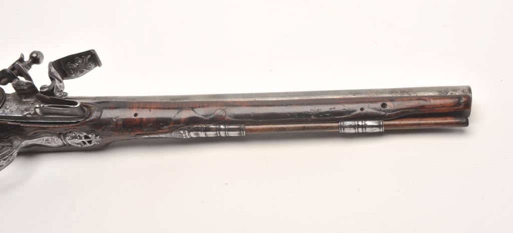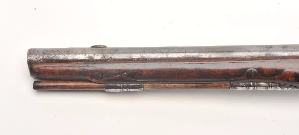 Lot 91 French flintlock horse pistol, .62 caliber, 13” barrel, wood stock, fancy mounts, lockplate signed