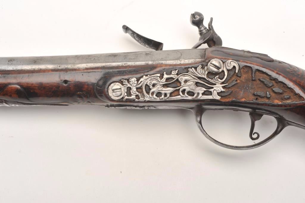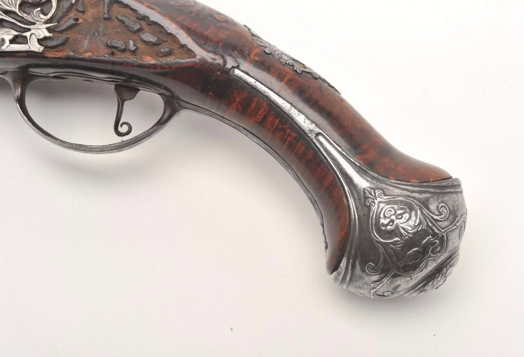 French flintlock horse pistol, .62 caliber, 13” barrel, wood stock, fancy mounts, lockplate signed “T. Deprez” on bottom front rim, in overall good to very good condition with working action, very good wood, leftside plate damaged; great faces incorporated in the butt plate with raised carving on the top of the wrist area. (Antique). Est.: $1,500-$3,000.