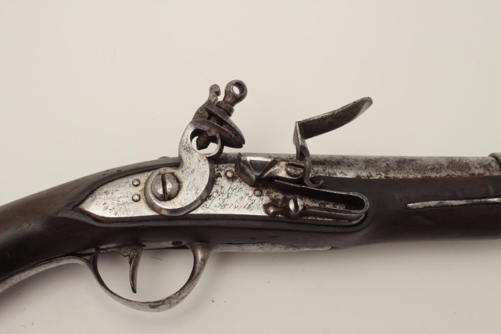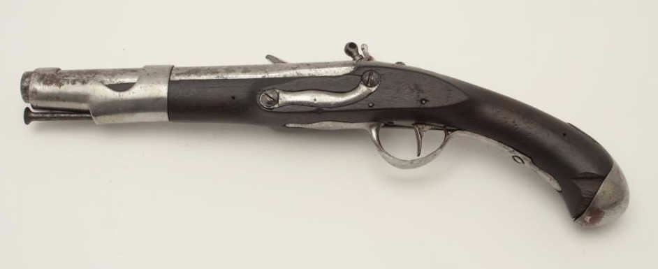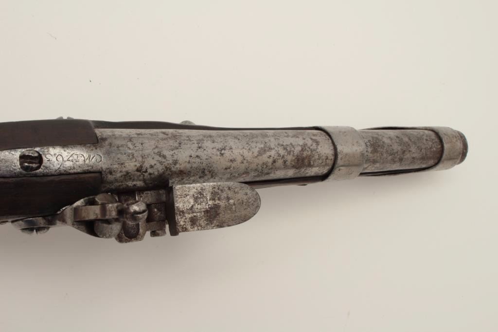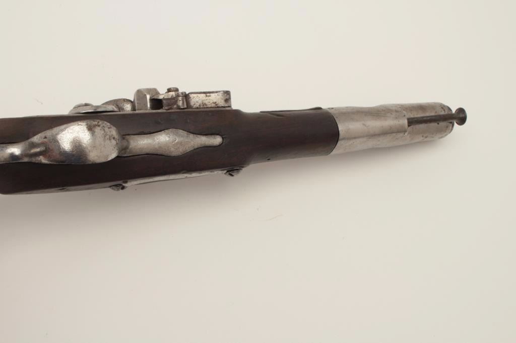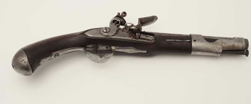 Lot 94 French Model 1763 military flintlock pistol by Libreville arsenal with iron mounts. Measures 16” o
