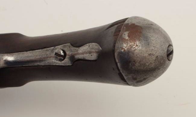 French Model 1763 military flintlock pistol by Libreville arsenal with iron mounts. Measures 16” overall with a 9” barrel of .69 caliber. Light to moderate pitting and erosion with good markings. The stock hasbeen lightly cleaned and slightly undersized against metal. All original parts and proper style ramrod. A significant and early military pistol that may have come to America in the era of the American Revolution whilewe were allied with the French. (Antique) Est.: $800-$1600