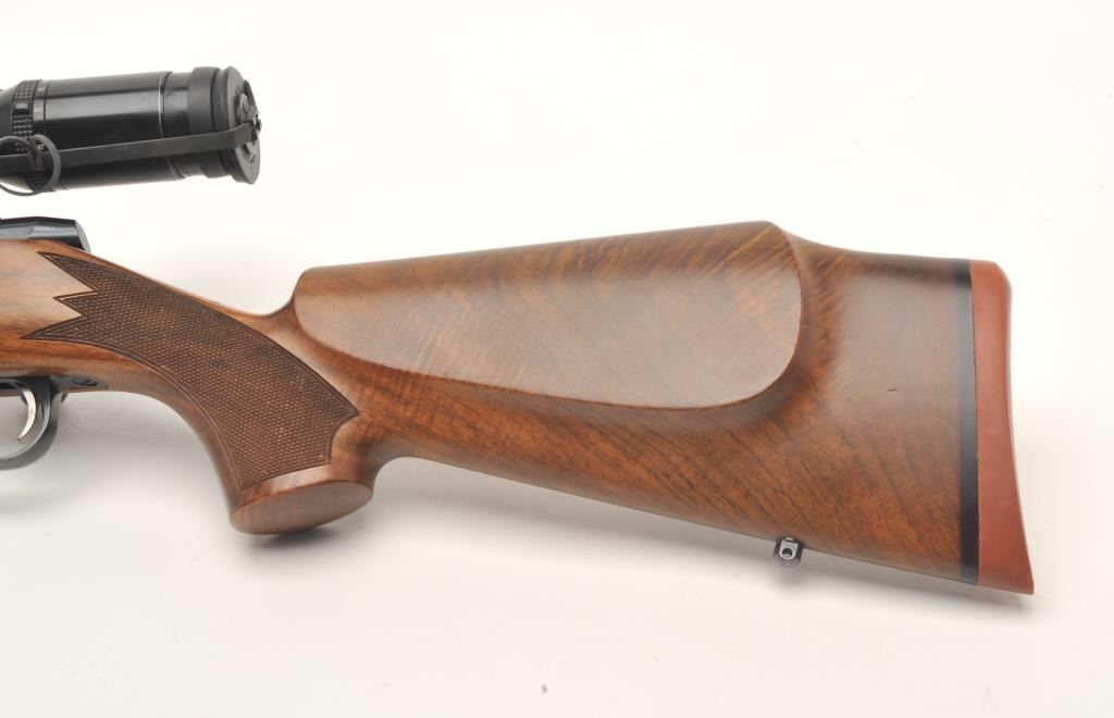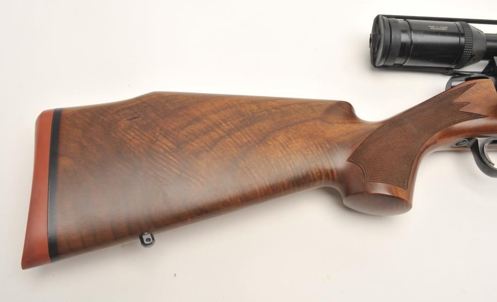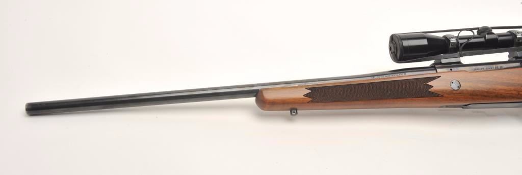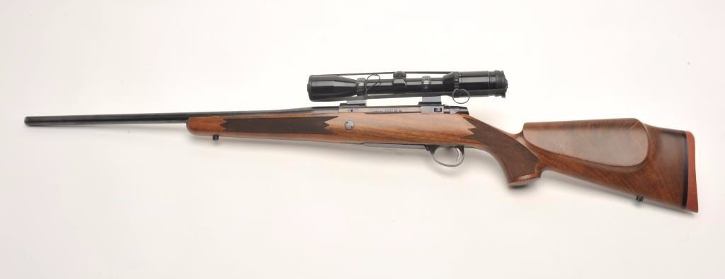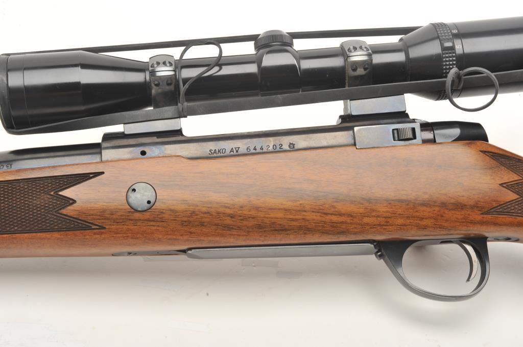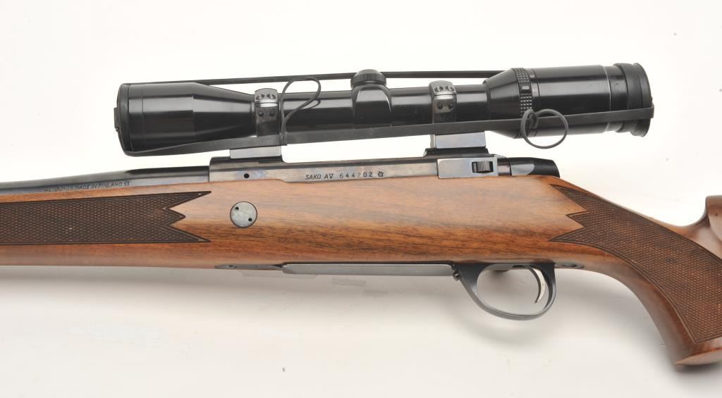 Sako AV Model bolt action rifle (import-marked by Stoeger Arms), .30-06 caliber, 23.5” round barrel, black finish, checkered wood stock with Sako hard rubber butt pad, S/N 644202, mounted with aSwarovski 3-9x36A Nova scope with sharp optics. This gun is in overall very good + to fine condition displaying the majority of its original finish with several wear areas at the front end of the barrel, very good tofine bore, crisp action and markings, fine wood stock with beautiful graining. (Modern/PPT). Est.: $800-$1,600.