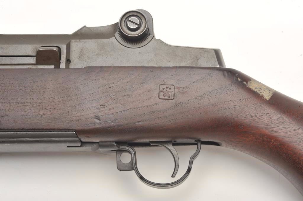 U.S. M1 Garand semi-automatic rifle by Harrington & Richardson, .30 caliber, 24” LMR barrel dated 8 55; military finish, wood stock, S/N 5729424, in overall good condition with considerable military finish remainingon metal surfaces, good bore, crisp action and markings; wood stock shows areas of wear on the top barrel handguard, the semi-pistol grip and at the bottom of the butt stock; otherwise, good overall and with 3 stars over spread eagle in square cartouche on left side of stock above trigger. (C&R/PPT). Est.: $1,000-$2,000.