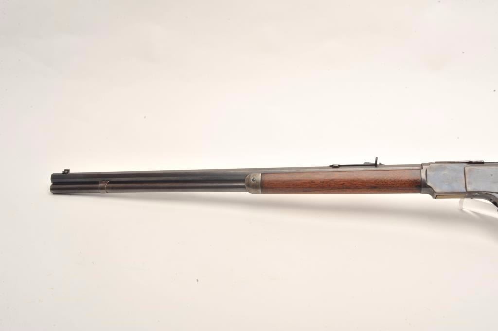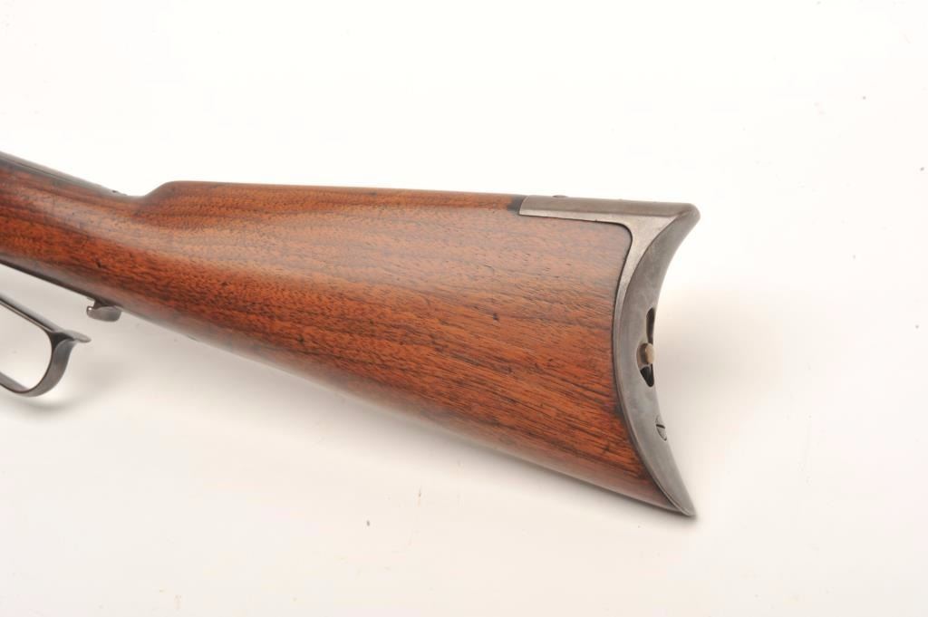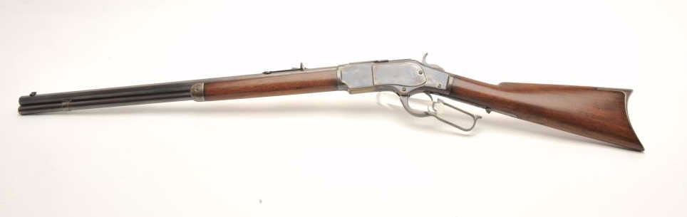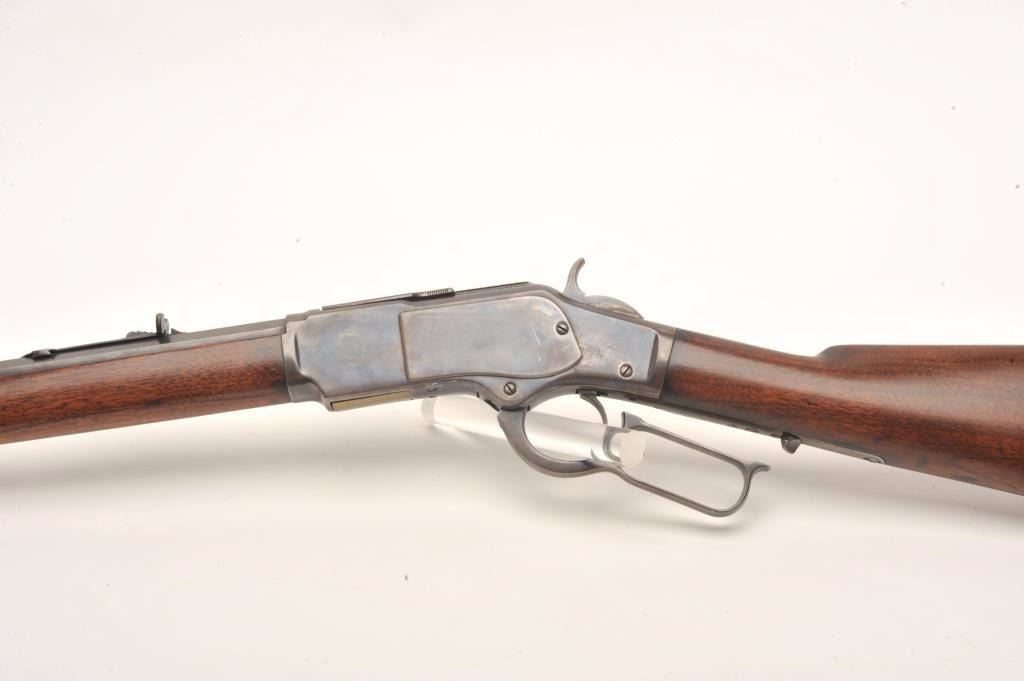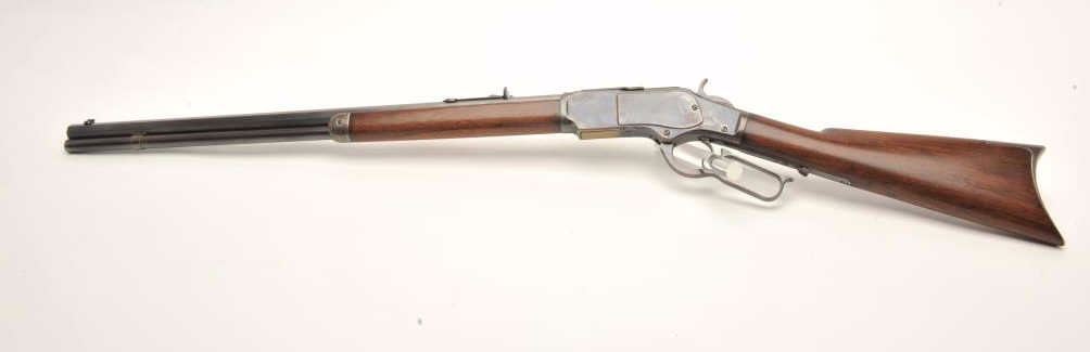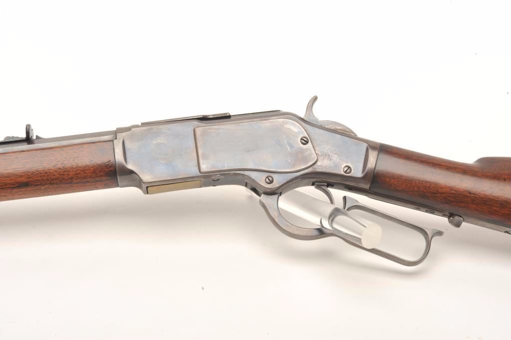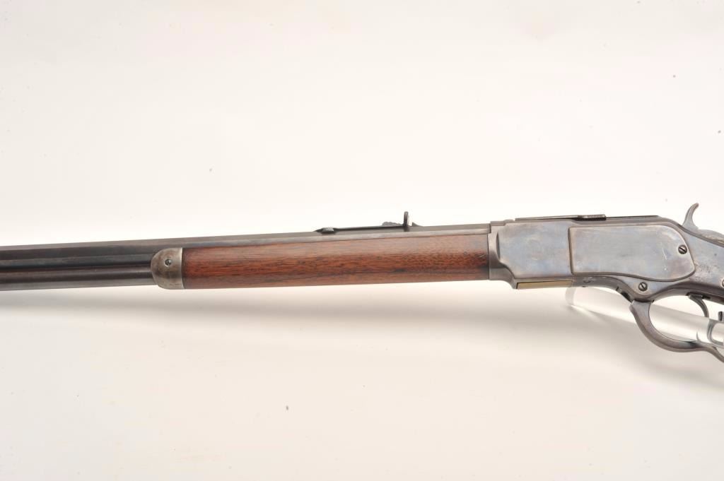 Lot 112 Winchester Model 1873 lever action rifle, .38 W.C.F. caliber, 24” octagon barrel, wood stocks, lig