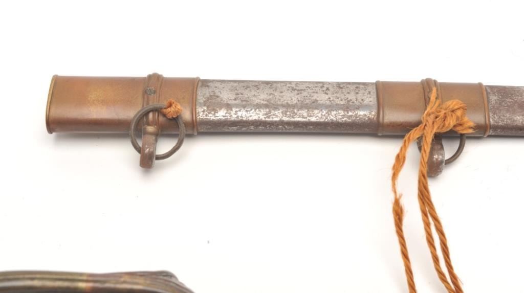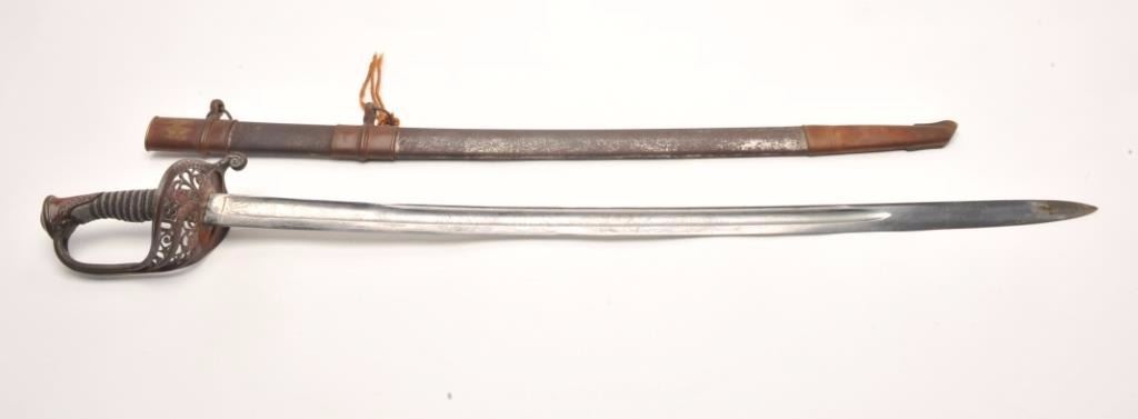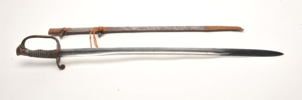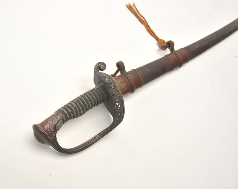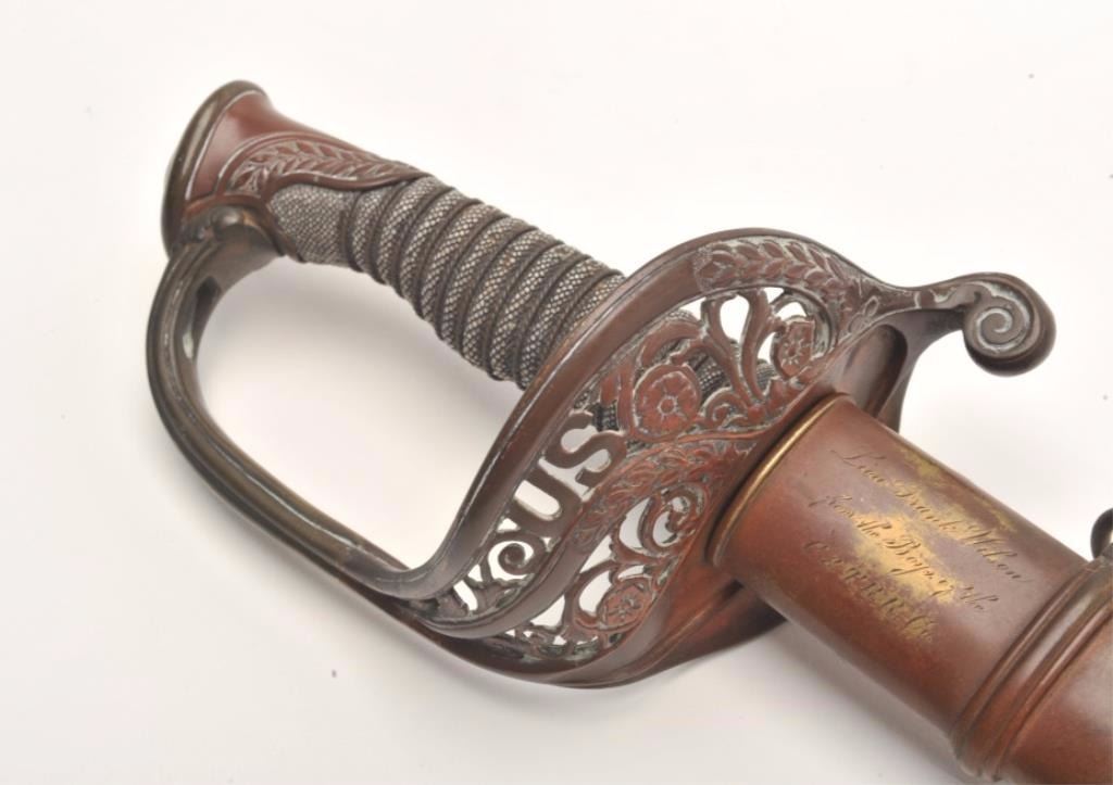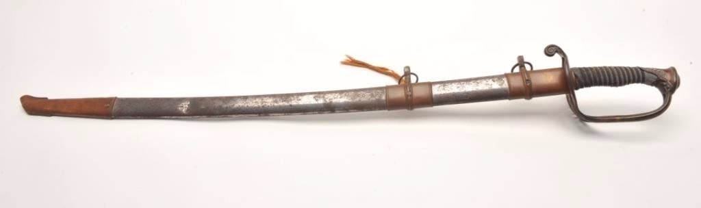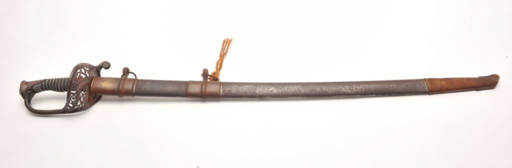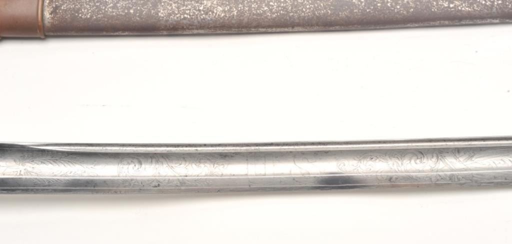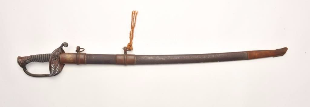 Officer’s sword and metal scabbard period inscribed “Lieut Frank Wilson/from the boys of the/C. & T. R. R. Co.” with binder of information on Wilson who enlisted on July 28, 1862 as a First Lieutenant with the Ohio19th Light Artillery. He was promoted later to Captain on November 3, 1864 and mustered out of service on June 27, 1865. The 19th saw service primarily in the South begin with Brunside’s Campaign in Eastern Tennessee,also the Atlanta campaign, Kennesaw Mountain, Nashville campaign, pursuit of Hood to the Tennessee River and ending with presence at the surrender of Johnston and his army. The unit also saw duty at Raleigh and Salisbury,NC. The sword has an etched blade and wire wrapped rayskin grip with brass mountings showing a beautiful dark patina; the inscription is on the right side of the throat’s brass mount. The body of thescabbard shows an un-cleaned metal surface. Further research as to the identity of the C. & T. R.R. Co. should prove important as given the fact that Wilson was with a Light Artillery unit, “the boys” likely were with a