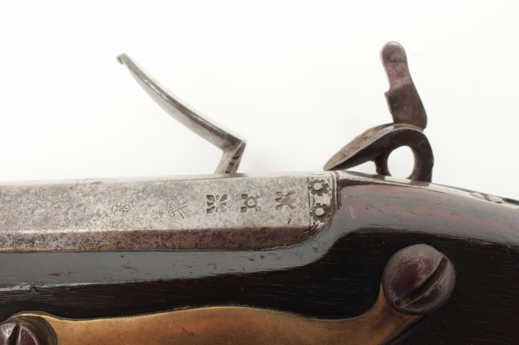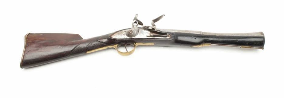 Flintlock blunderbuss with tower lock showing “G.R.” and crown marking. Measures 28 ½” overall with a 14 ¾” iron barrel that measures nearly 1 ¾” across the muzzle. Has a para-military style and similar to examplesused by Hudson Bay and east India companies. Lightly cleaned metal surfaces with light to moderate pitting. The stock is good with minor old repairs, small imperfections and normal wear. Circa 1810-1830s. Top jaw ismissing. (Antique) Est.: $1400-$2800