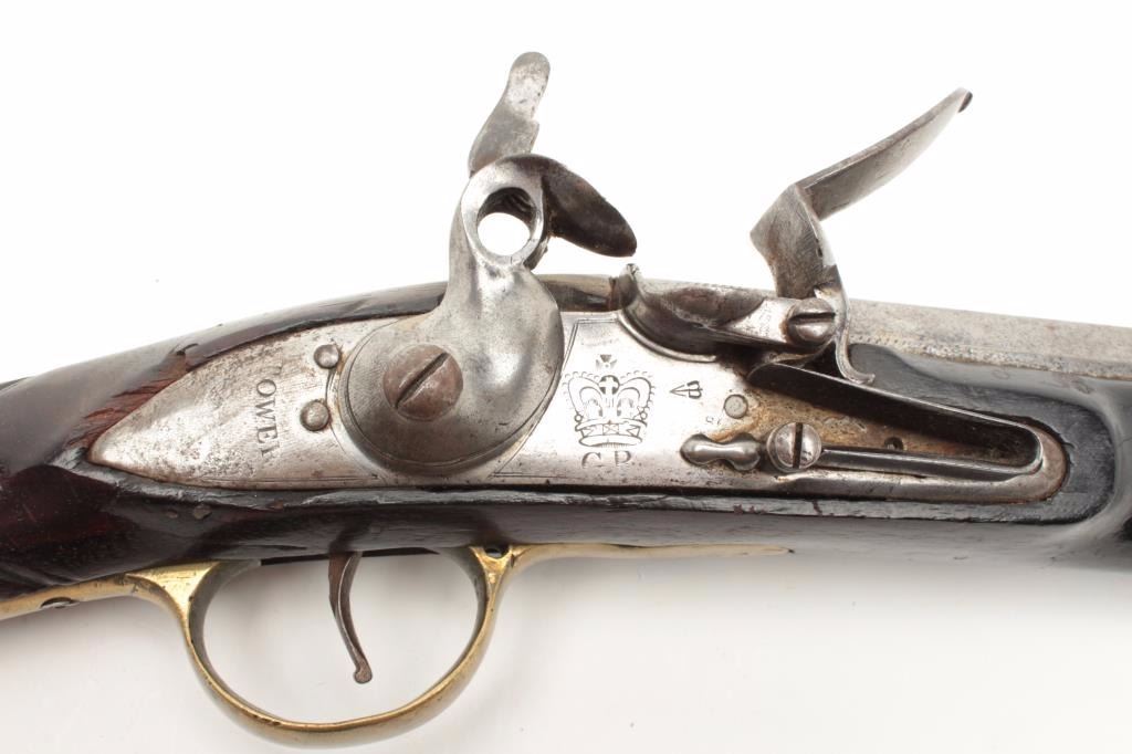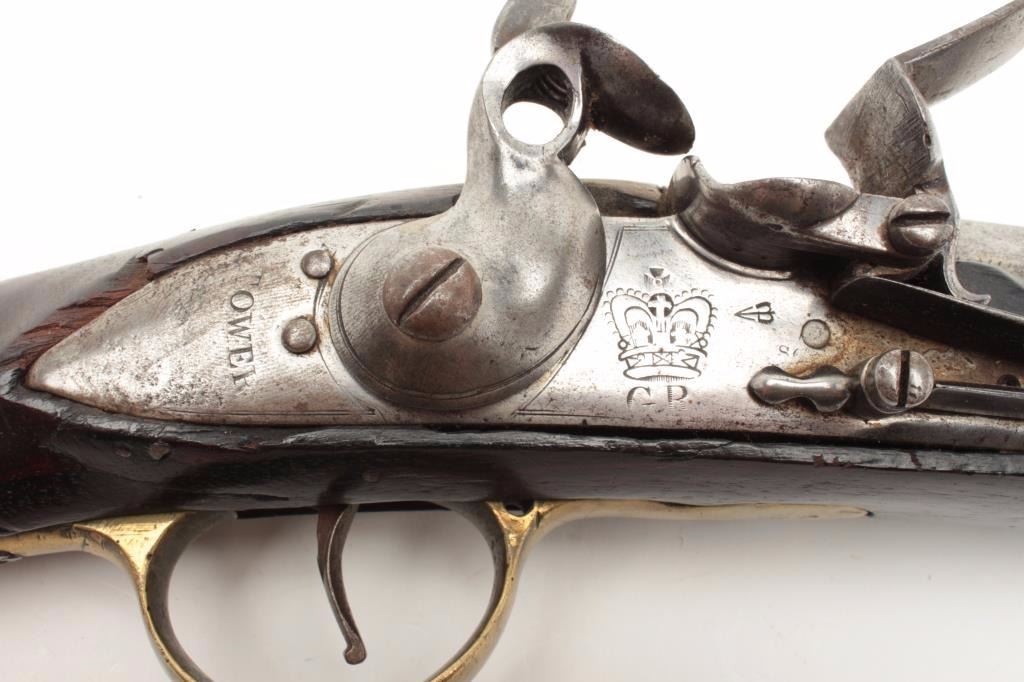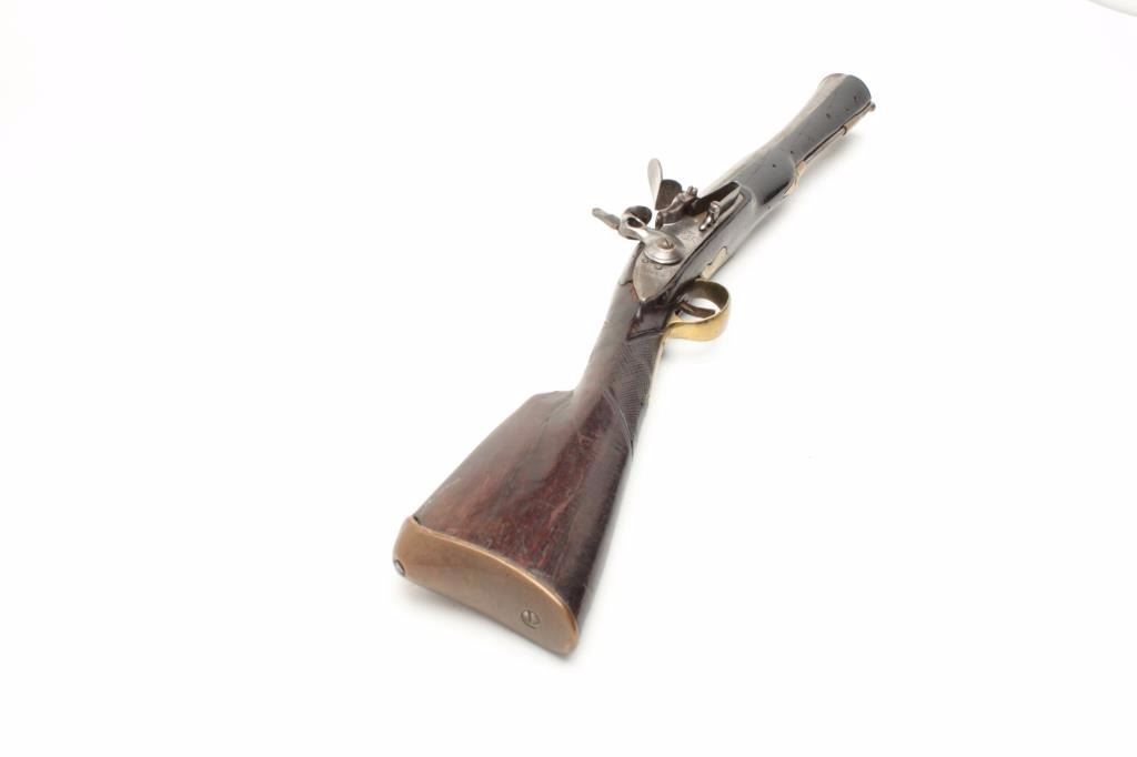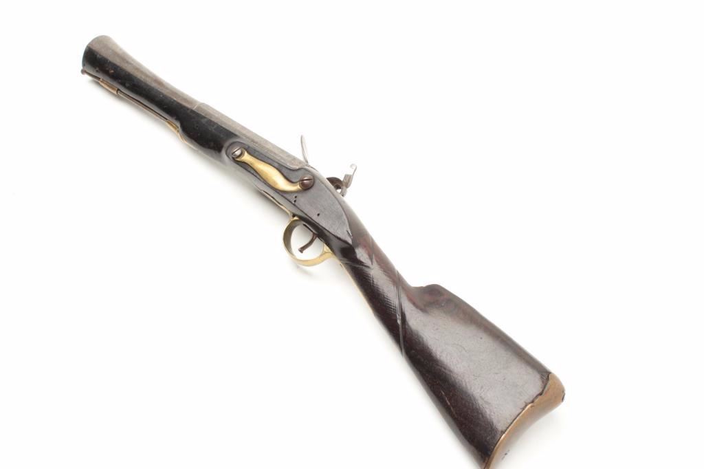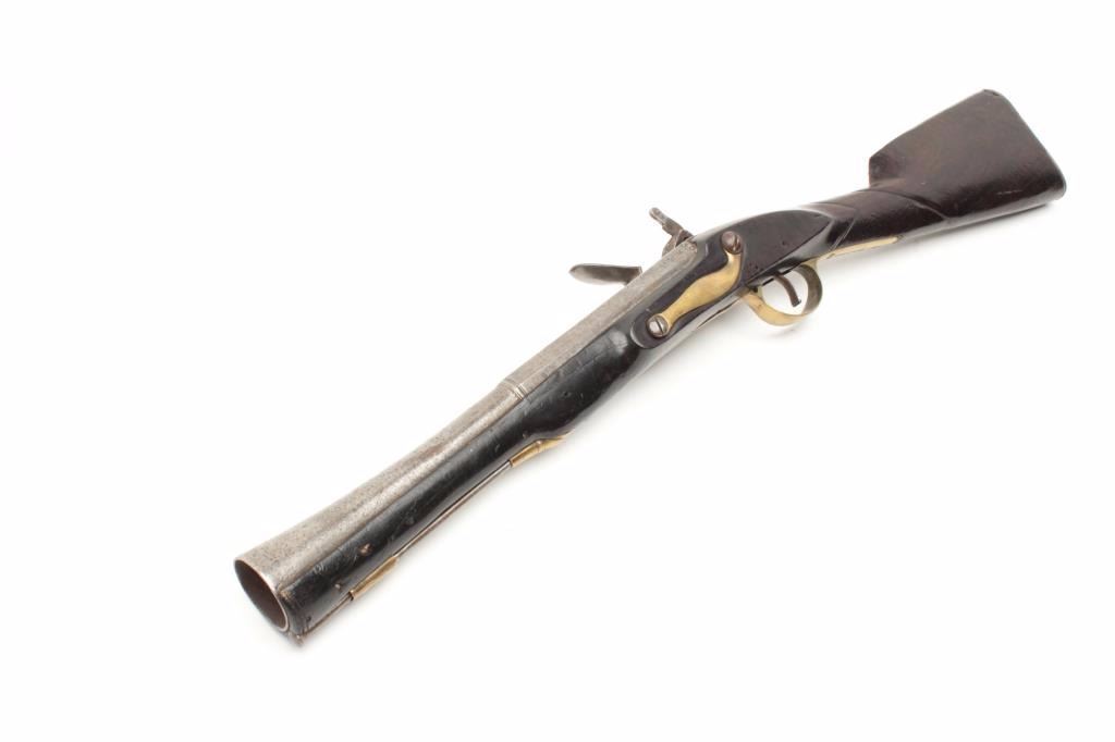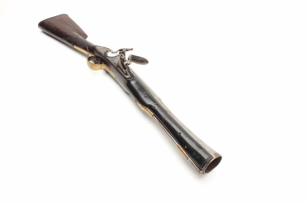 Lot 120 Flintlock blunderbuss with tower lock showing “G.R.” and crown marking. Measures 28 ½” overall wit