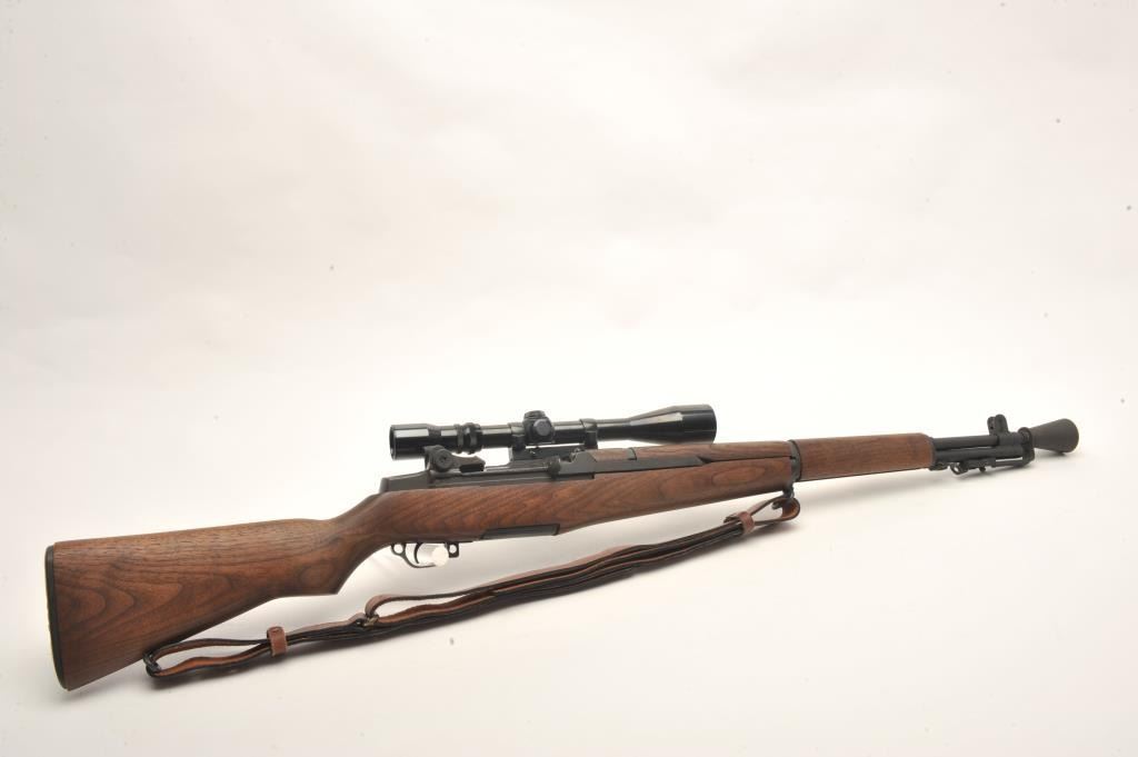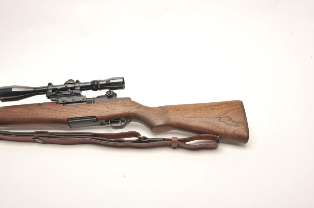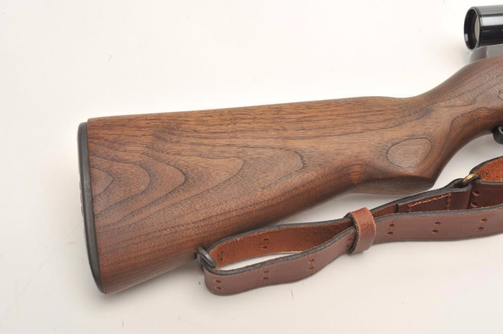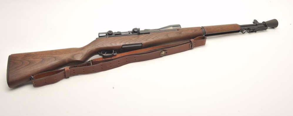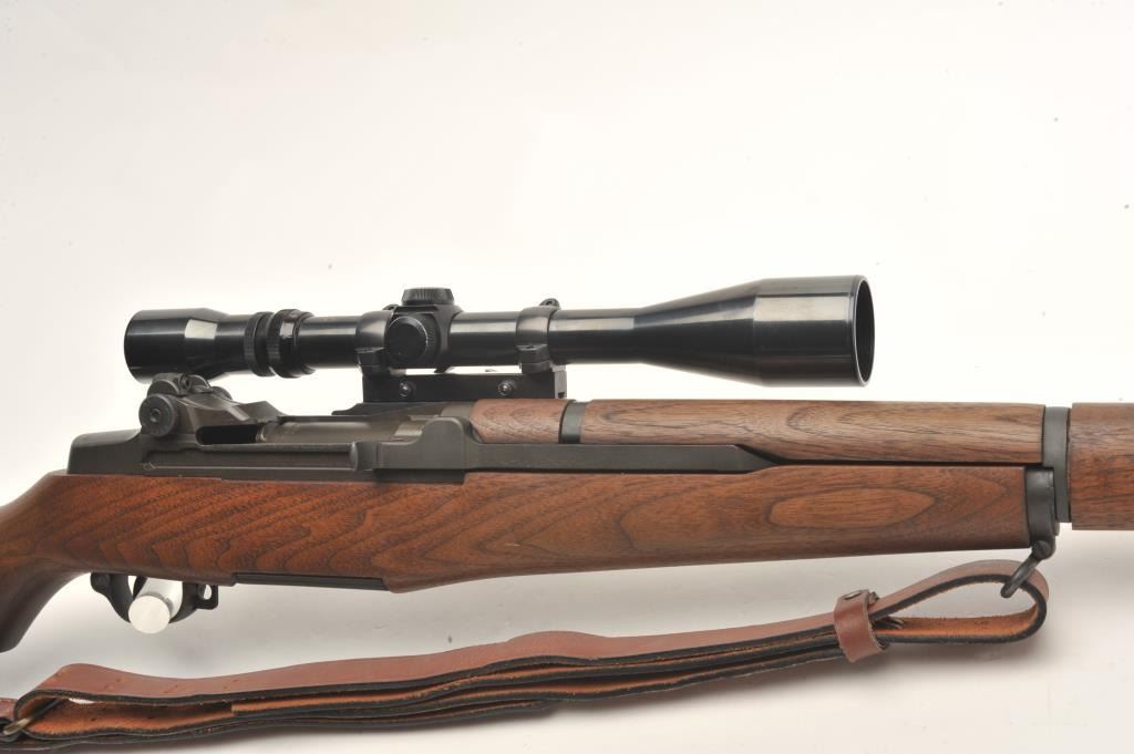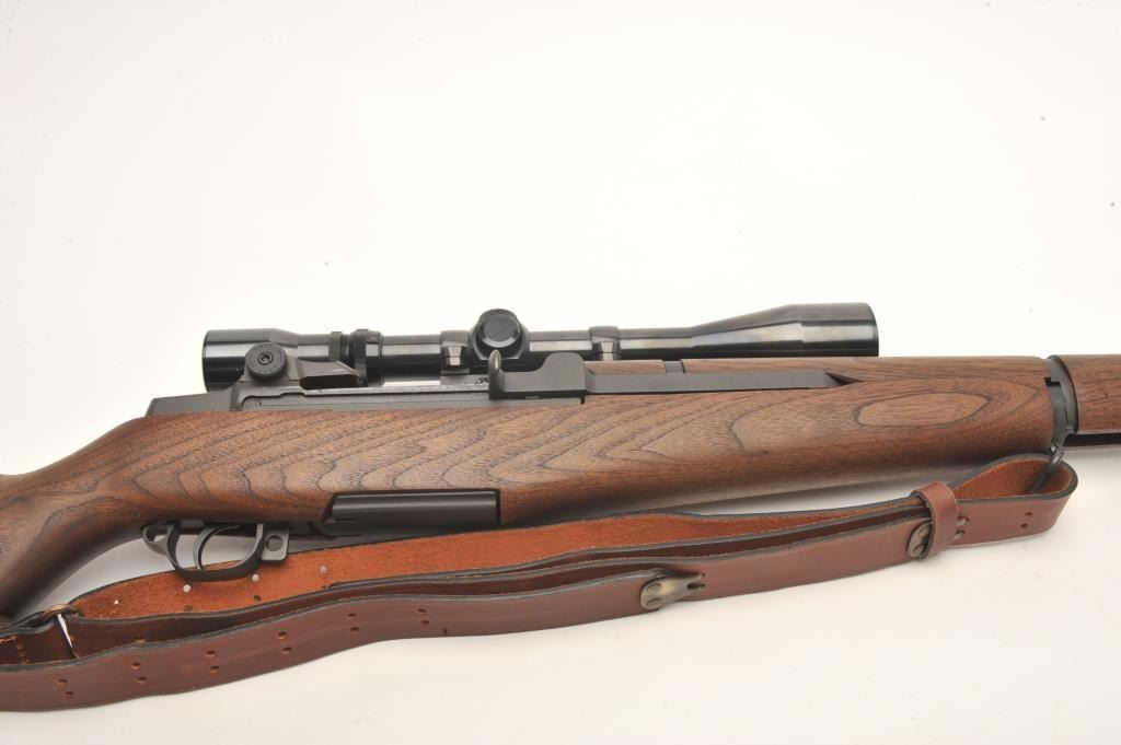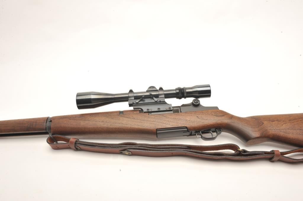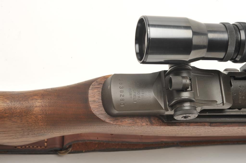 Built-up Garand M1-C semi-automatic rifle with Kriger Match Grade barrel, .30 caliber, military finish, wood stock, leather sling, S/N 3838280, with a G & H side mounted Weaver scope displaying fine optics; in overallfine condition as a “shooter”. (C&R/PPT). Est.: $1,500-$3,000.
