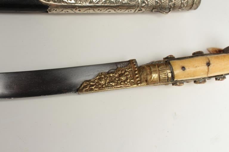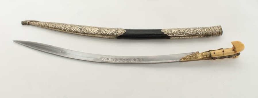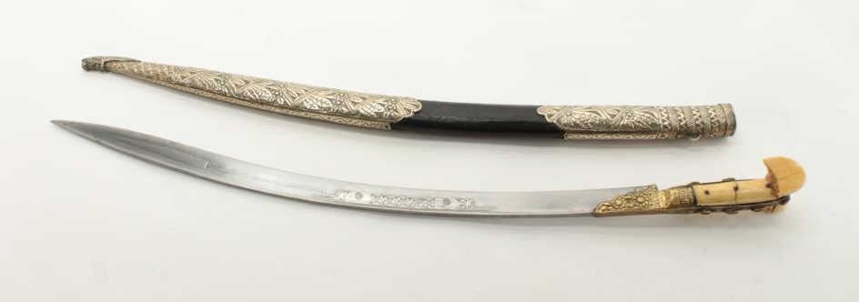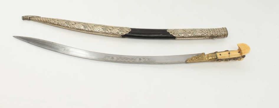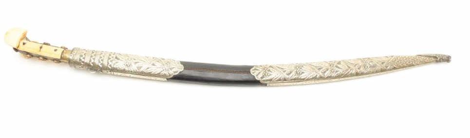 Lot 132 Very good quality yatagan with coral gem stone inlay and silver mounted fancy scabbard. Marine ivo