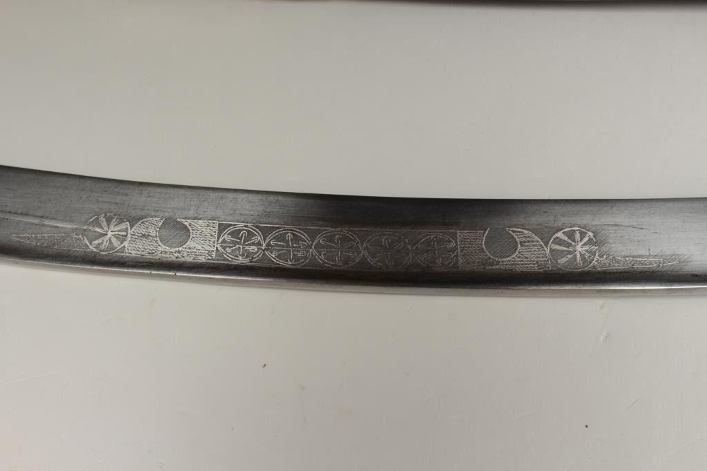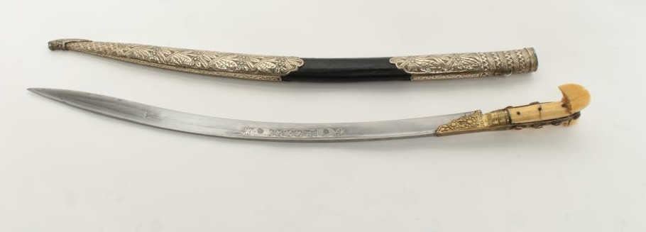 Very good quality yatagan with coral gem stone inlay and silver mounted fancy scabbard. Marine ivory original grips showing minor breaks and cracks. Polished steel blade shows silver inlay including name orprayers. Measures 34” overall with a 29” blade. 150-300 years old and overall very good condition with exceptionally nice scabbard. Est.: $900-$1800