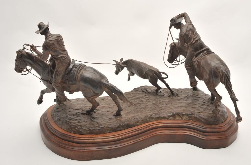 Original bronze entitled “Good Horses, Fast Loops” by Bill Nebeker, approximately 17” in height including wood base, 29” long and 18” wide, #4/25; great action and detail; copy of original receipt dated 1997, showing priceof $6,850 plus letter from this well-known Prescott, AZ artist. Est.: $3,000-$6,000+.
