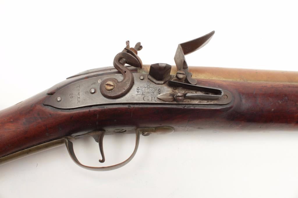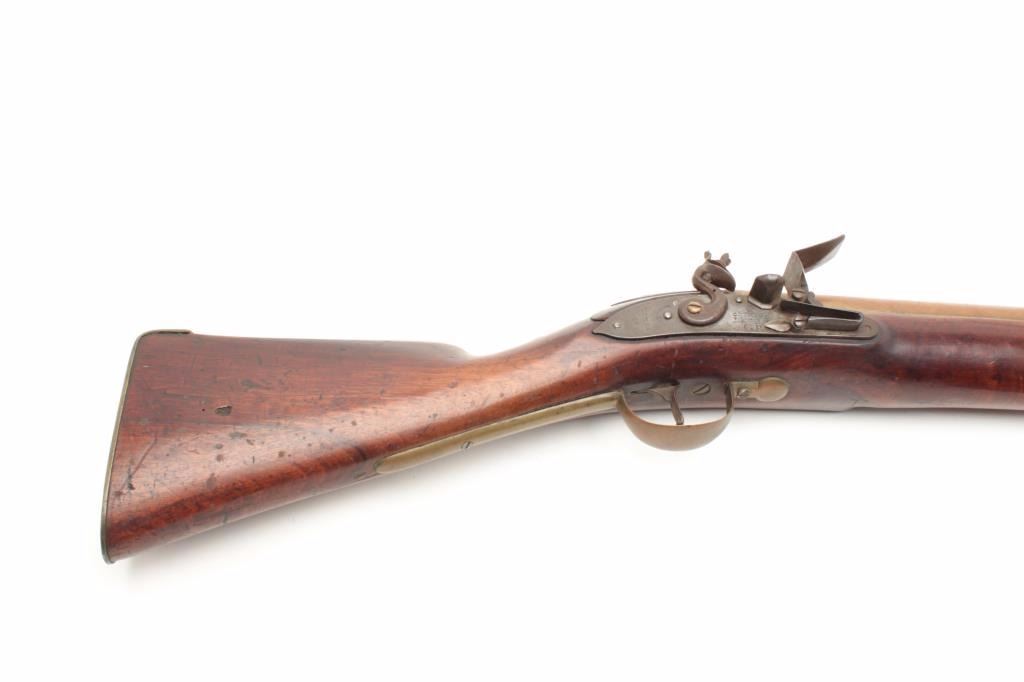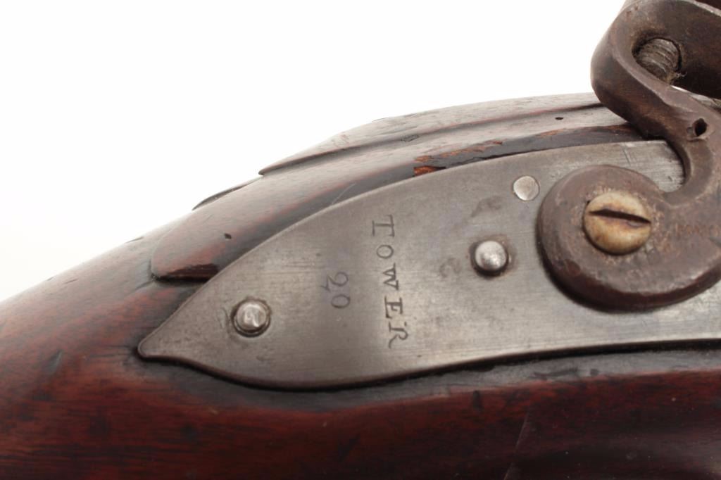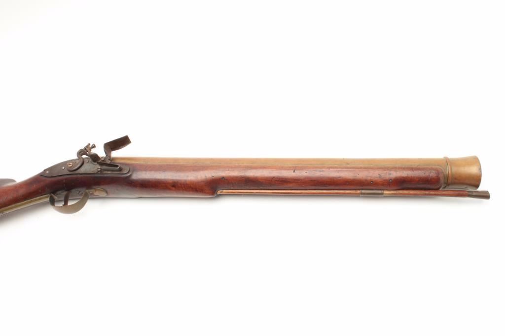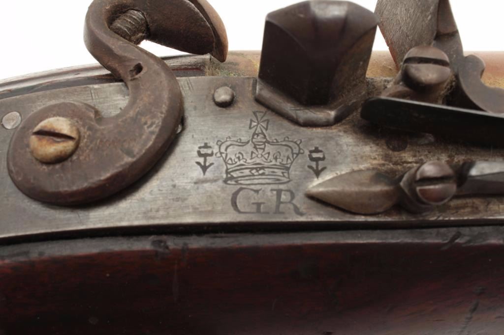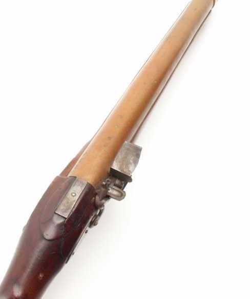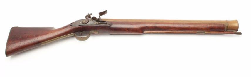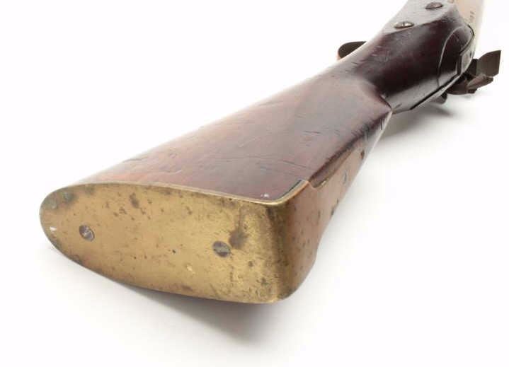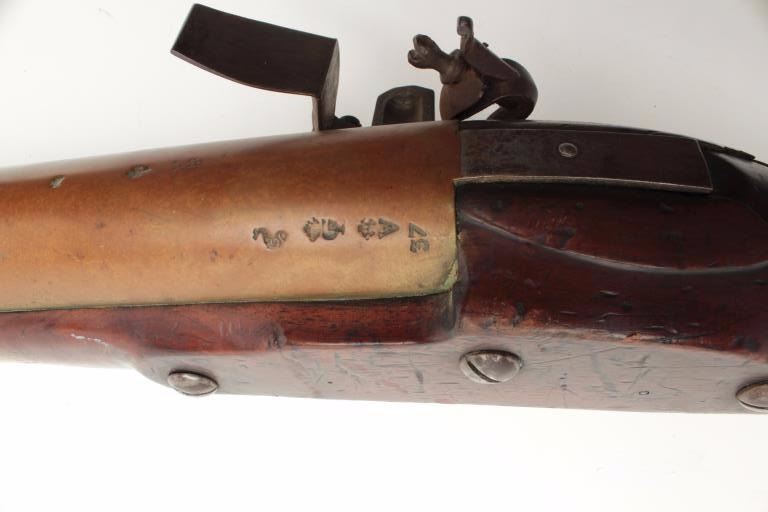 Impressive and very early English brass cannon size rail or ships blunderbuss with “GR” cypher hand engraved and British proofs (George I) on the lock. Measures 44 ½” overall with a 28” barrel showing ringed andflared cannon style muzzle measuring almost 1 ¾” across the inner walls of the barrel. Total weight 20.5 pounds. Also marked “Tower” at the rear of the lock and “20” as rack or ships number. The barrel shows a great honeybrown patina as do the mounts. The steel shows a dark to gray natural patina with good markings. The stocks are good plus with minor dings but shows a large crack opening at the tang. We would date this gun about1700-1715. Est.: $5,000-$10,000