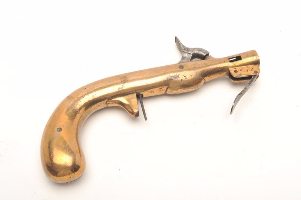 Rare Civil War issue U.S. Martial flare gun marked “U.S.O.Y.W., W.N.J.” inspections with 1864 date and #48. Measures 9 ¾” overall with bronze body and steel hammer, trigger, and small parts. Manufactured at ordnance yardWashington D.C. and fired a B.T. Coston cylindrical flare. (Refer Flayderman 6A-053). The Walker Colt of U.S. Martial flare pistols. (Antique) Est.: $5,000-$10,000