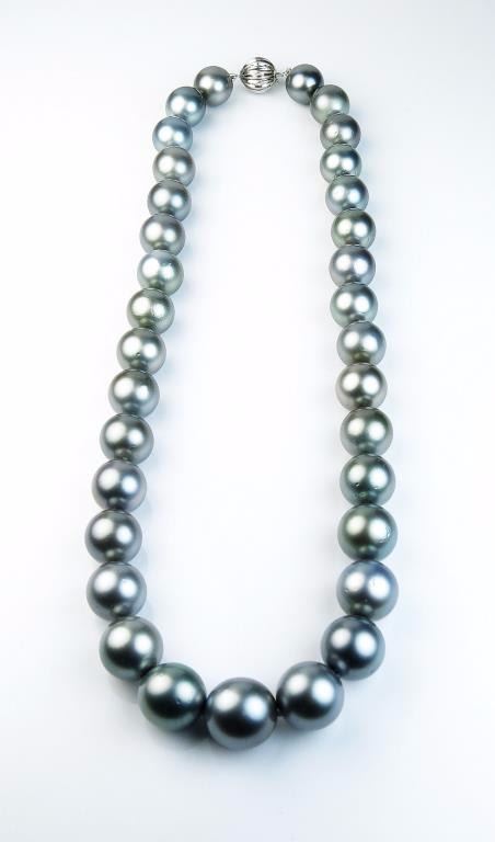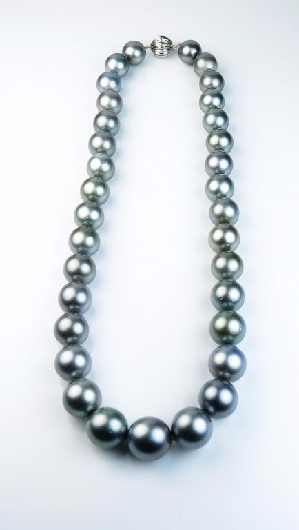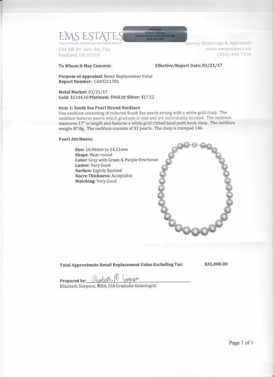 Exquisite Natural Tahitian South Sea Pearls ranging between 11.00 MM to over 14.50 MM in diameters. Fine lusters of beautiful gray with green and purple overtones. Please see Retail Appraisal at $35,000.00 Estimates$8,000-$15,000