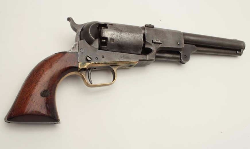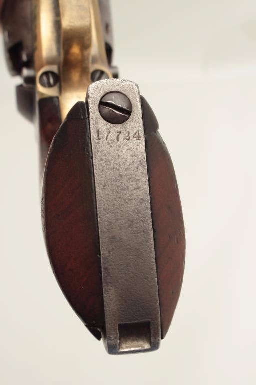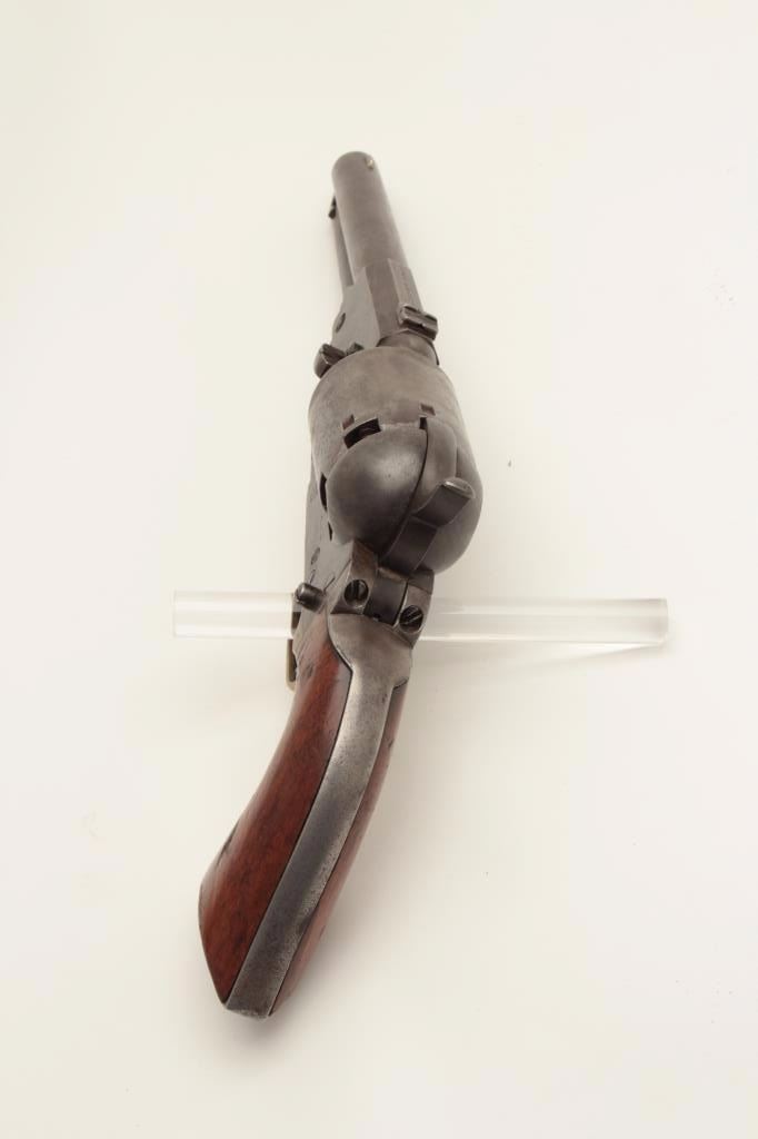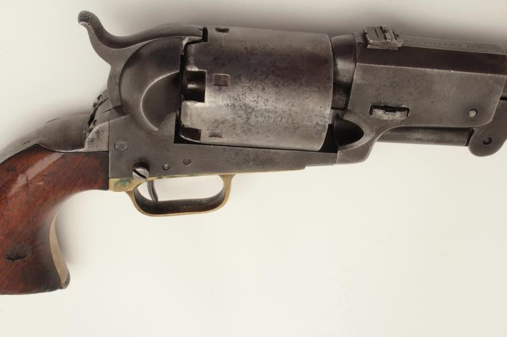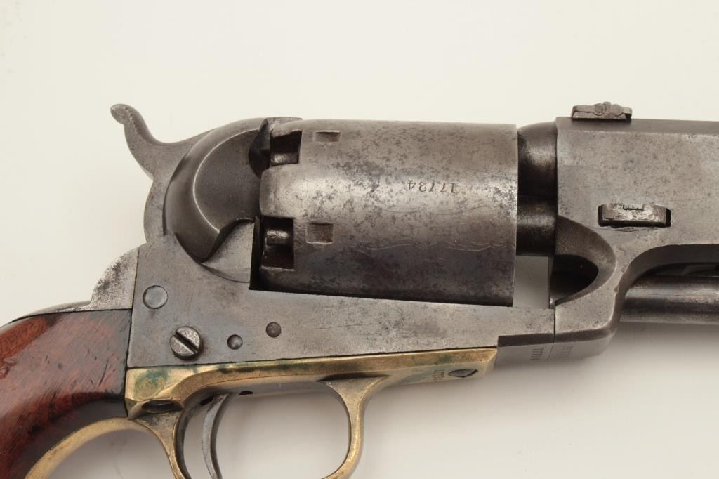 Colt 3rd Model Dragoon percussion revolver, cut for shoulder stock, .44 caliber, 7.5” barrel, blued and case hardened finish, wood grips, S/N 17724 (all matching visible including rammer). This Dragoon is inoverall very good + condition displaying an overall even grey patina, majority of its original cylinder scene remaining with scattered pinprick pitting and spots of small erosion confined primarily to the cylinder;crisp action, good bore and markings, brass trigger guard, iron backstrap; grips show considerable finish remaining, a small old repair to the front bottom of the left grip and some scattered old mars and scratches.Per Flayderman’s Guide to Antique American Firearms, only approximately 1,200-1,500 3rd Models were produced to accept a shoulder stock. (Antique). Est.: $6,000-$12,000.