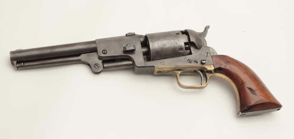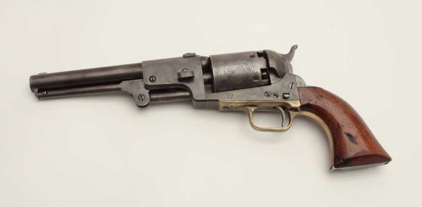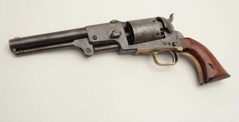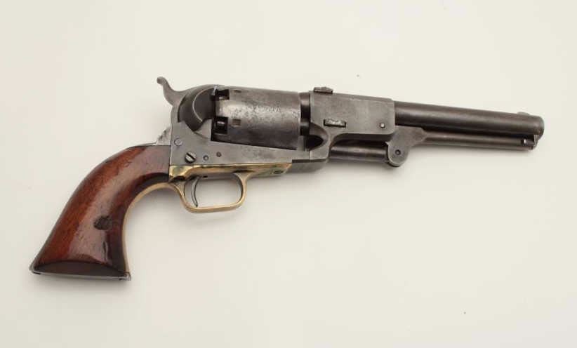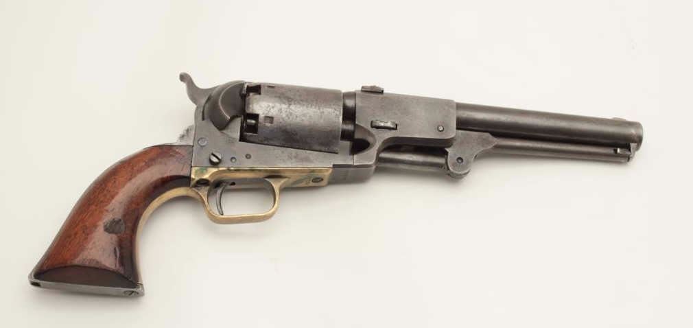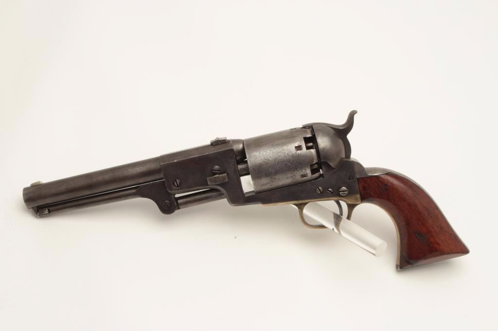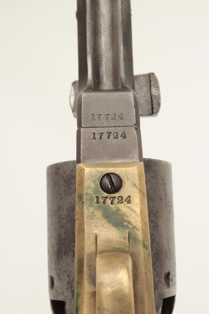 Colt 3rd Model Dragoon percussion revolver, cut for shoulder stock, .44 caliber, 7.5” barrel, blued and case hardened finish, wood grips, S/N 17724 (all matching visible including rammer). This Dragoon is inoverall very good + condition displaying an overall even grey patina, majority of its original cylinder scene remaining with scattered pinprick pitting and spots of small erosion confined primarily to the cylinder;crisp action, good bore and markings, brass trigger guard, iron backstrap; grips show considerable finish remaining, a small old repair to the front bottom of the left grip and some scattered old mars and scratches.Per Flayderman’s Guide to Antique American Firearms, only approximately 1,200-1,500 3rd Models were produced to accept a shoulder stock. (Antique). Est.: $6,000-$12,000.