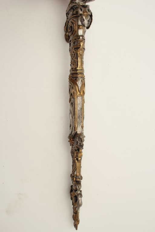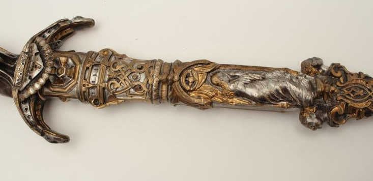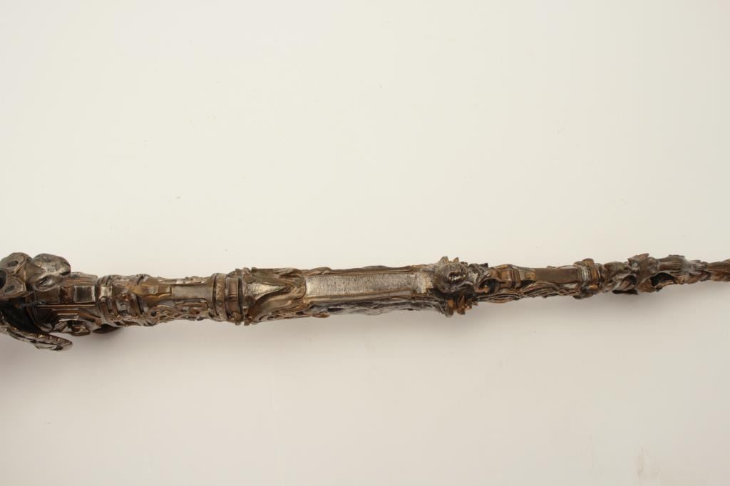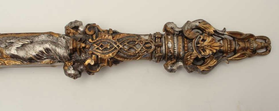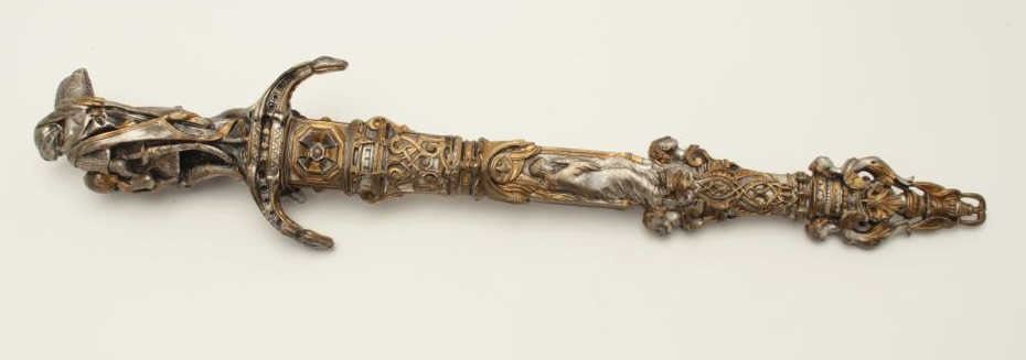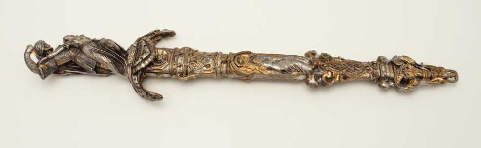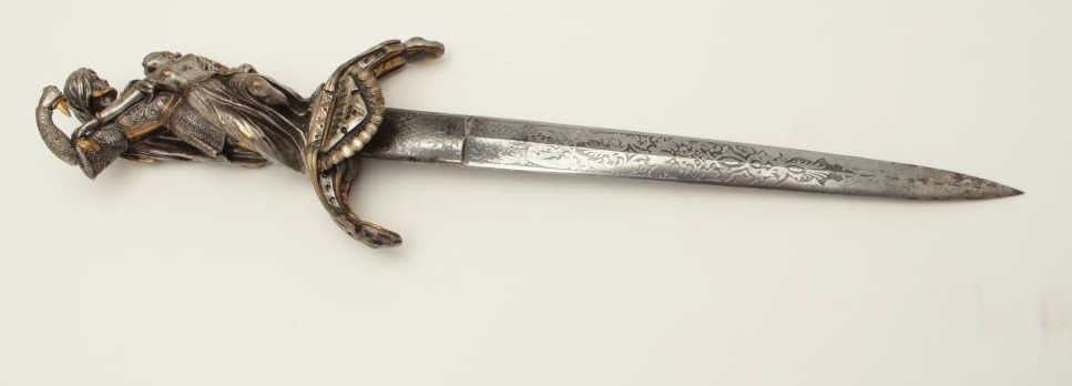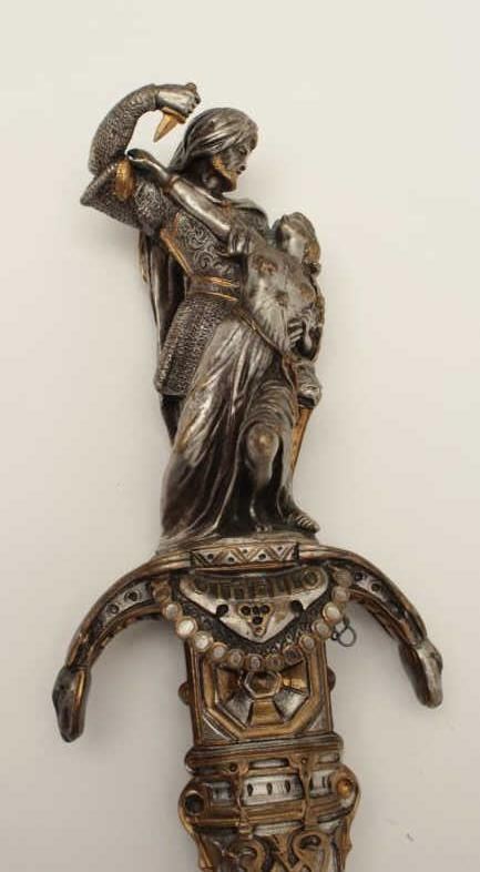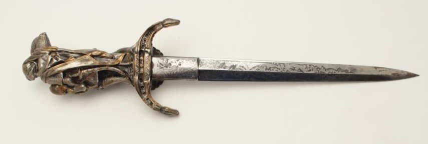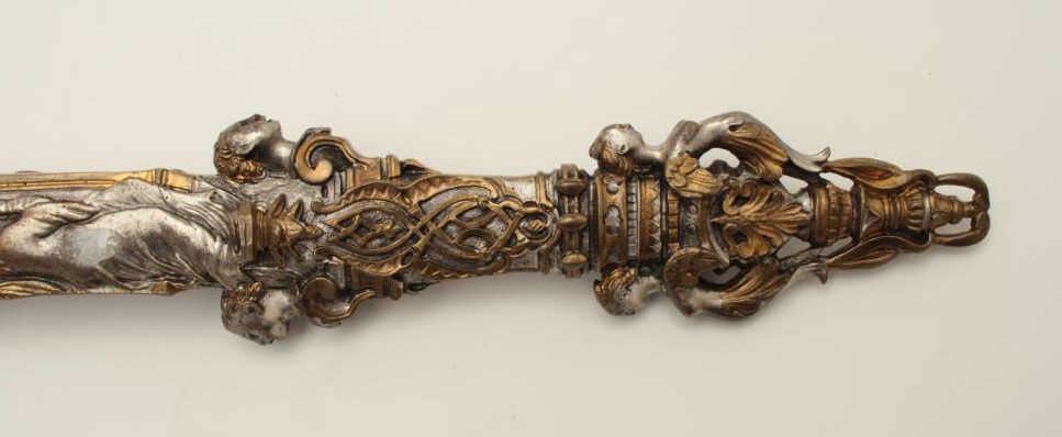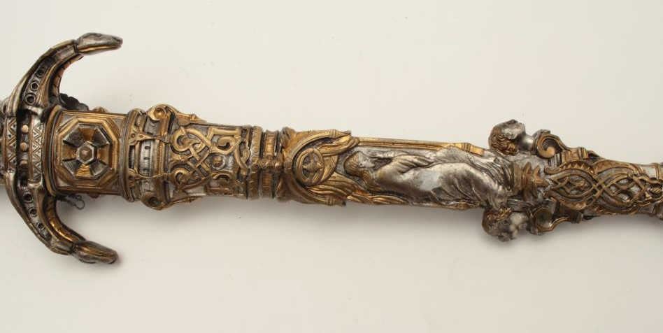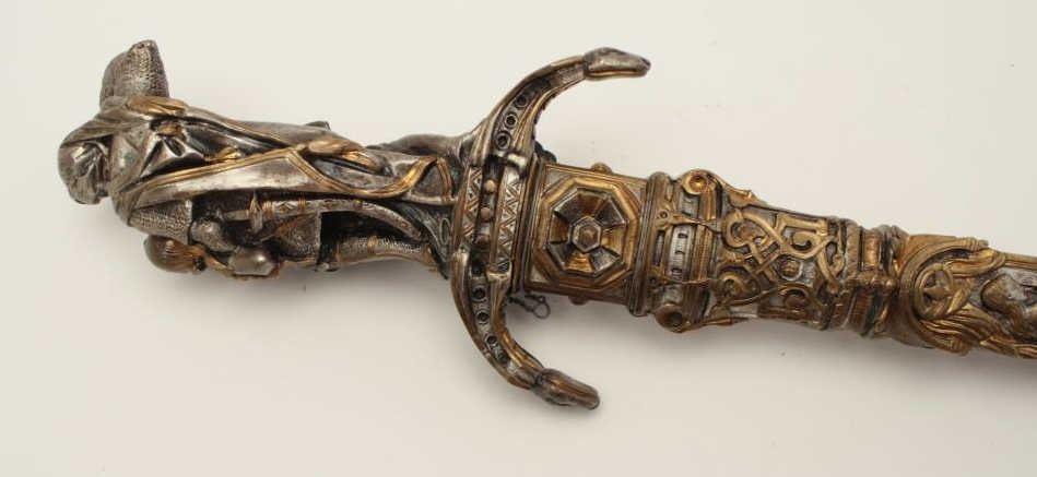 Lot 162 Exhibition quality mid-Victorian era cast bronze figural dagger with rich silver and gold gilt. Th
