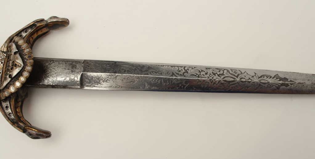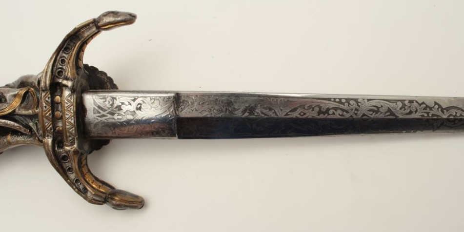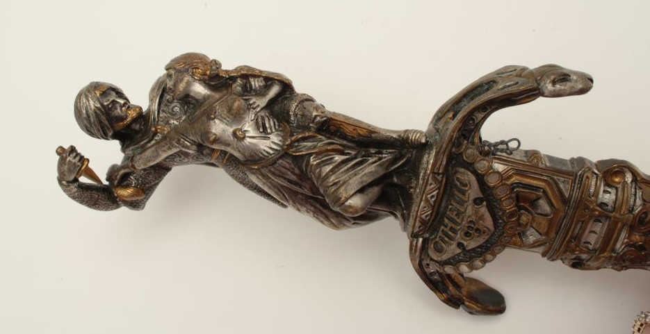 Exhibition quality mid-Victorian era cast bronze figural dagger with rich silver and gold gilt. The hilt shows human figures of Othello slaying Dismiralda inspired from the works of Shakespeare and made in an archaicform with fine workmanship throughout. Measures 21 ½” from tip to top of hilt with 12” etched blade of high quality with spear point and reinforced construction (A serious weapon). The Victorian era saw a re-emergence of arms and armour both for decoration and parade use. Would there be a better gift for an actor or fan of Shakespear’s epic play? Est.: $2500-$5000