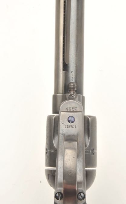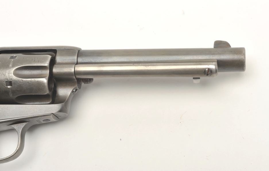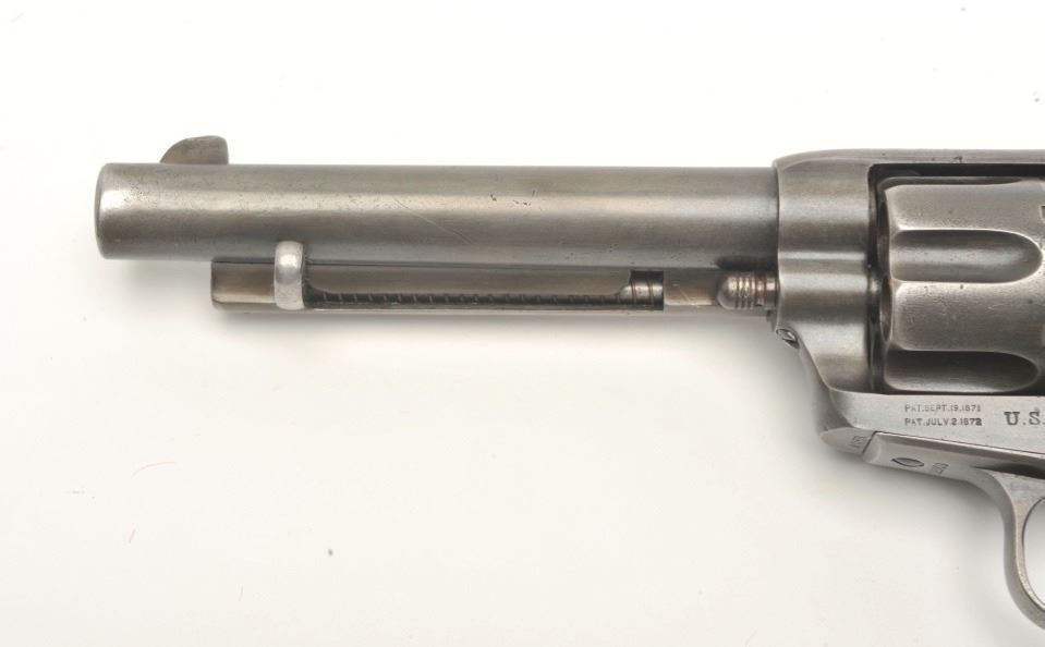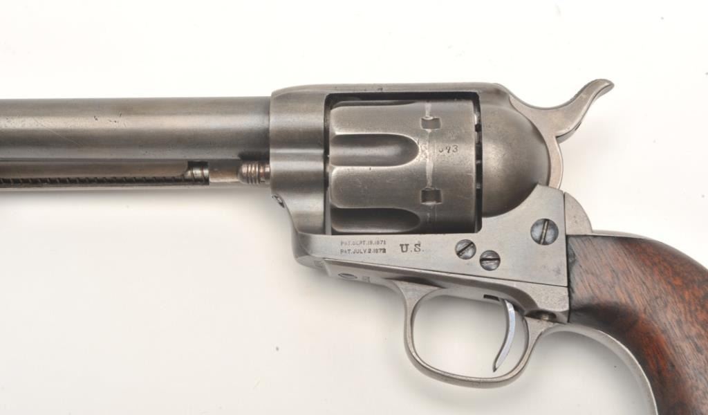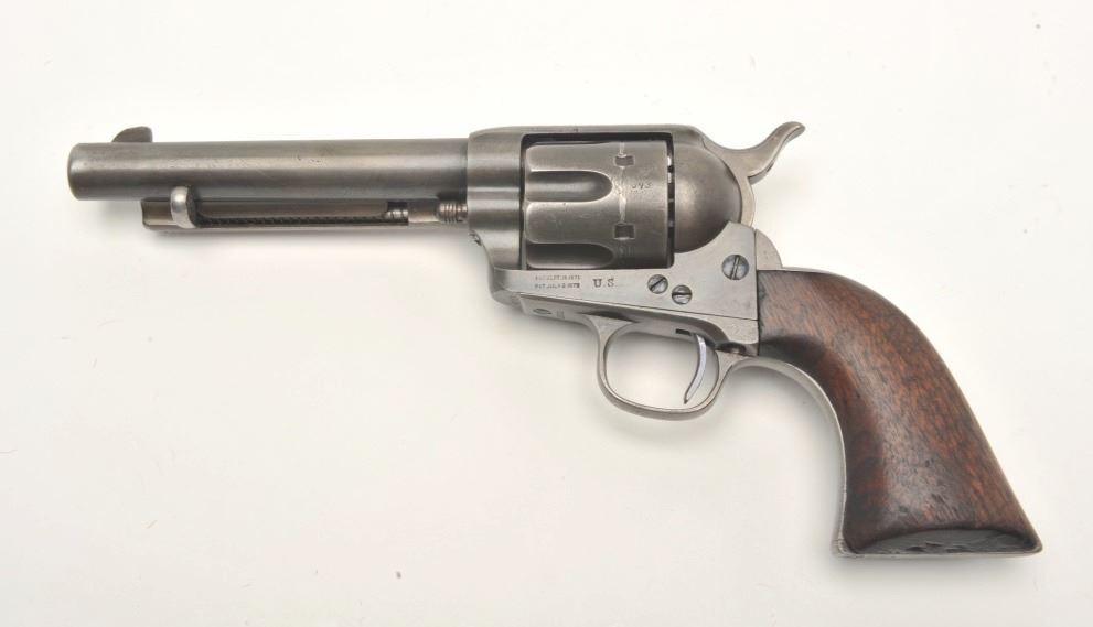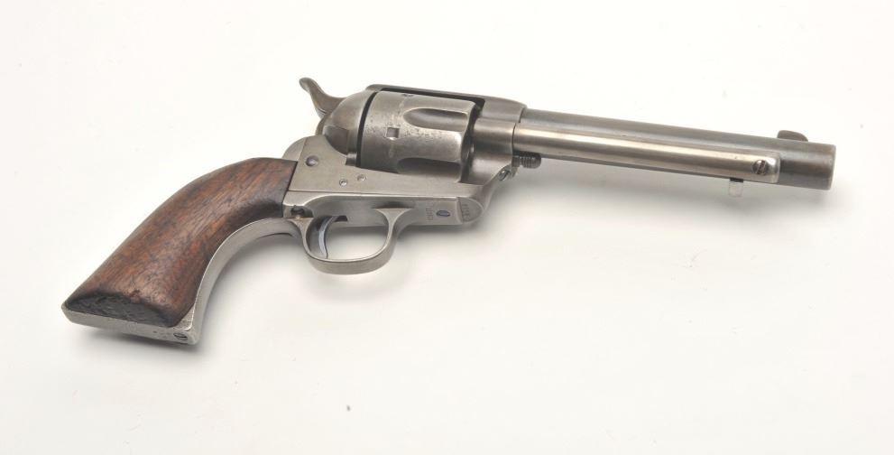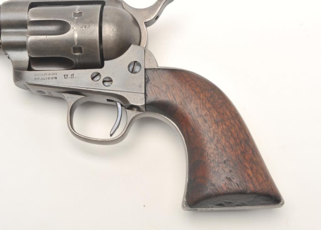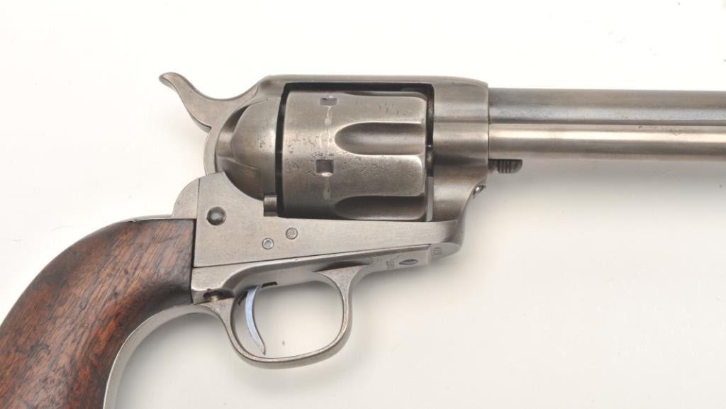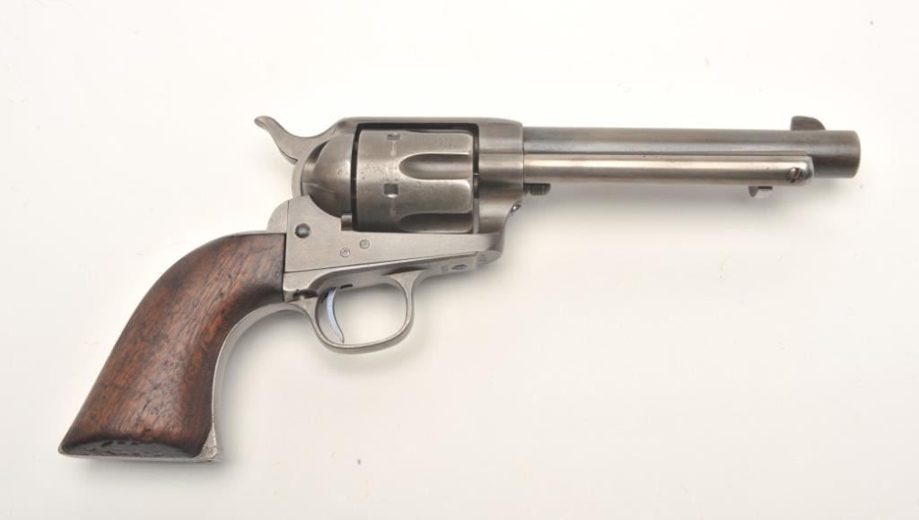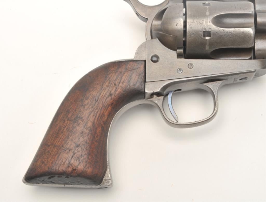 Colt U.S. Artillery Single Action revolver, frame S/N 4957 (Custer range), 5.5” barrel, wood grips, in overall good to very good condition displaying an even grey patina to metal surfaces, crisp action, good markings,overall good grips with an old chip off the front right toe and some old hammering to the bottom of the grips. According to Kopec and Fenn’s “Colt Cavalry & Artillery Revolvers . . . a Continuing Study”, this serial numberfalls within the prime Lot 5 (S/Ns 4500-5504), the majority of which were sent to the Seventh Cavalry at Fort Lincoln in June, 1874. Further, the Study states “Very few documented or positively-associatedSeventh Cavalry Colts are known. Those from Lot Five are serial numbers 4507, 4553, 4597, 5100, 5128 and 5147. Other Colt Army revolvers r4om Lot Five with strong, but less positive Seventh Cavalry-association, are4729, 4949, 4955, 5133, 5180, and 5416” (see page 261 of above-referenced work). Also noted on page 280, is a Table of Historically Associated Seventh Cavalry Revolvers including S/N 4955, with notation