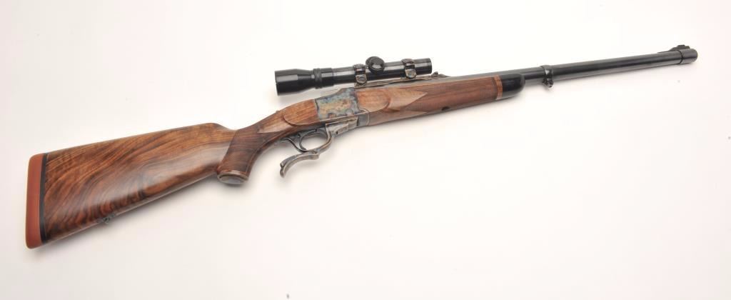 Ruger #1 rifle custom re-built on special order for Robert Petersen (the publisher of “Guns & Ammo”) by a master gunsmith. Re-chambered to .450-400 3 ¼” big game express caliber. Finely made custom checkered burl walnut stock with raised Monte Carlo cheek piece and select exotic wood fore end cap. Finely rust blued with color casehardened frame and trim (Also sight rail and scope mounts casehardened). KahlesAustria 2x scope on thumb release mounts. Flip up rear sight with white bead front sight. Measures 41” overall with a 24” heavy round barrel. Measures 14 ½” to the end of pad from trigger. Fine to excellent condition as recondition. This rifle was expensive to build and the quality is excellent. (Modern) Est.: $3,000-$6,000