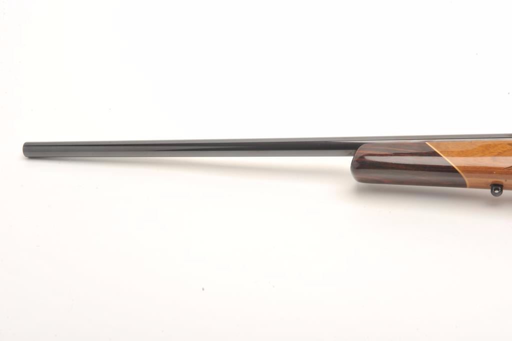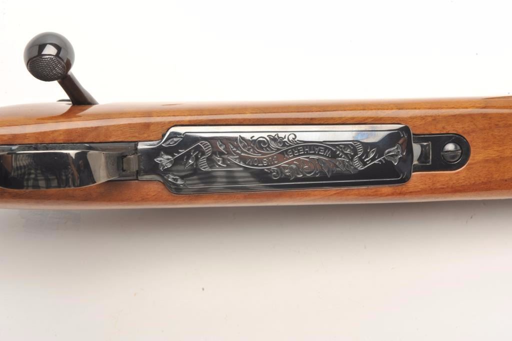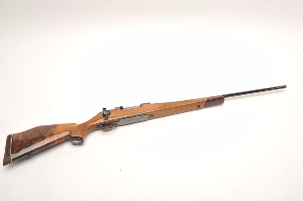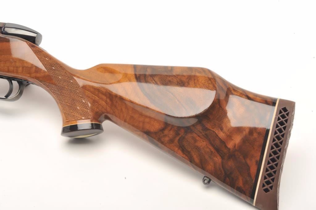 Weatherby custom shop Mark V bolt action rifle in .30-06 caliber, S/N H101615 with Redfield scope mounts on factory tap holes. Exceptional burl stock with hand checkering along with exotic wood fore end cap andpistol grip cap. Measures 44 ½” overall with a 24” barrel weighing 7.9lbs. In fine to excellent slightly used condition 96%-98% overall. An exceptional and high grade Weatherby. (Modern) Est.: $1250-$2500