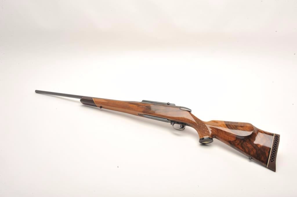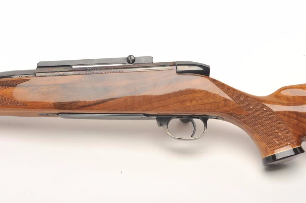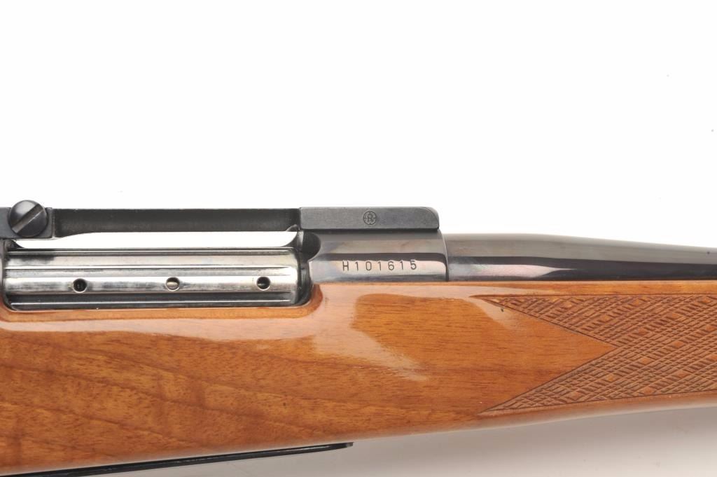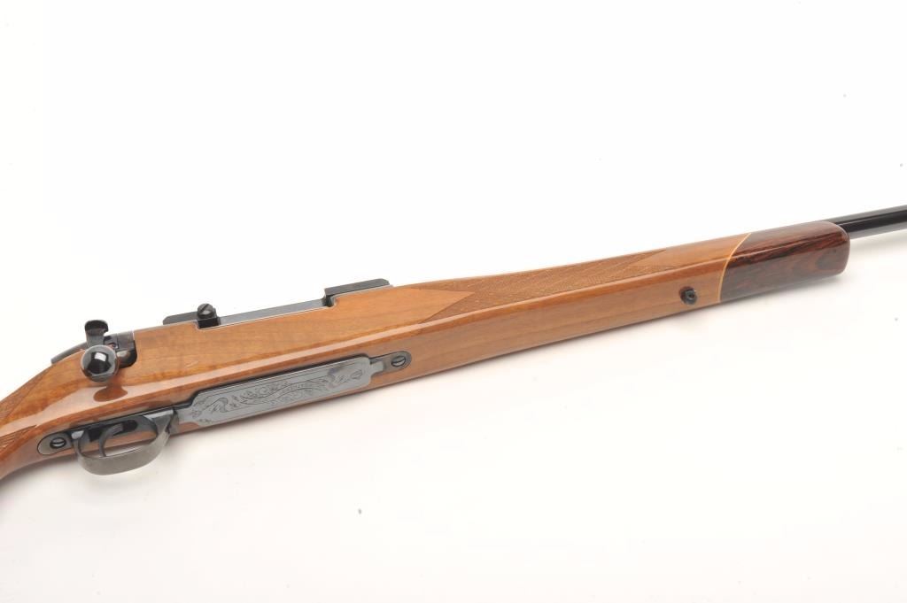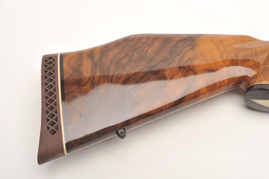 Weatherby custom shop Mark V bolt action rifle in .30-06 caliber, S/N H101615 with Redfield scope mounts on factory tap holes. Exceptional burl stock with hand checkering along with exotic wood fore end cap andpistol grip cap. Measures 44 ½” overall with a 24” barrel weighing 7.9lbs. In fine to excellent slightly used condition 96%-98% overall. An exceptional and high grade Weatherby. (Modern) Est.: $1250-$2500