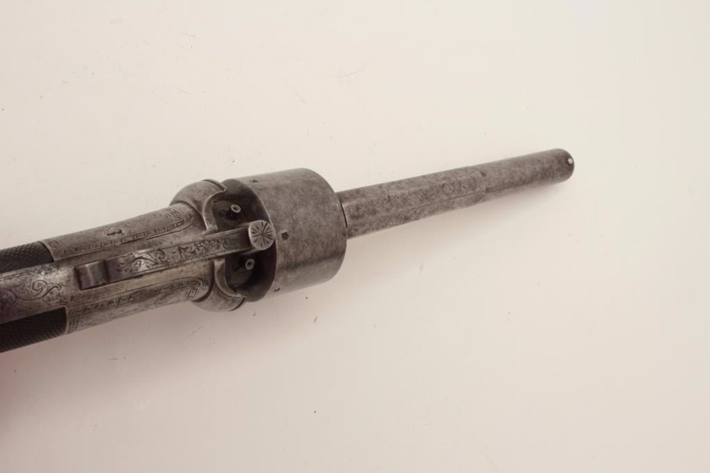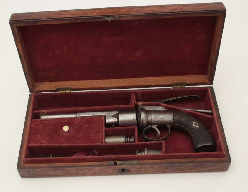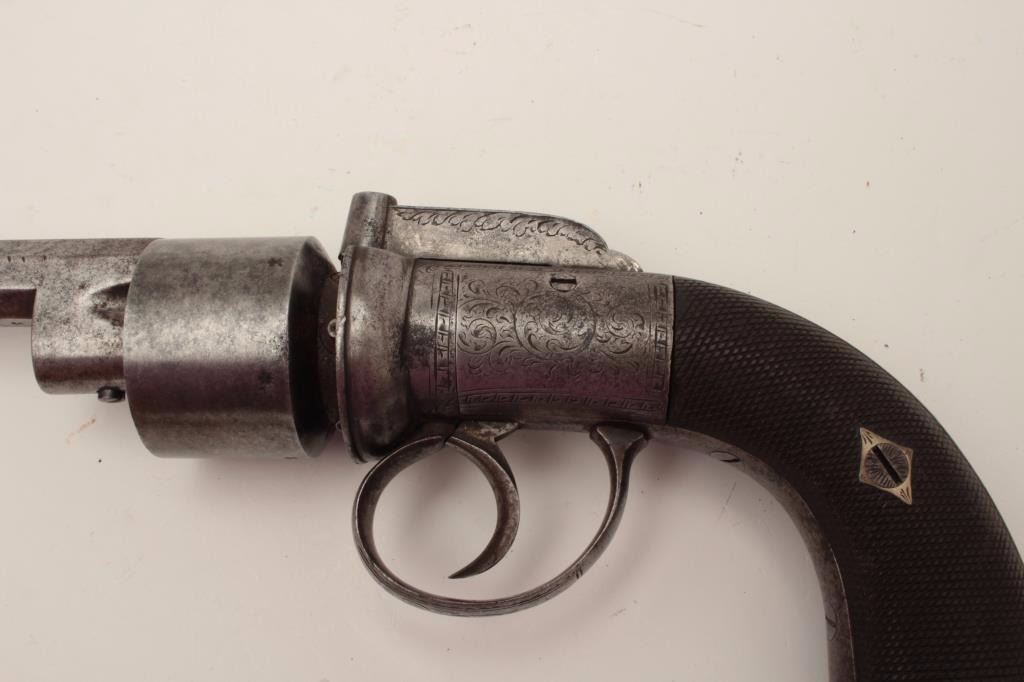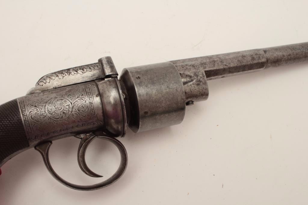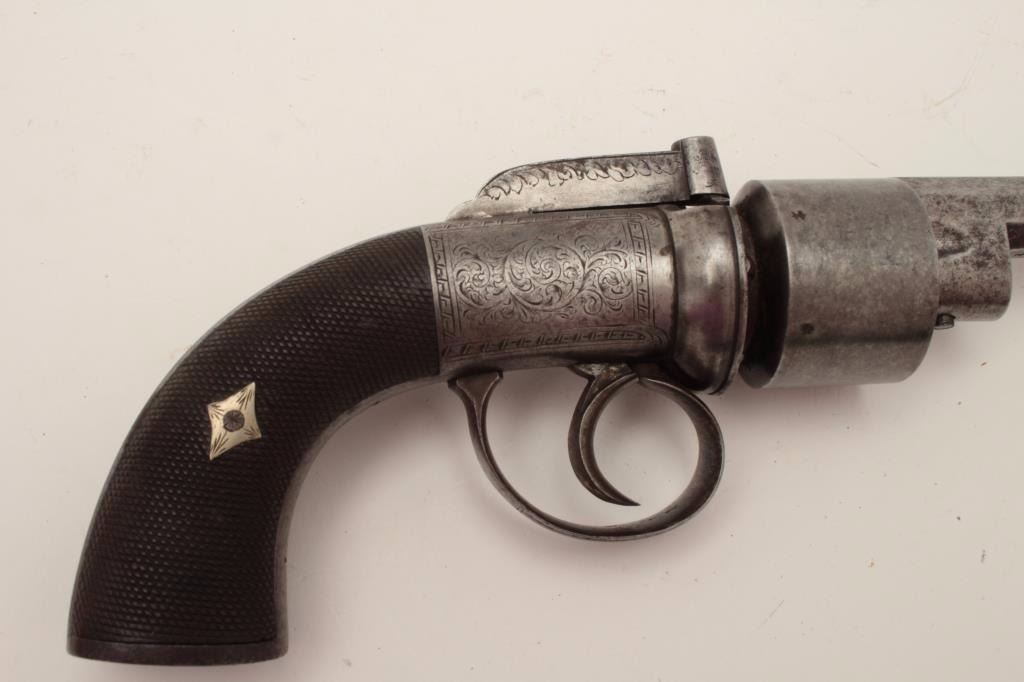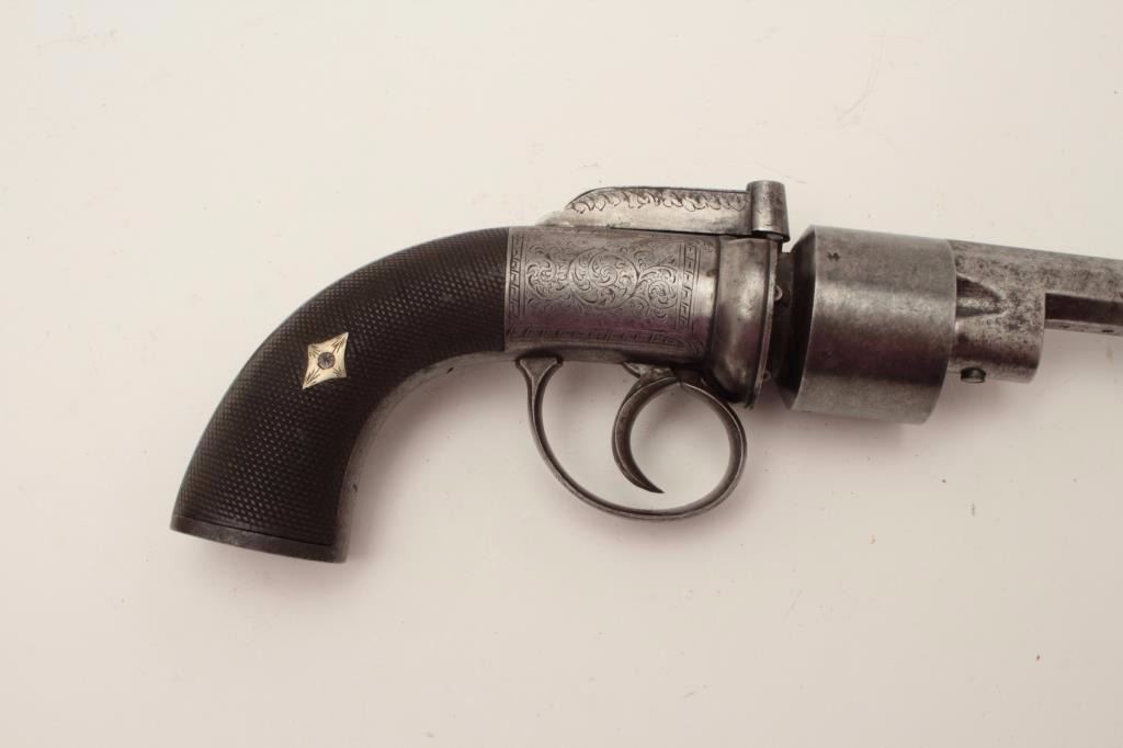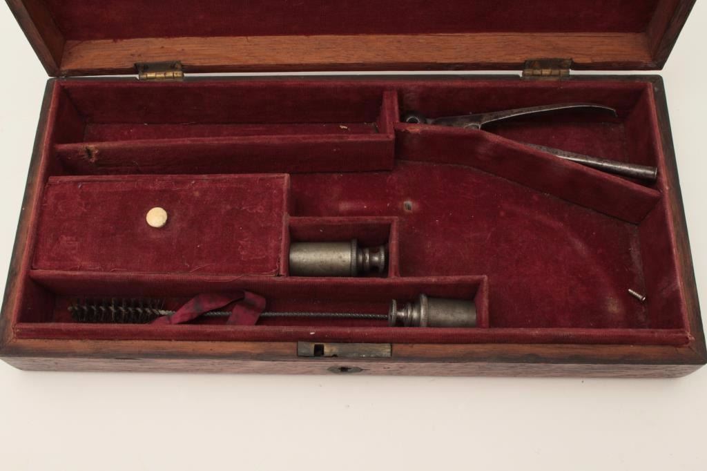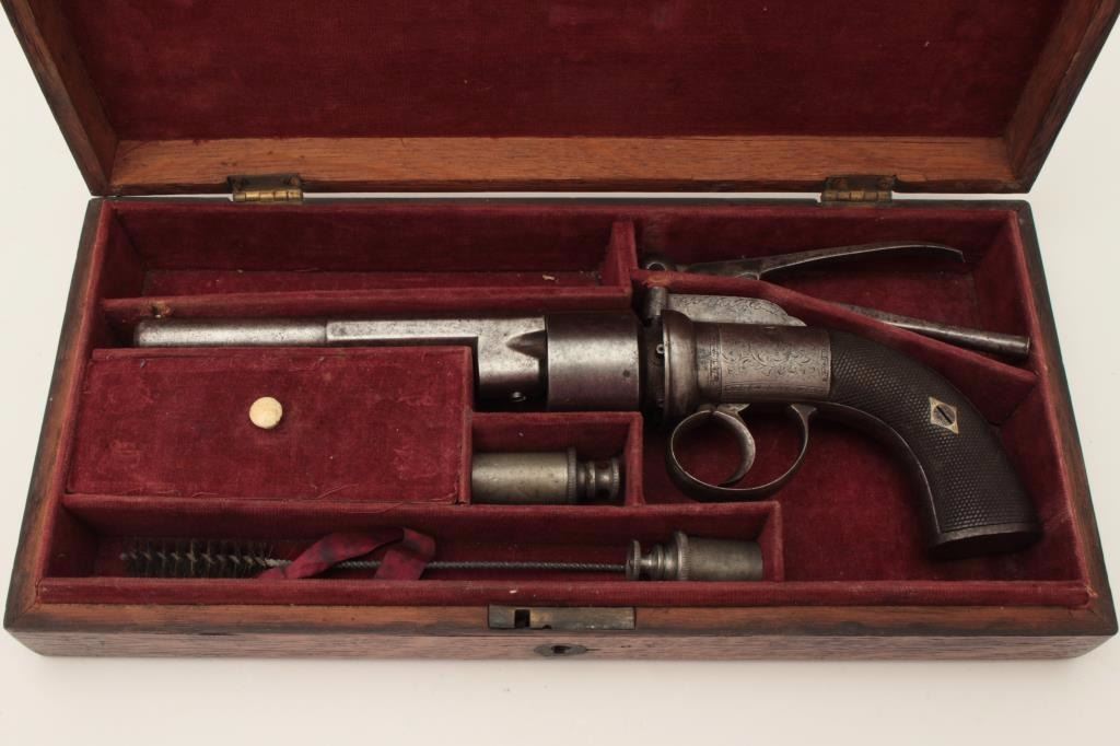 Lot 174 English Transition revolver, wood cased with accessories; good condition. Spans the gap between p