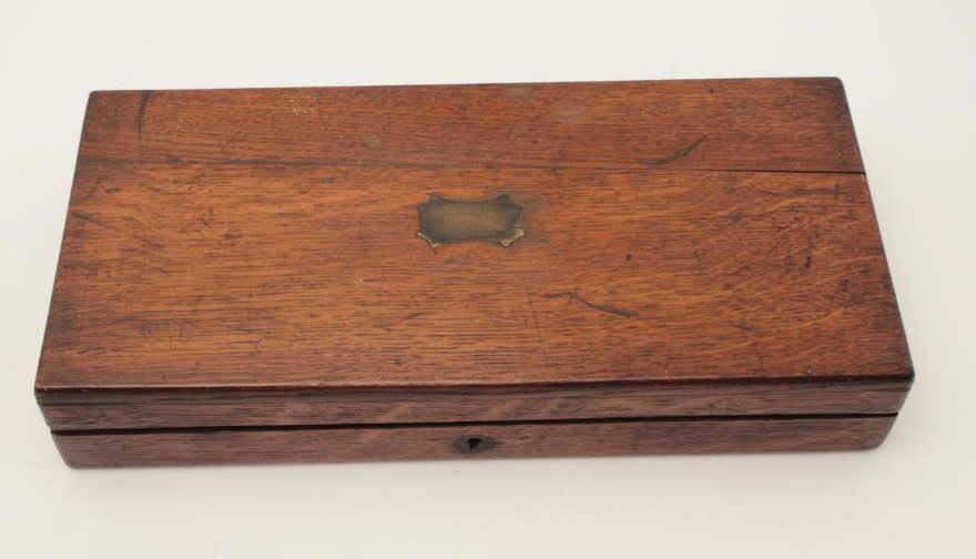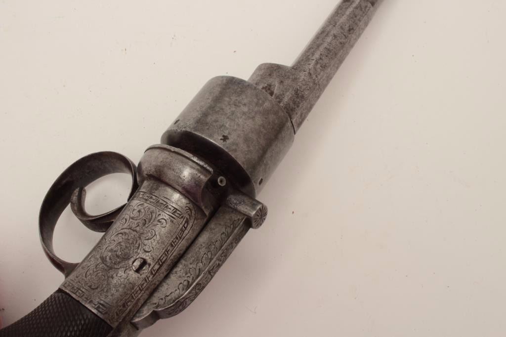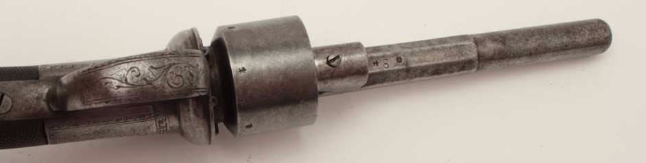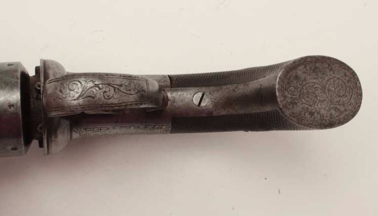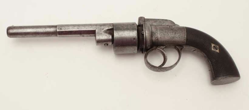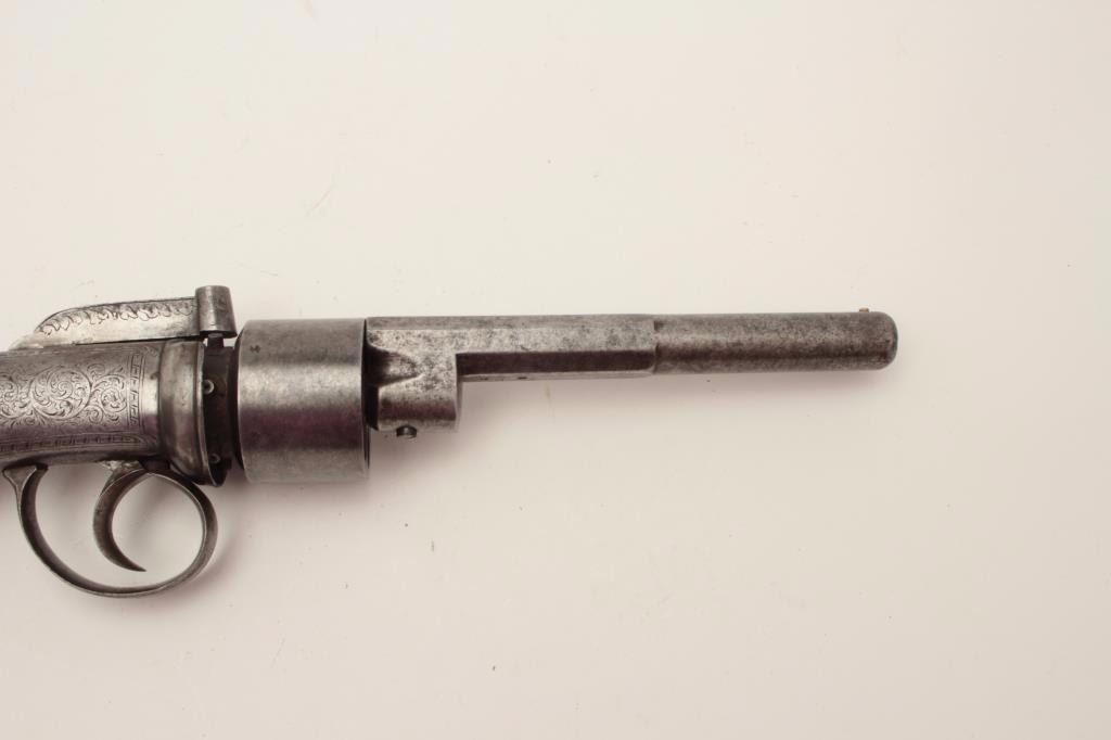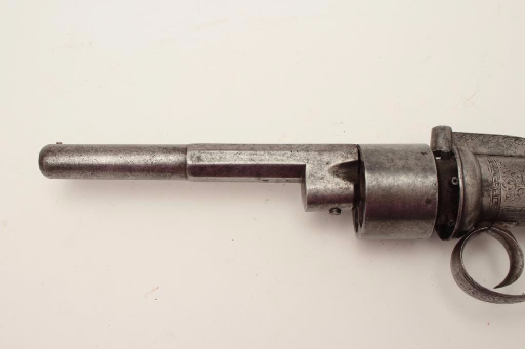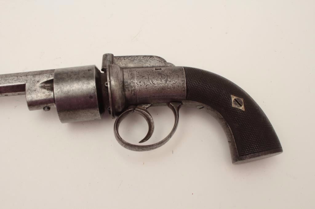 English Transition revolver, wood cased with accessories; good condition. Spans the gap between pepperbox and traditional Adams and Dean-style revolvers. (Antique). Est.: $1,000-$2,000.