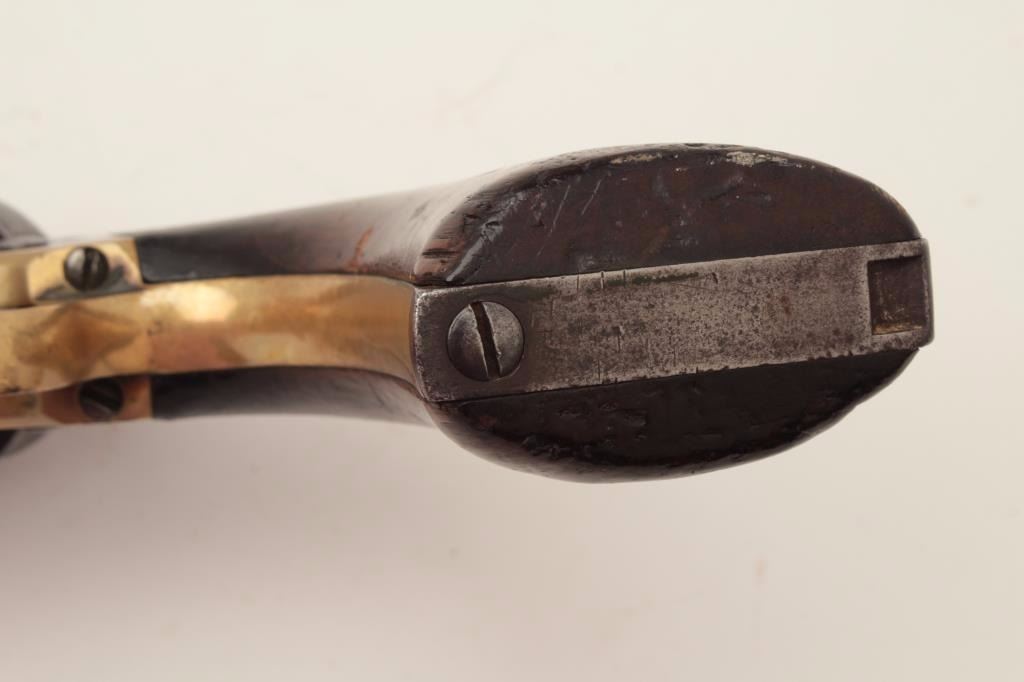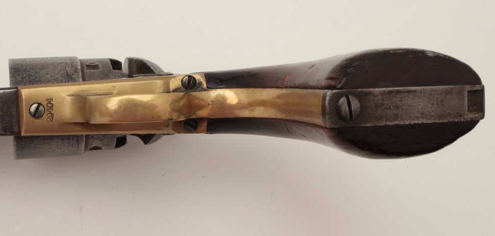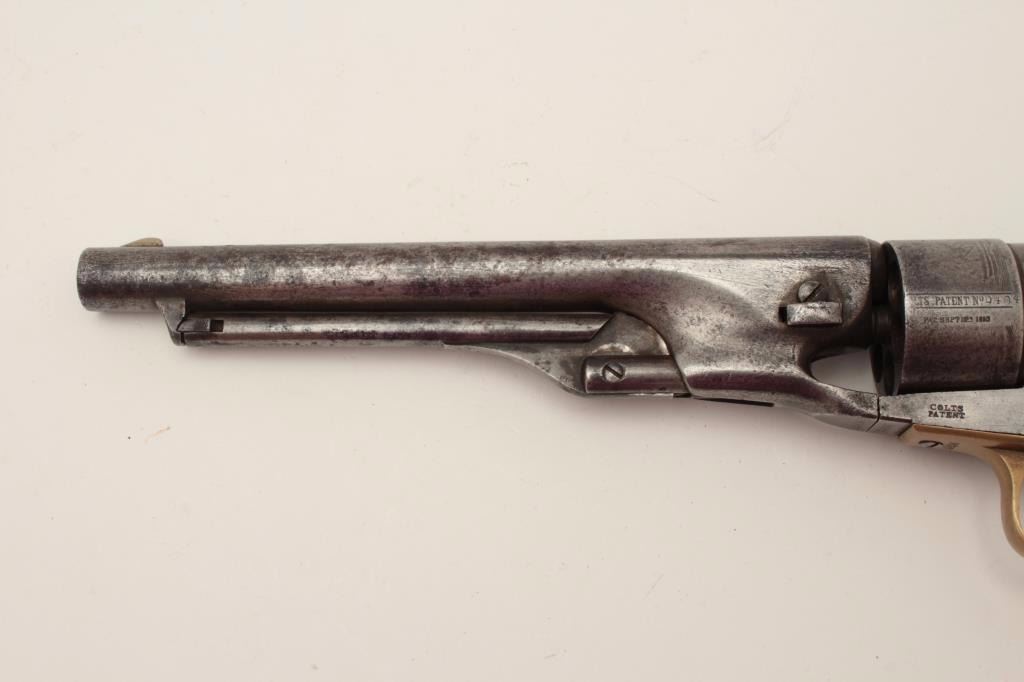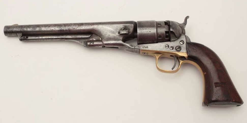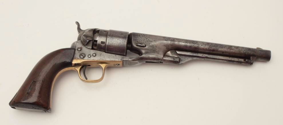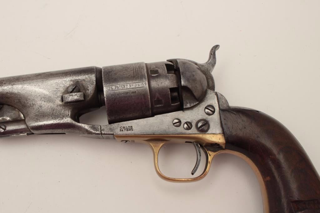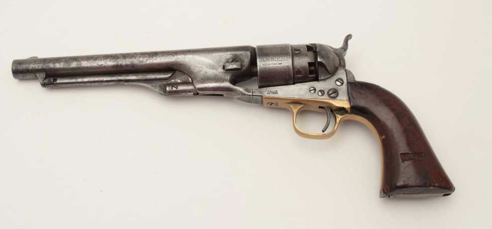 Colt Model 1860 Army 4-screw percussion revolver, .44 caliber, 8” barrel, S/N 29404, matching visible numbers including the wedge; grips have carved owner’s initials where inspections may have been. (Antique). Est.: $900-$1,800.